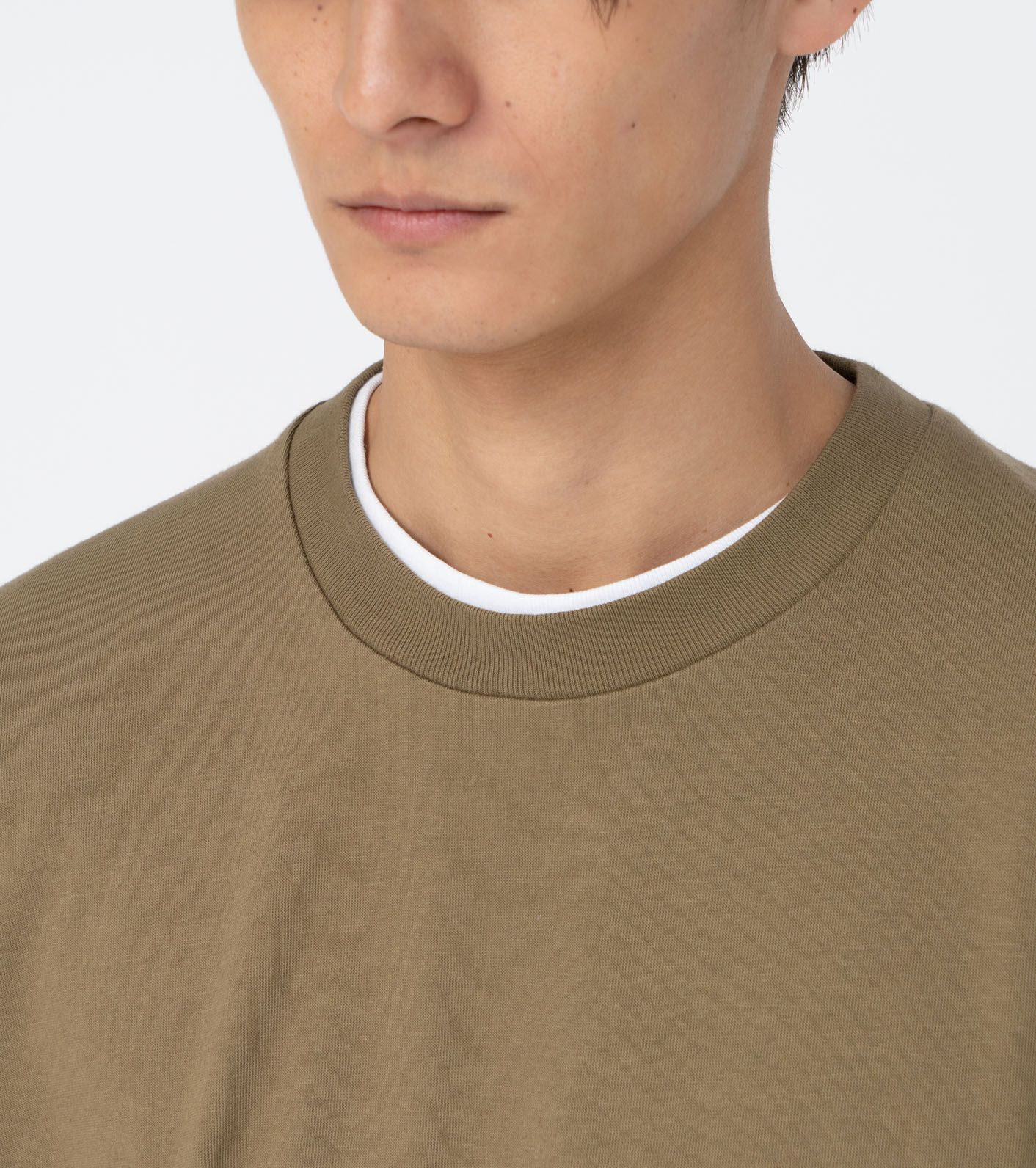 COOLMAX® EcoMade ALL SEASON Jersey 소재의 티. 코튼과 같은 내추럴한 촉감이 특징입니다. 오른쪽 어깨에 브랜드 라벨이 있습니다. 어깨와 몸에 적당한 여유가 있는 편안한 핏