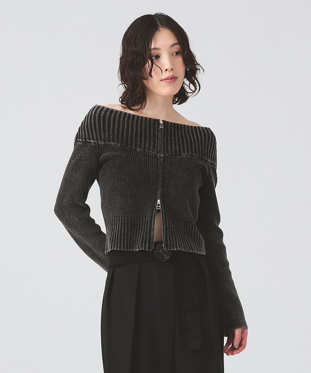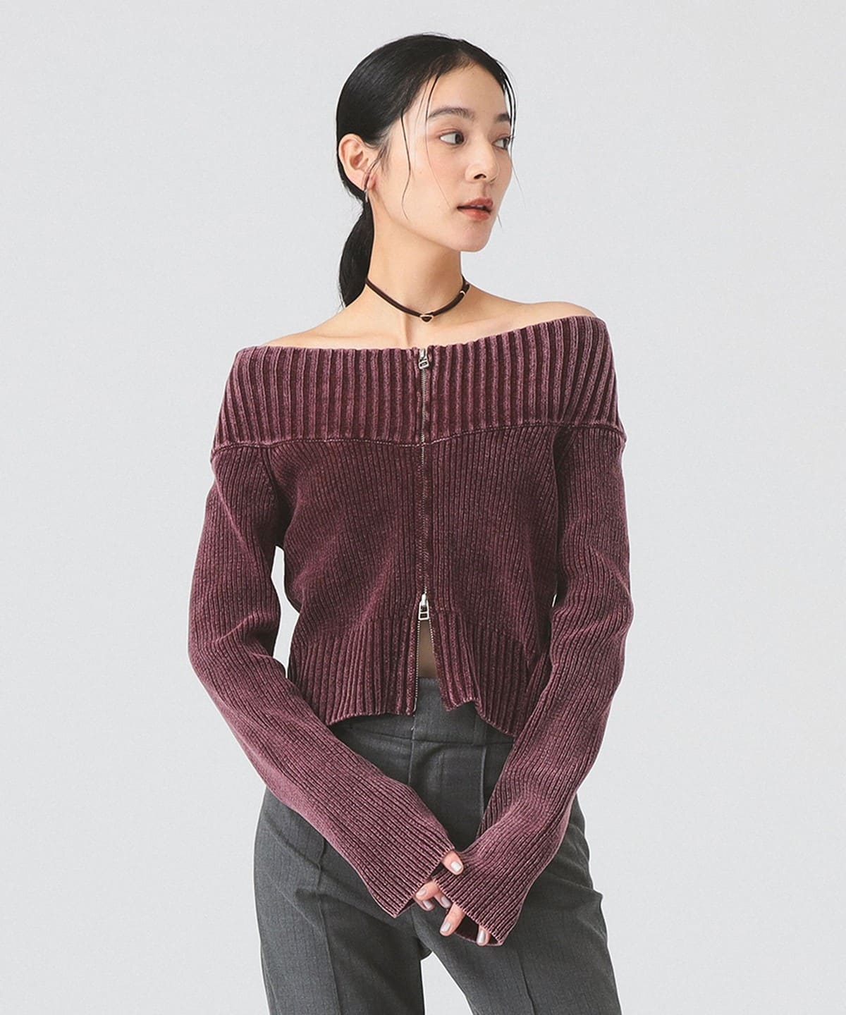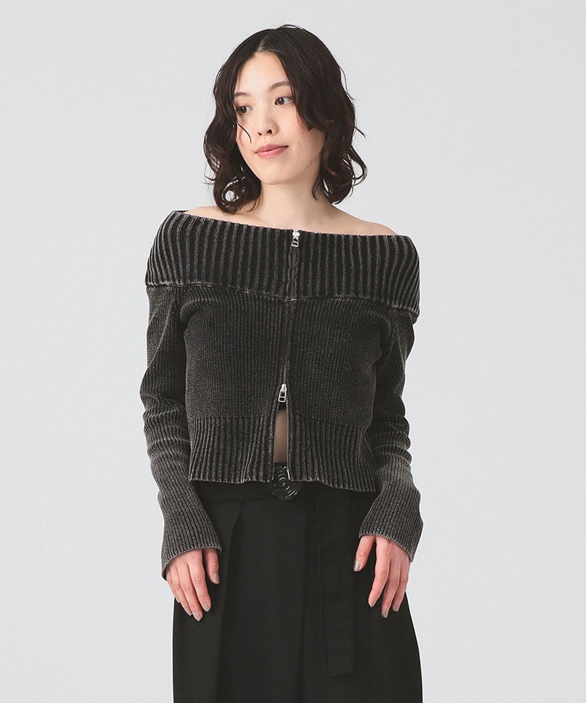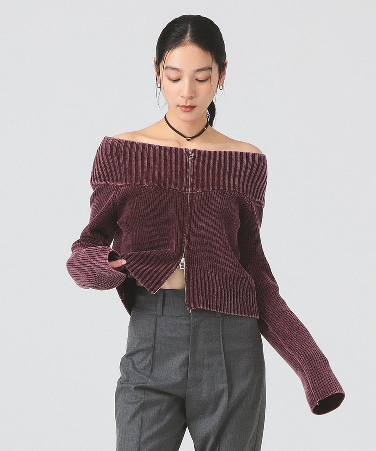 레이 빔즈 오프숄더 지퍼 니트 가디건