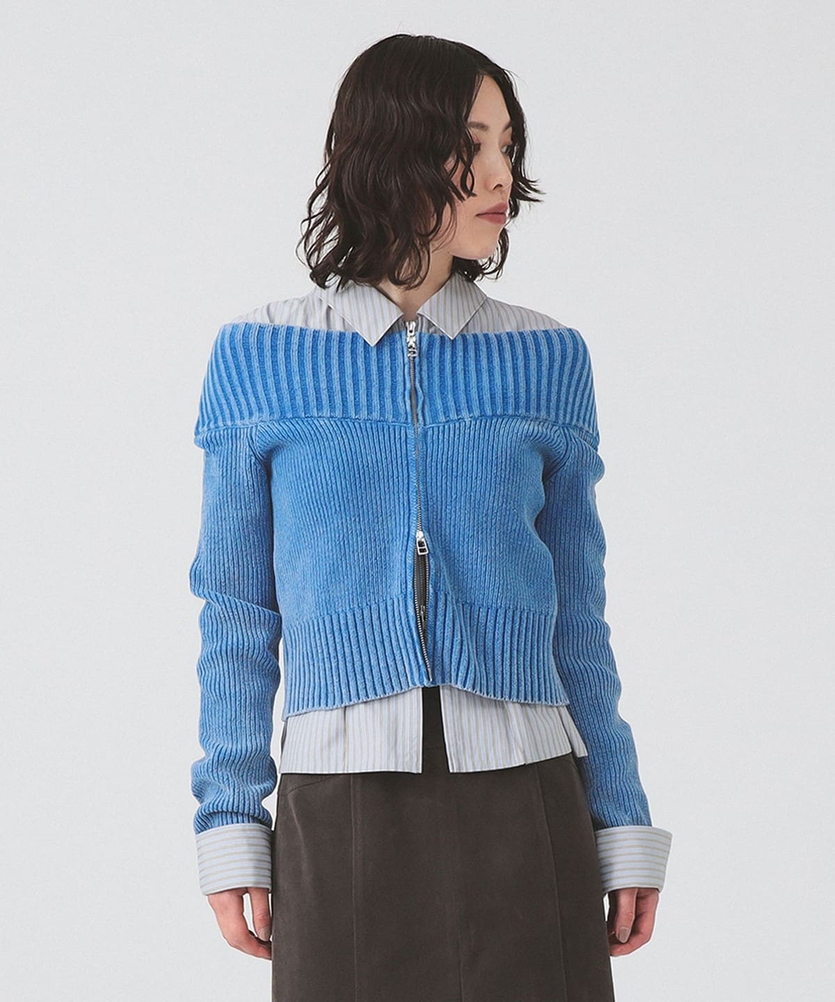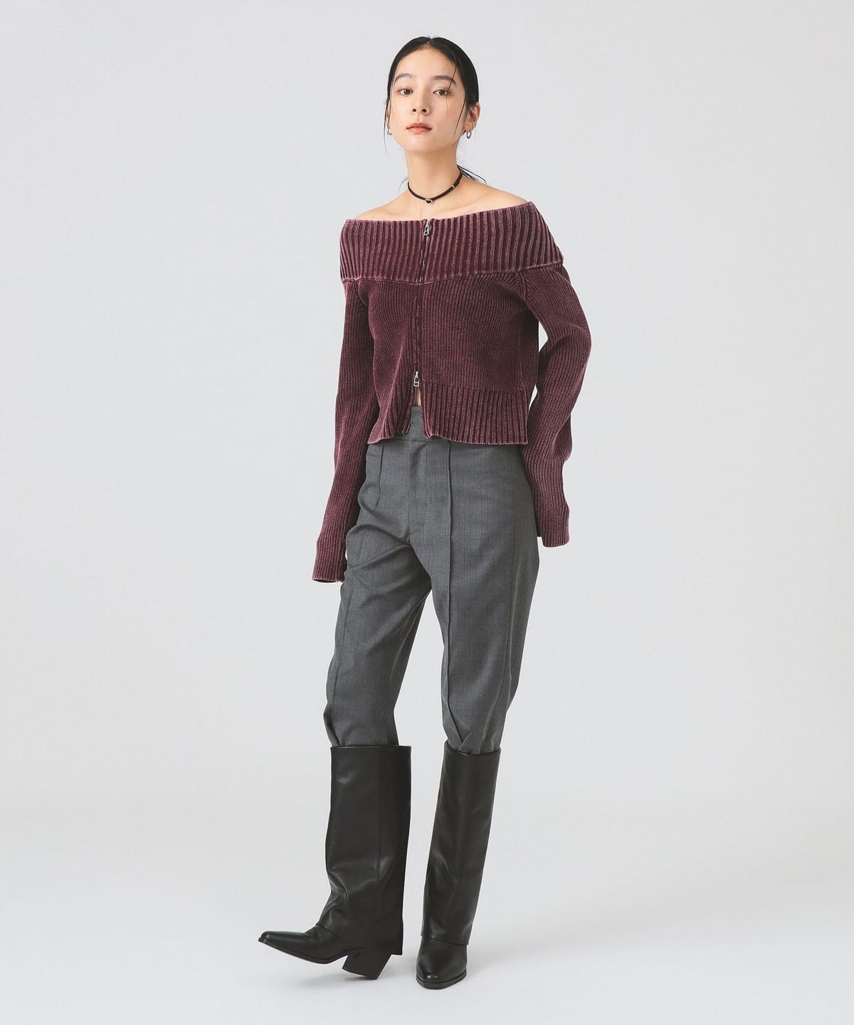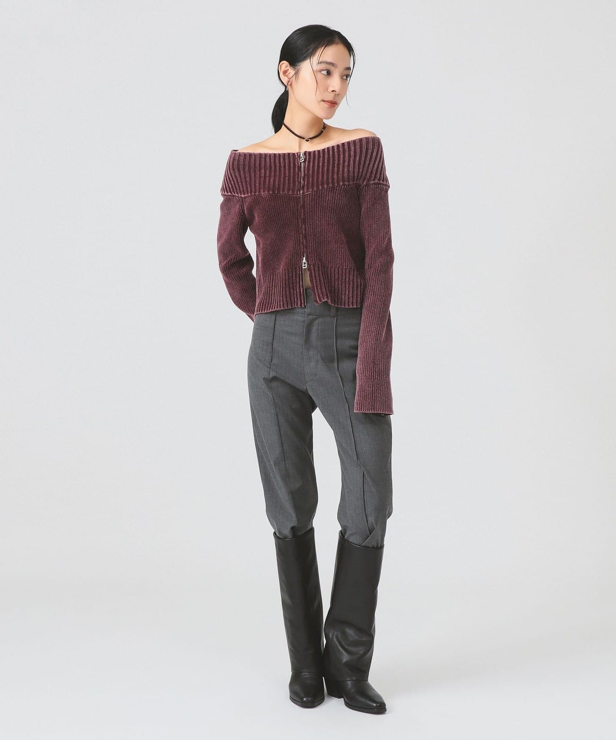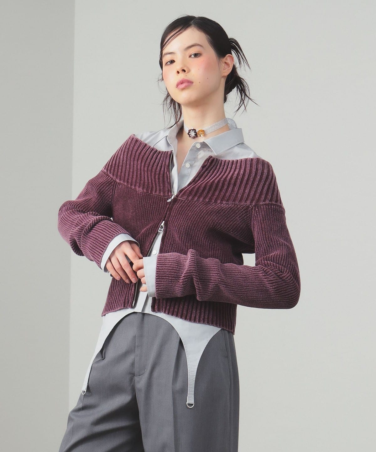 레이 빔즈 오프숄더 지퍼 니트 가디건