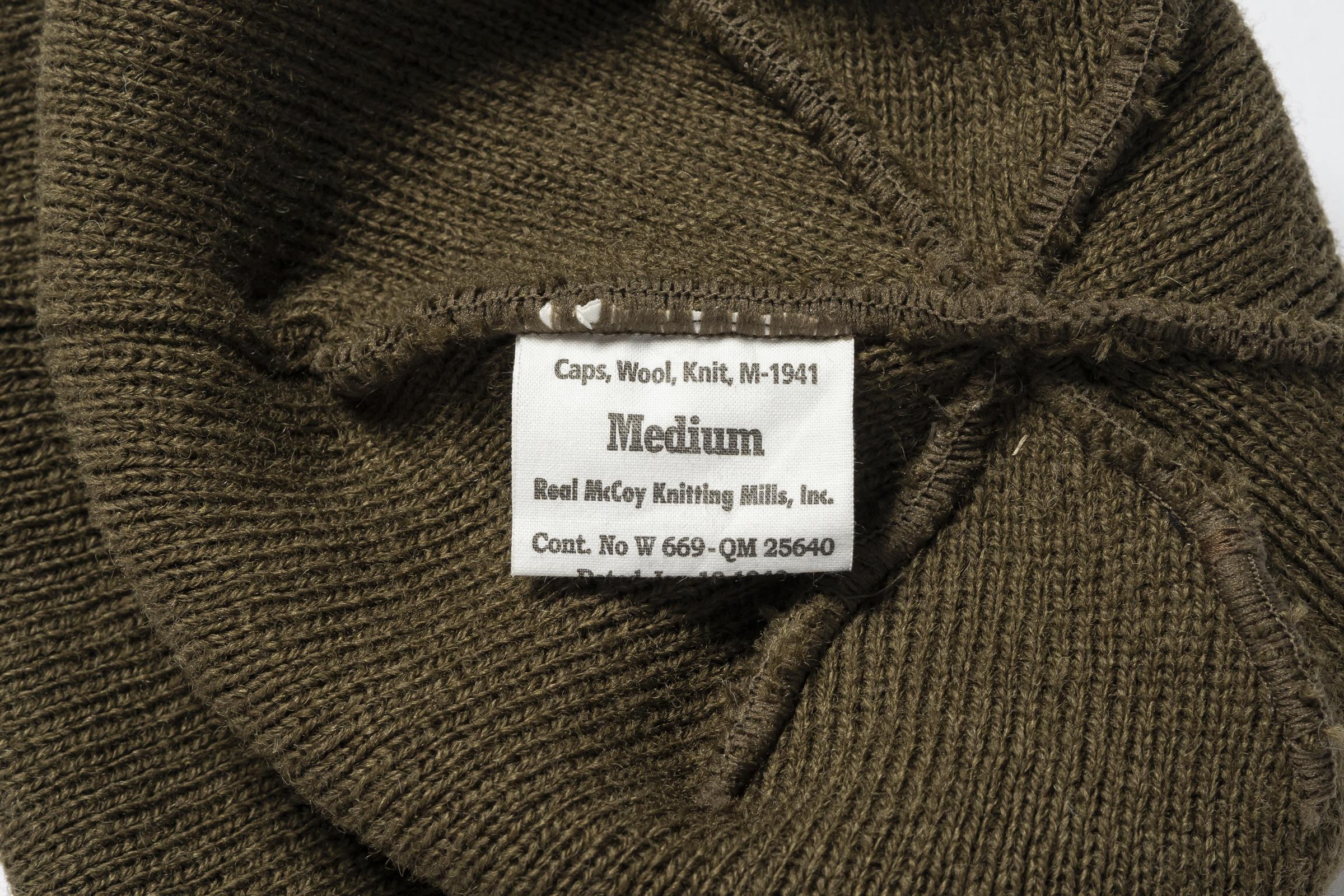 1941년 M1 헬멧과 함께 미 육군이 채택한 바이저가 있는 울 니트 캡. 지프를 타는 많은 미군 병사들이 추위로부터 보호하기 위해 헬멧 아래에 착용했기 때문에 지프 모자라는 별명이 붙었습니다.