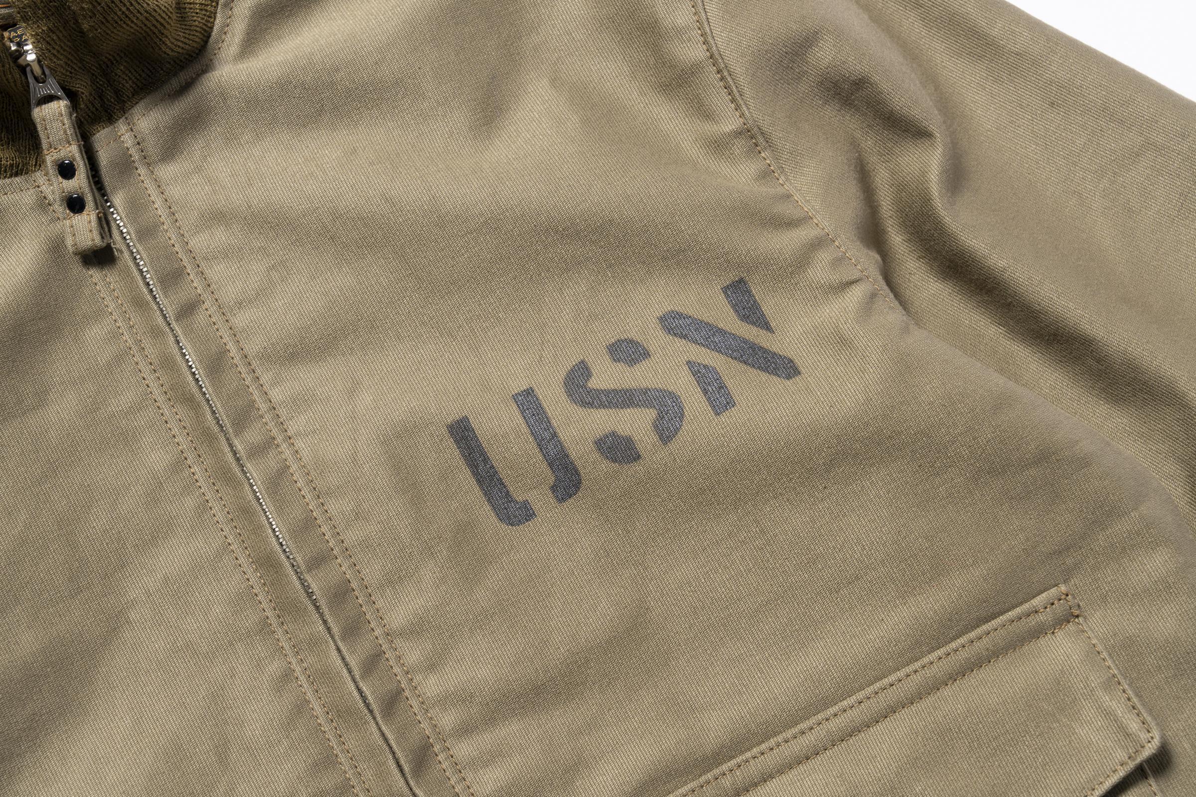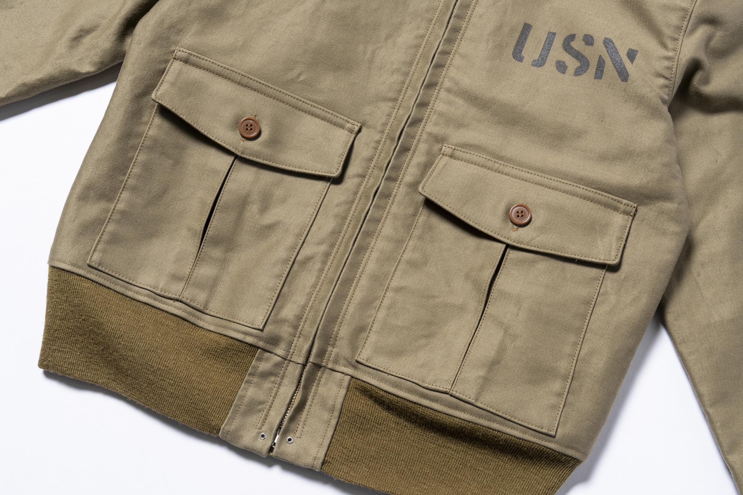이 플라이트 재킷은 해군이 1936년에 채택한 모델입니다. 앞판 양쪽 포켓에는 ‘센터 인버티드 플리츠’라 불리는 주름 디테일이 들어가 있으며, 봉제 사양 또한 매우 정교하고 공정 수가 많은 것이 특징입니다.
