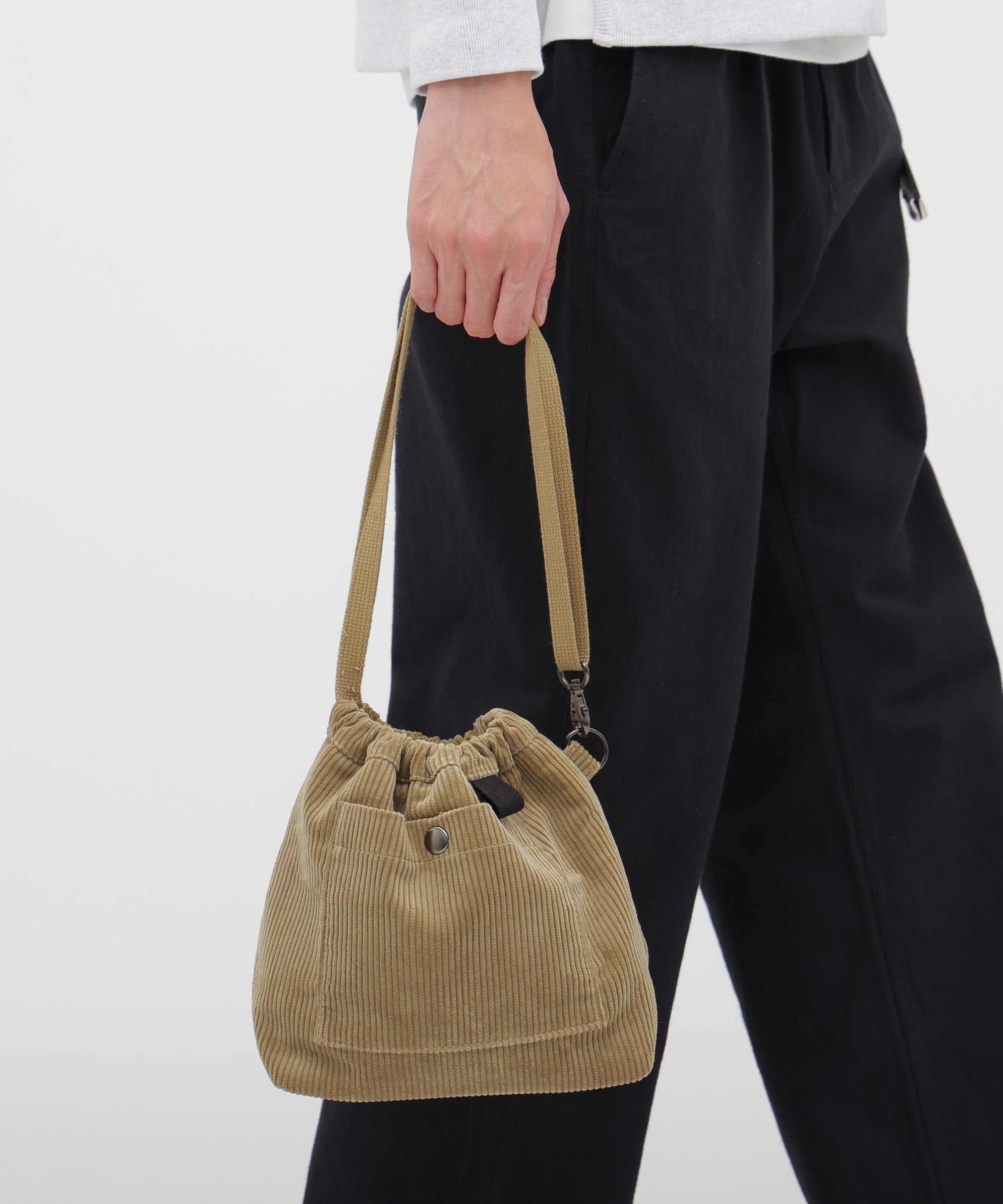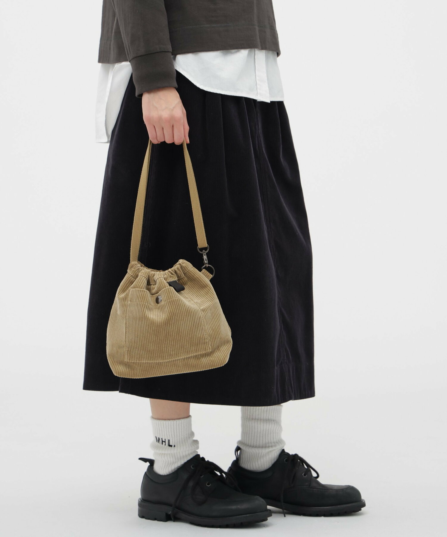 브랜드 설립 초기부터 이어져 온 MHL의 시그니처 영국산 코듀로이 를 사용한 백입니다. 고급스러운 광택과 굵은 골이 특징으로, 다른 소재로는 구현하기 어려운 독특한 질감을 자랑합니다.