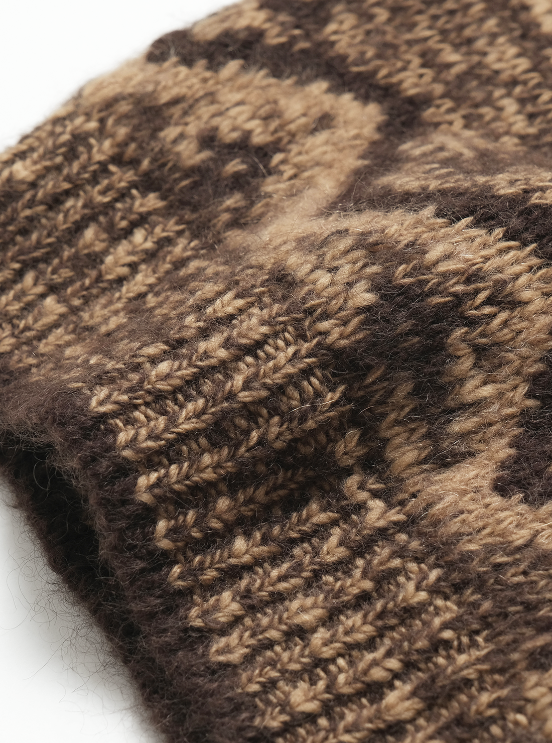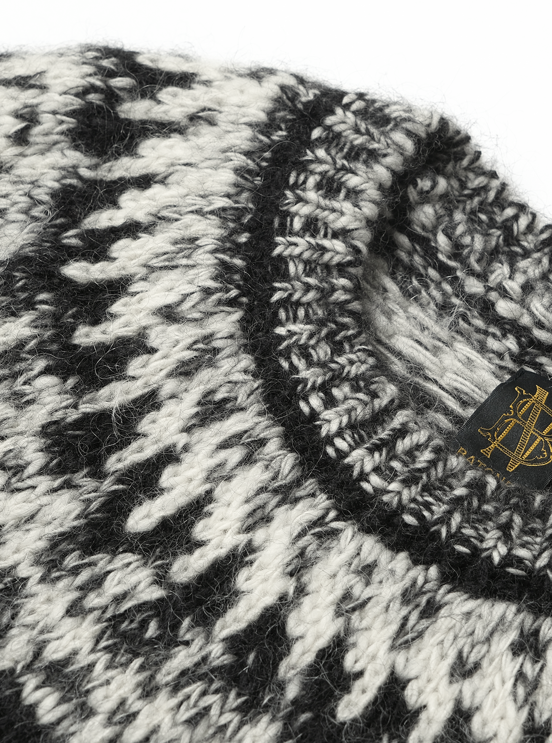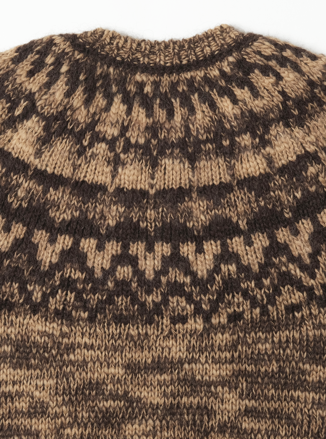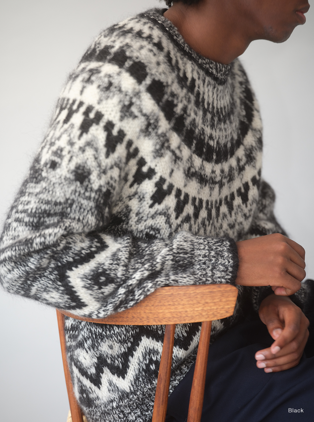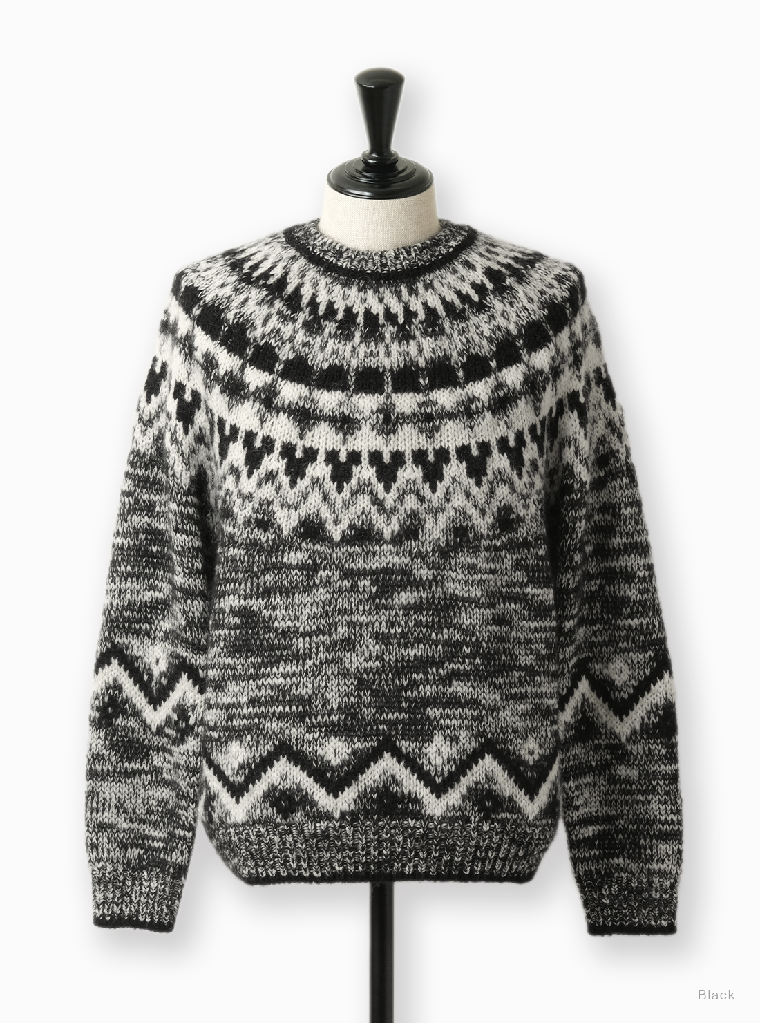 모헤어·알파카·울의 천연 섬유를 블렌드한 실에 굵은 슬럽얀 을 더해 편직한 니트입니다.