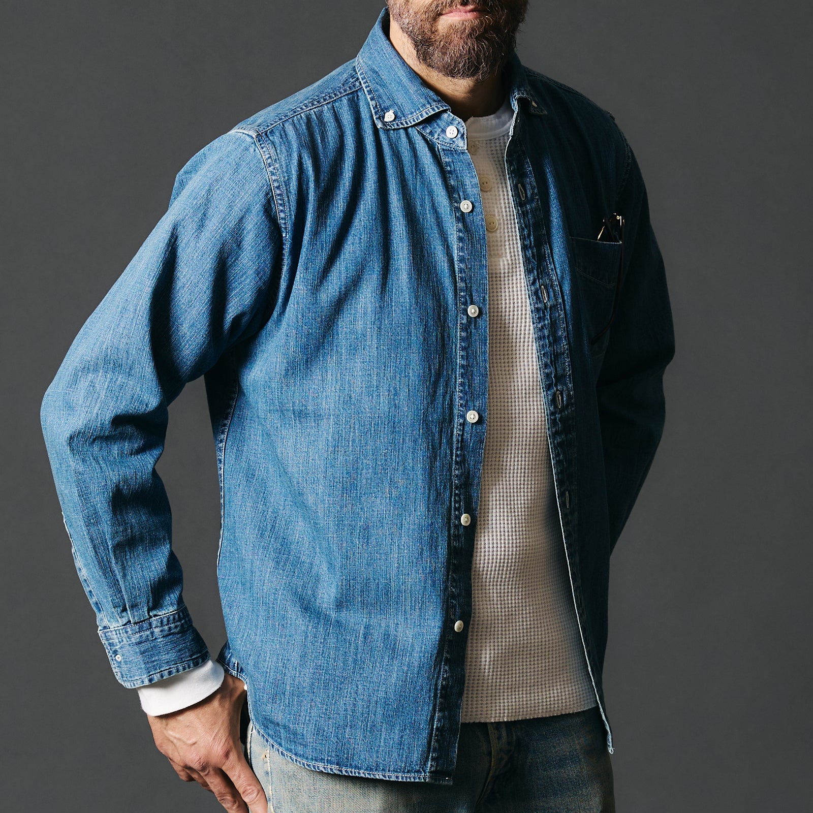 적당한 두께의 8oz 소재의 데님 셔츠. 목 주위를 깔끔하게 보이도록 와이드 스프레드로 디자인 되었습니다.
