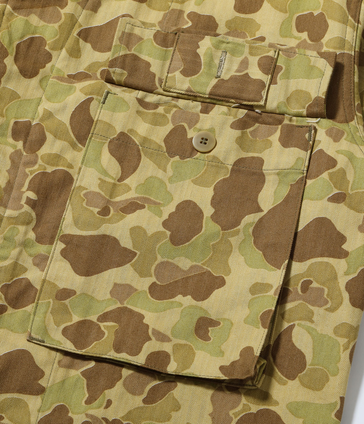 1942년 , 미 육군은 고밀도 헤링본 트윌(HBT) 소재에 양면 카모플라주 프린트 를 적용한 전투복을 개발하였습니다. 해당 자켓은 그 당시의 구조를 충실하게 복각한 제품으로, 전투복과 방독복 기능 을 모두 고려한 다양한 디테일이 살아 있는 유니크한 아이템입니다.