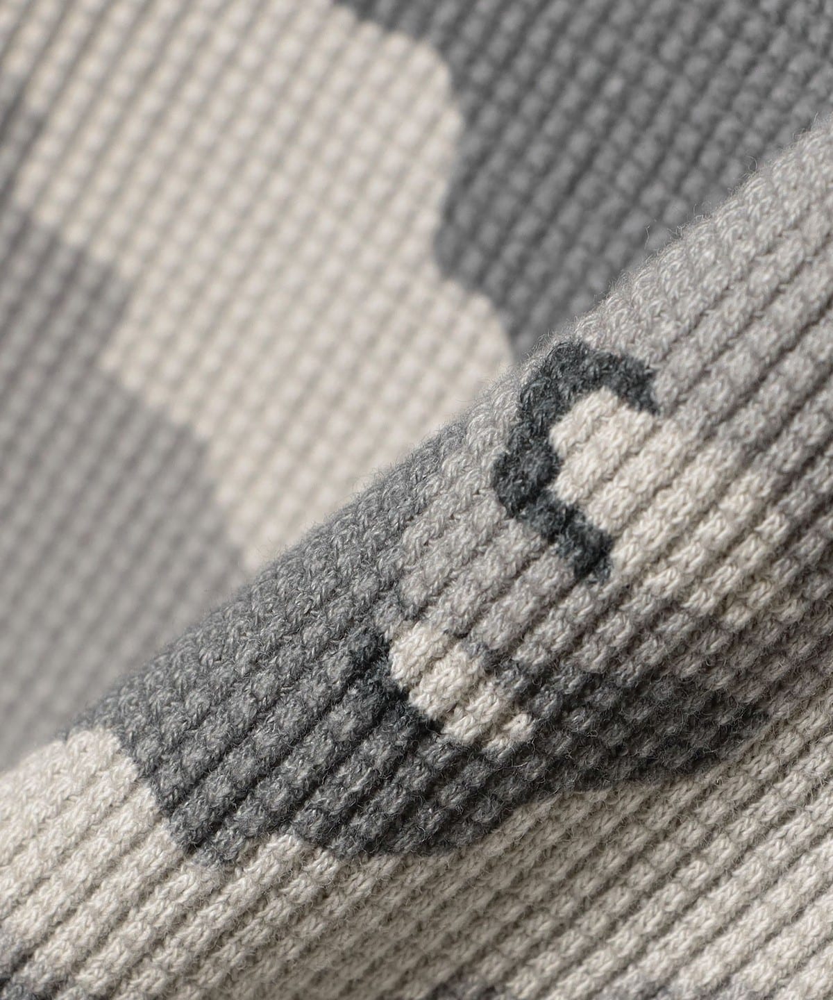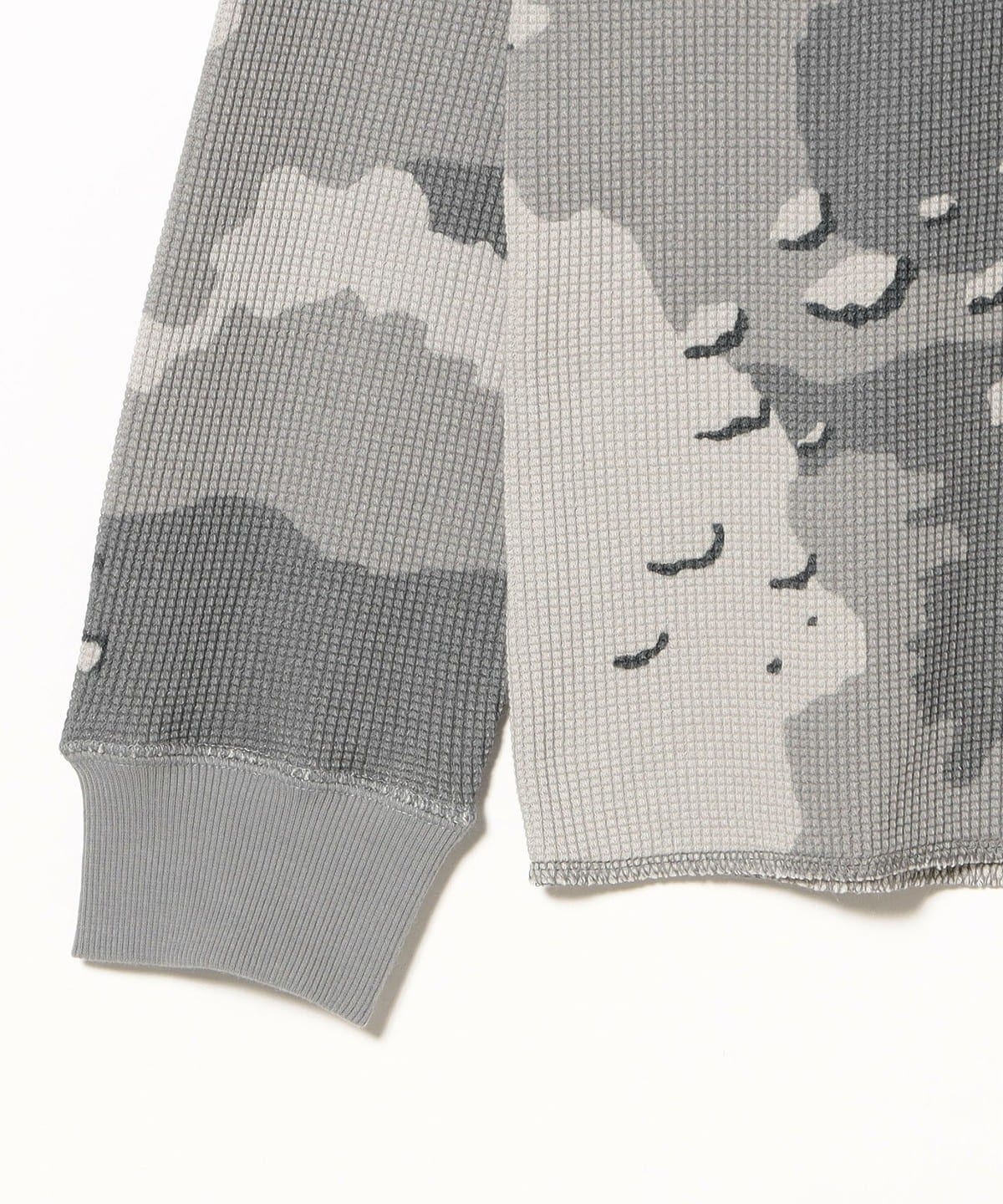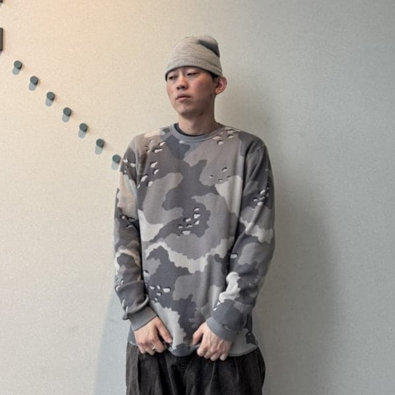 오랜 시간 착용해 자연스럽게 에이징된 듯한 질감과, 존재감 있는 카모플라주 올오버 패턴이 돋보이는 서멀 티셔츠입니다. 체형을 과도하게 드러내지 않으면서도 답답하지 않도록 적당한 여유를 준 실루엣입니다. 적당한 두께감의 스트레치 서멀 원단을 사용해 편안한 착용감을 제공합니다.
