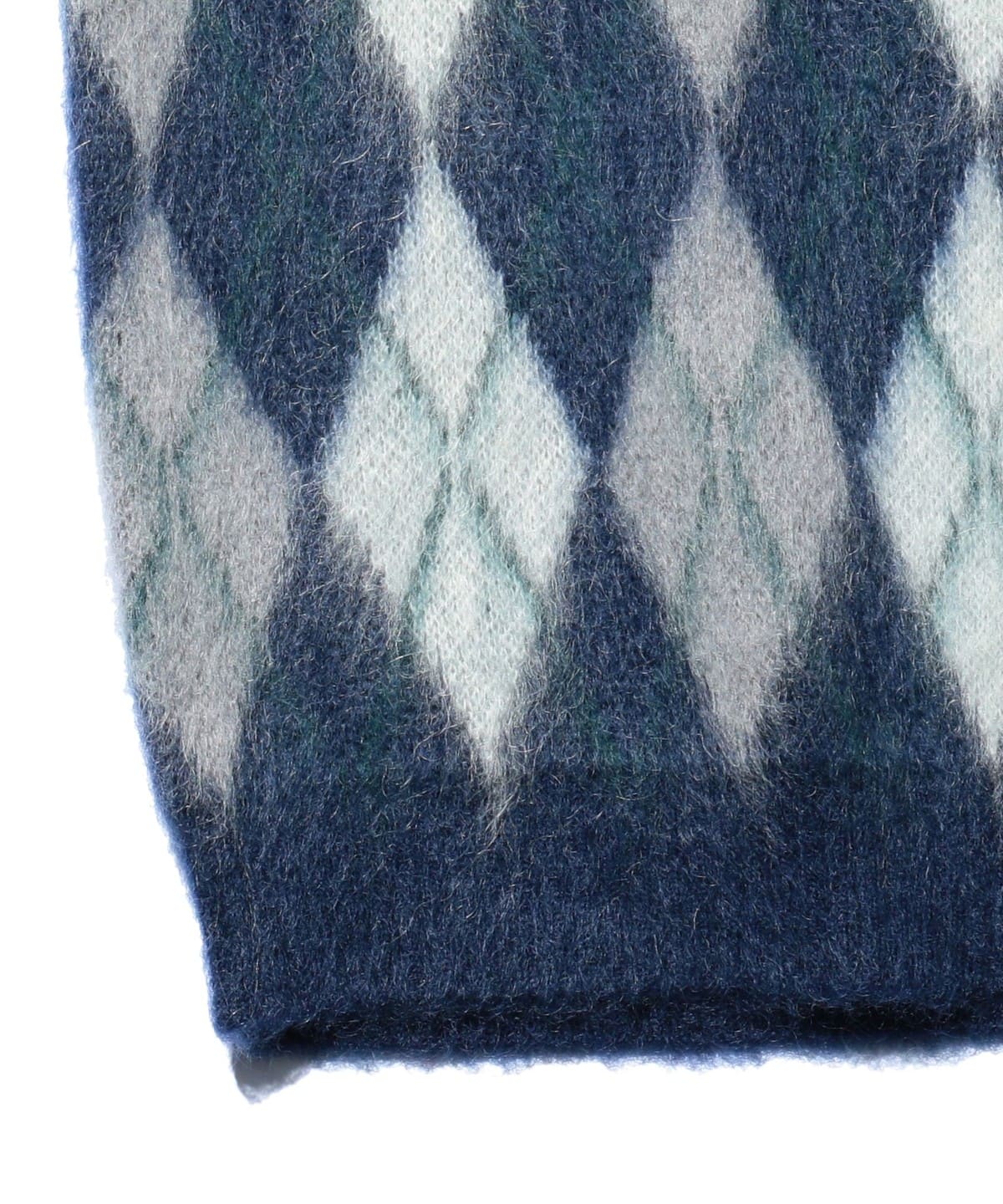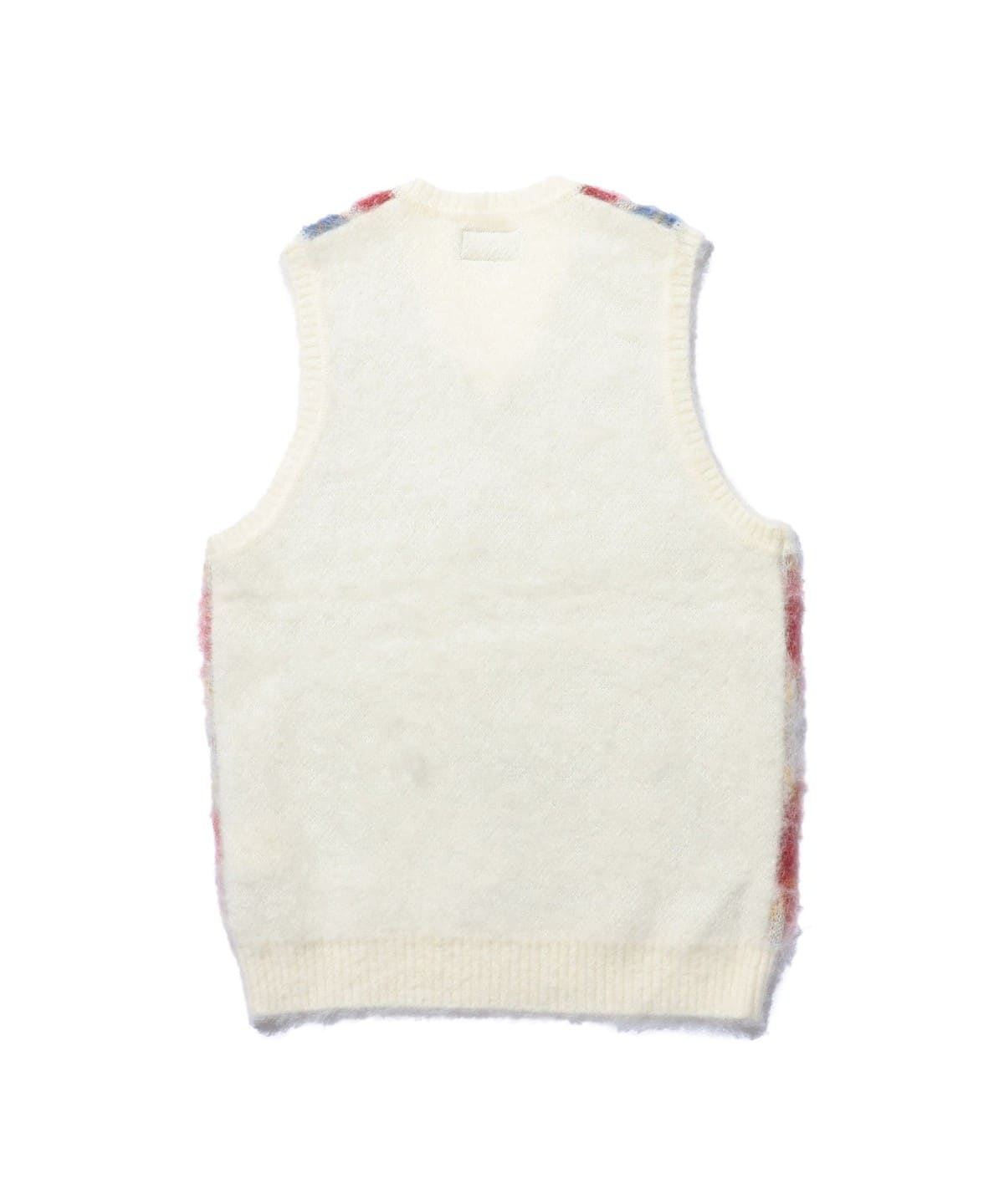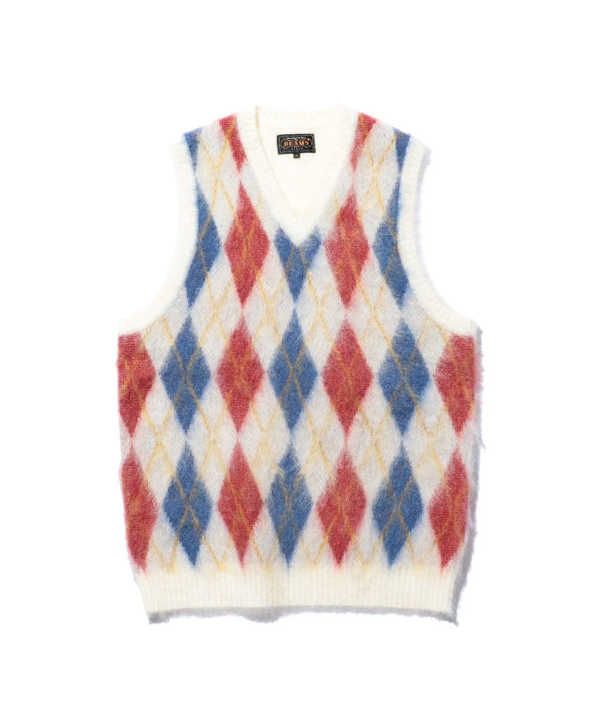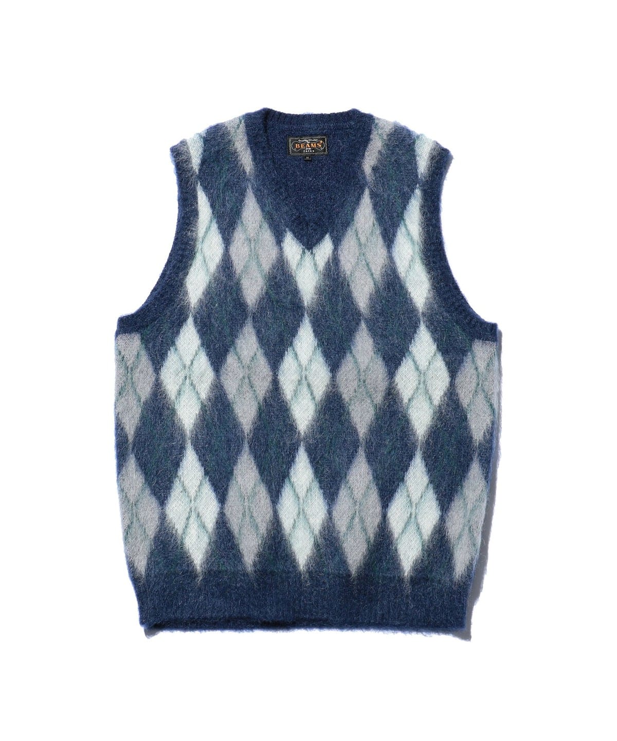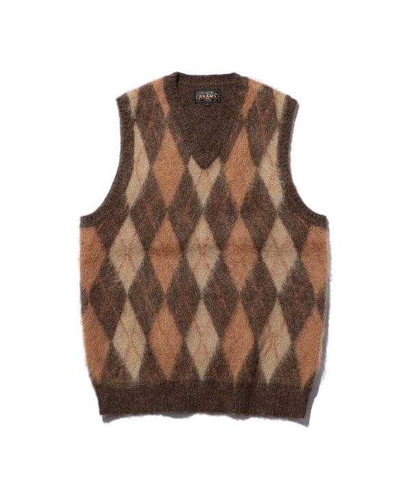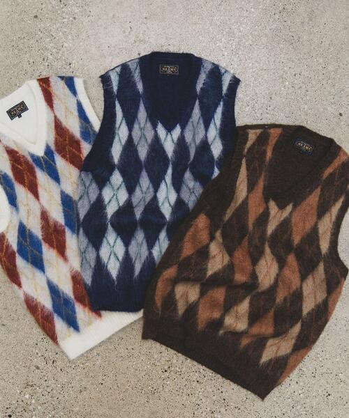 1960년대 빈티지 니트 베스트를 베이스로 한 BEAMS PLUS 니트 베스트입니다. 앞면은 넓은 피치의 아가일 패턴으로 구성된 풀오버 타입이며, 뒷면은 무지 디자인입니다. 4가지 컬러를 사용한 9게이지 더블 자카드로 패턴을 표현했습니다. 앙고라 산양에서 채취한 키드 모헤어와 메리노울, 나일론을 혼방한 실을 사용했으며, 표면에는 샤기 기모 가공을 더해 부드러운 질감입니다.