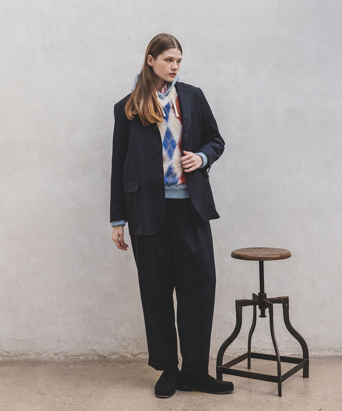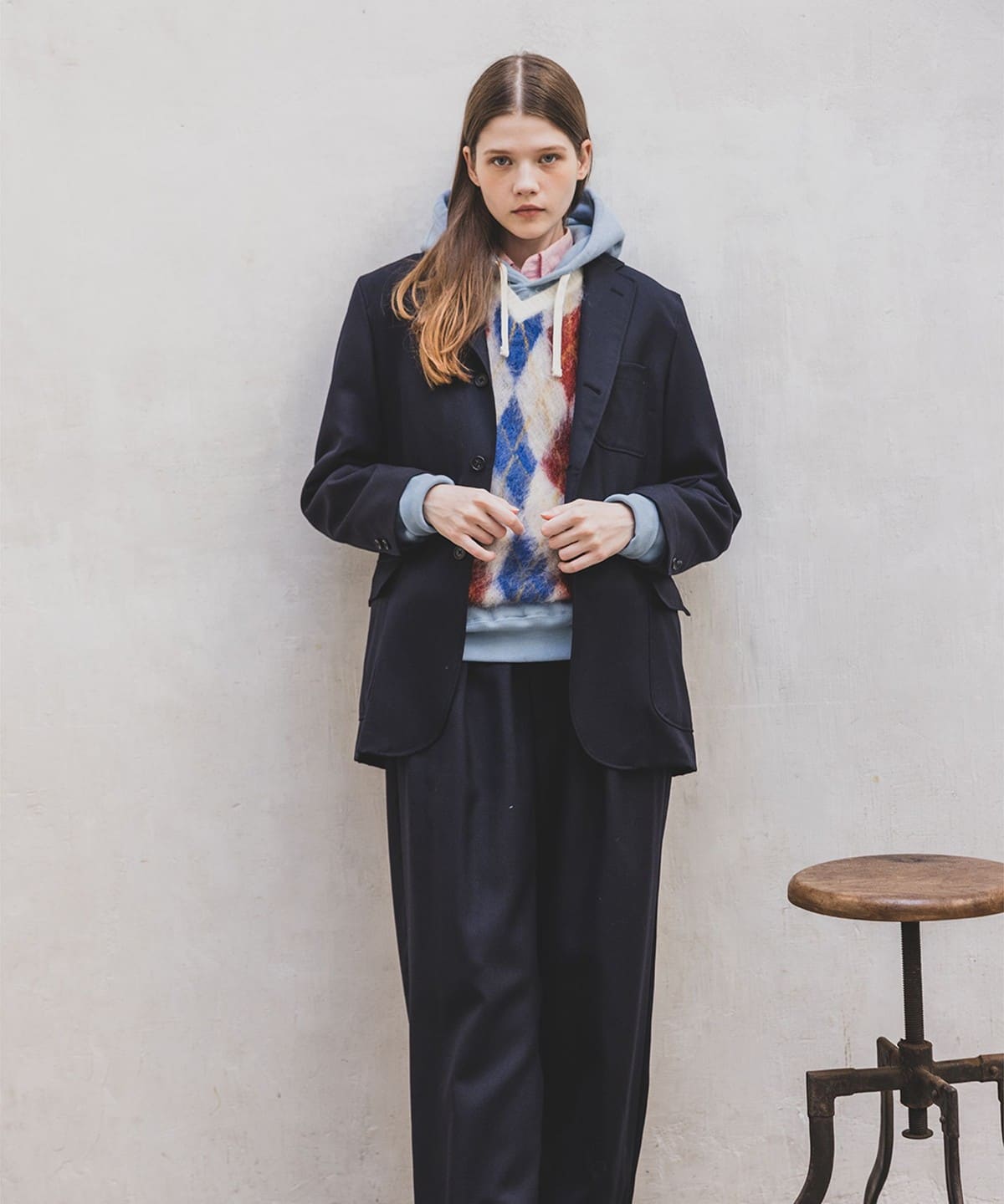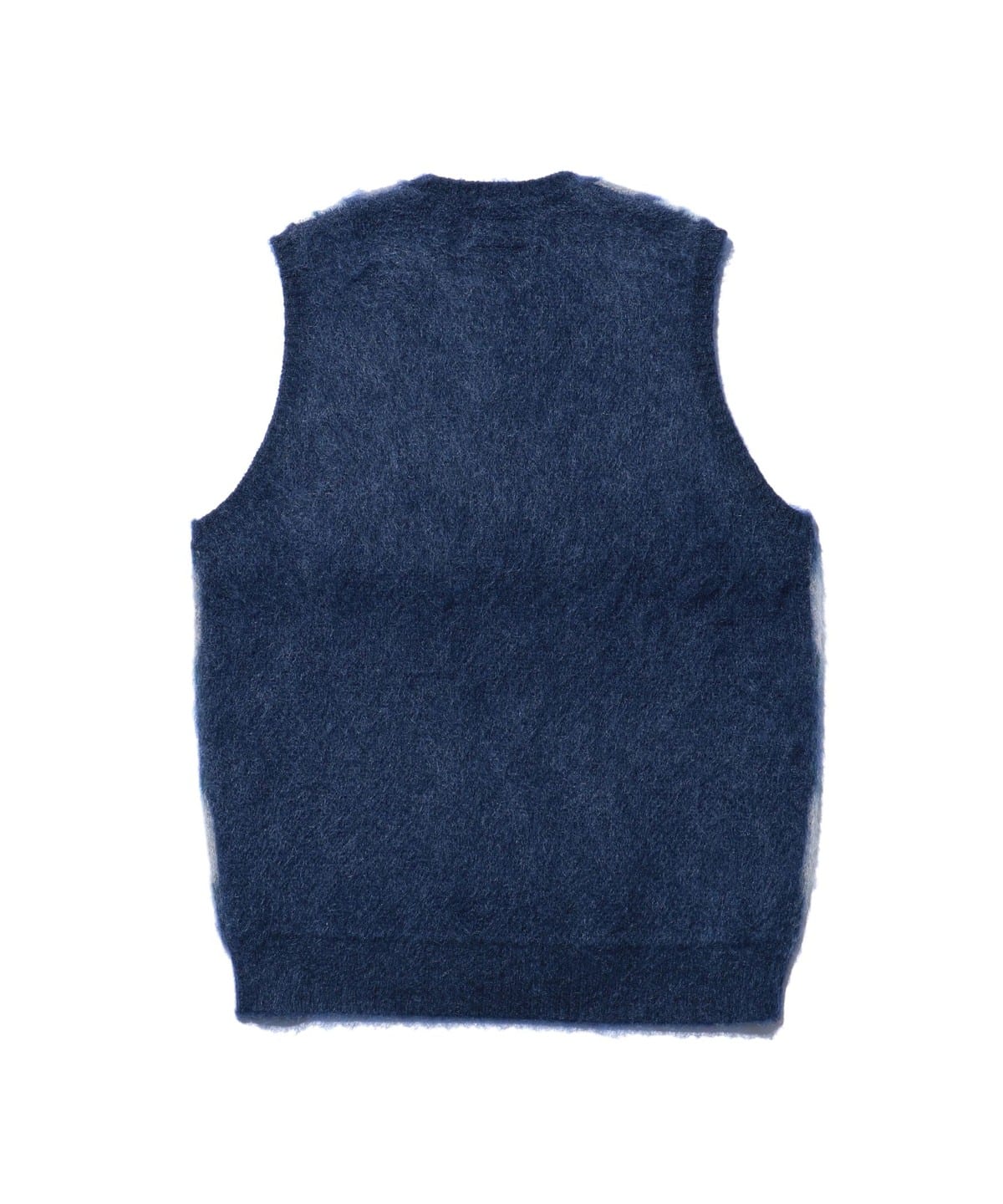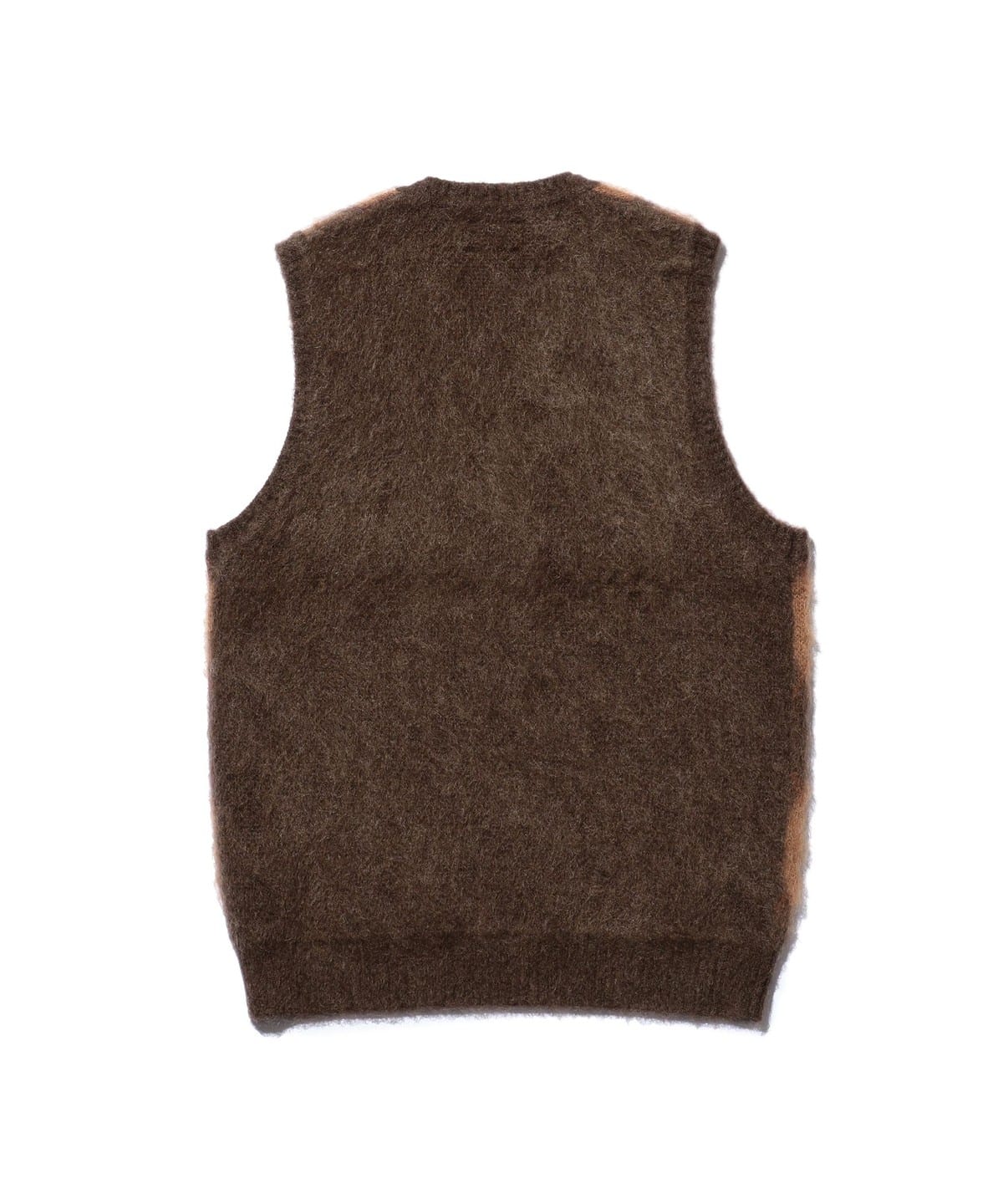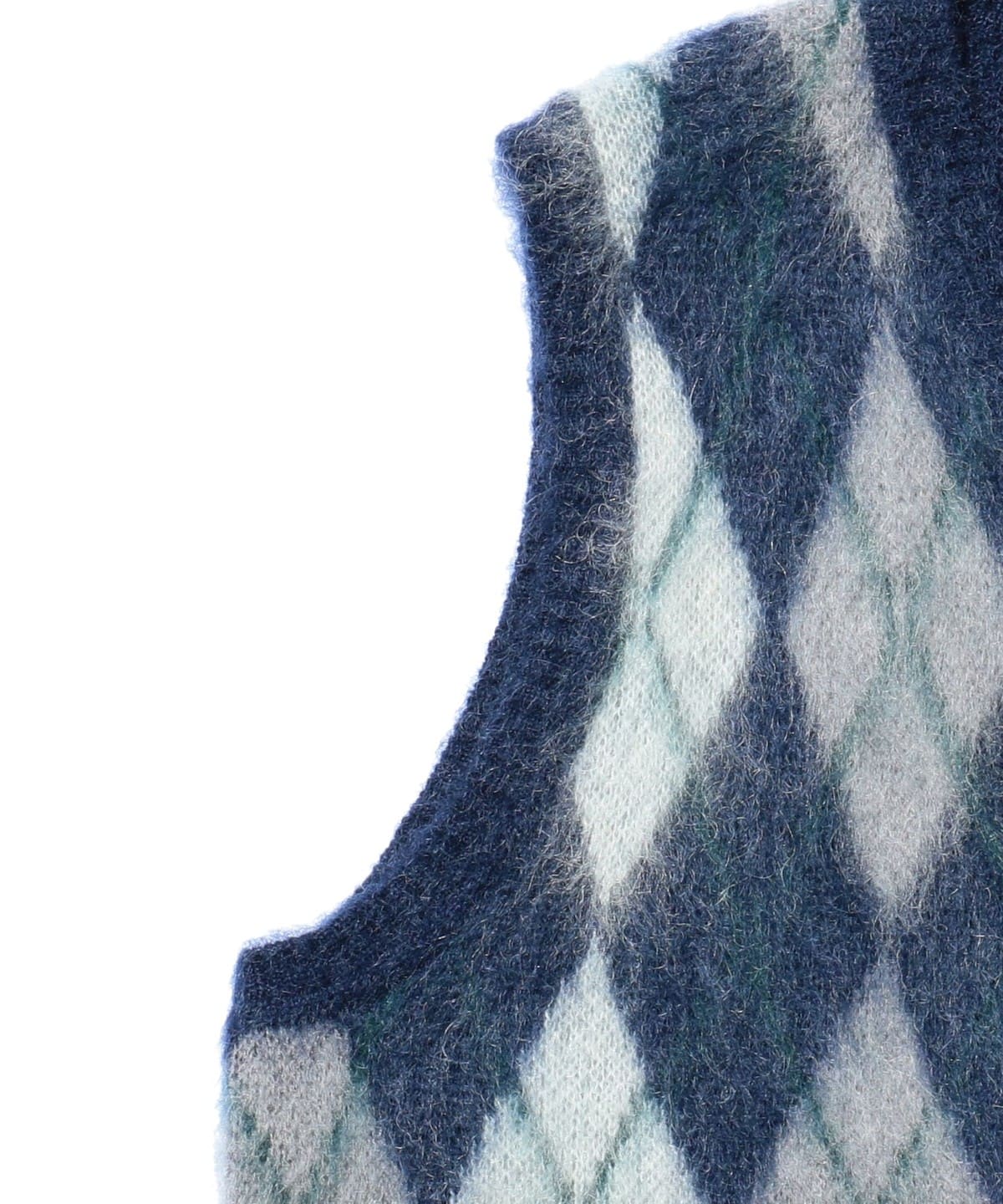 1960년대 빈티지 니트 베스트를 베이스로 한 BEAMS PLUS 니트 베스트입니다. 앞면은 넓은 피치의 아가일 패턴으로 구성된 풀오버 타입이며, 뒷면은 무지 디자인입니다. 4가지 컬러를 사용한 9게이지 더블 자카드로 패턴을 표현했습니다. 앙고라 산양에서 채취한 키드 모헤어와 메리노울, 나일론을 혼방한 실을 사용했으며, 표면에는 샤기 기모 가공을 더해 부드러운 질감입니다.