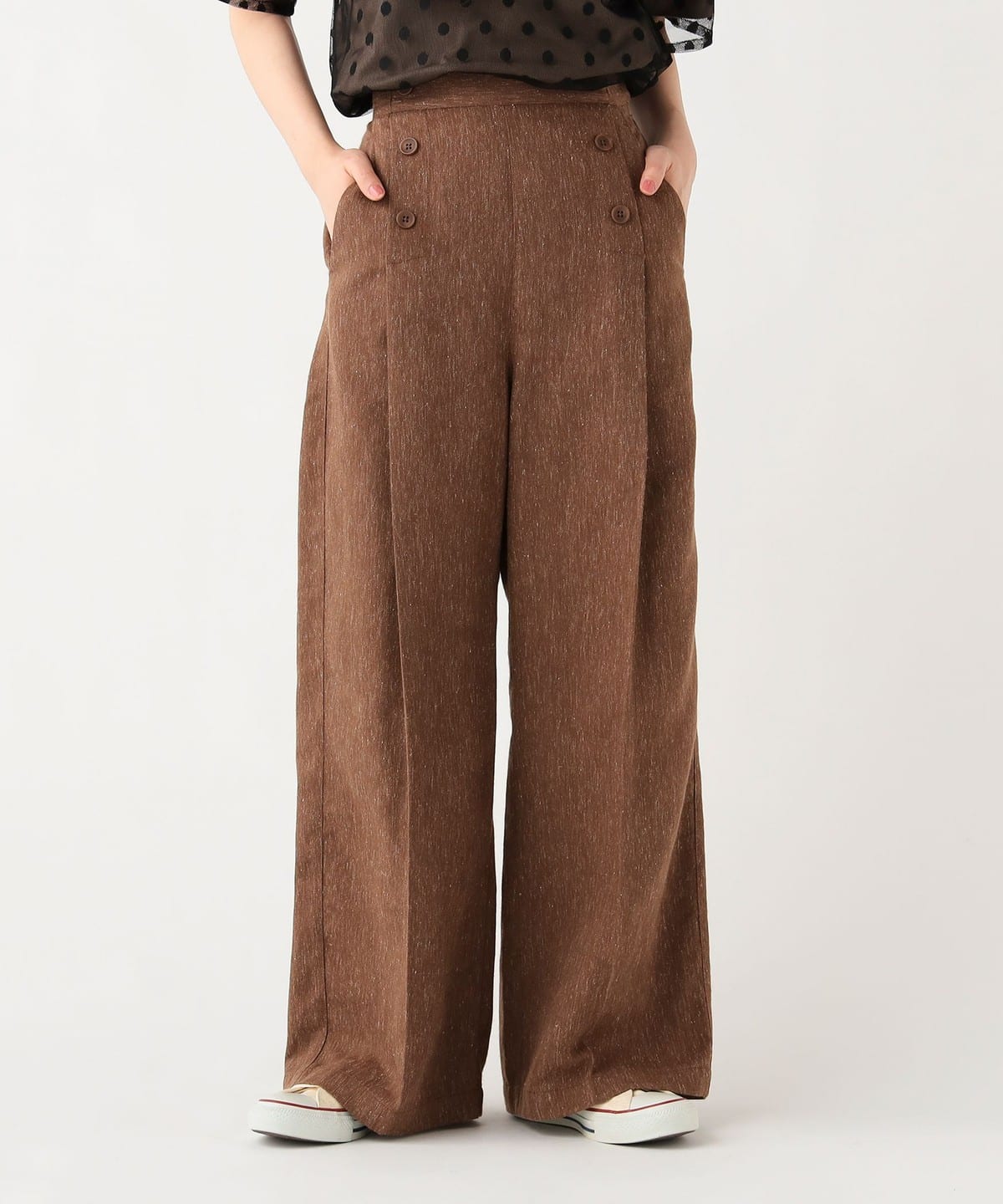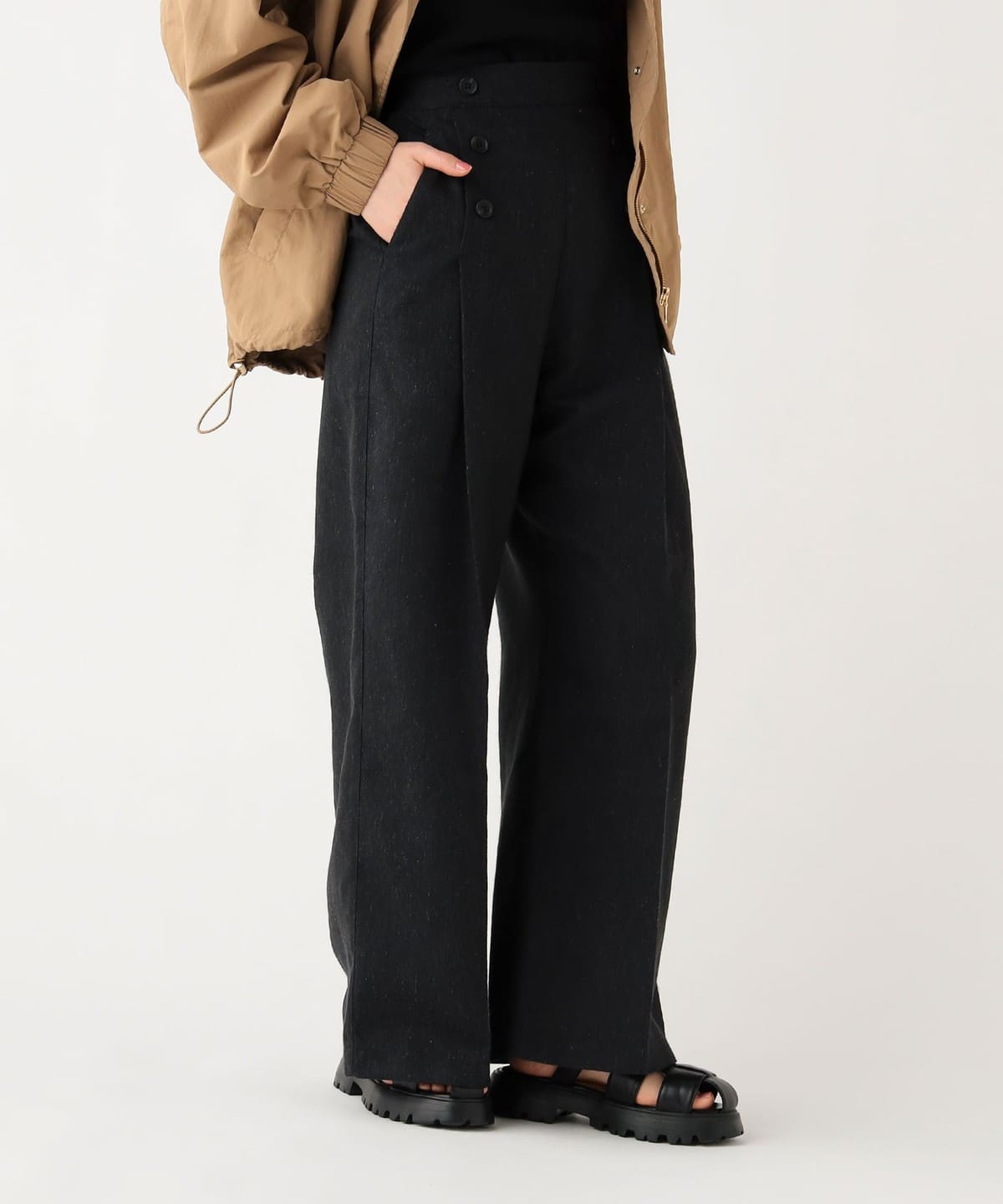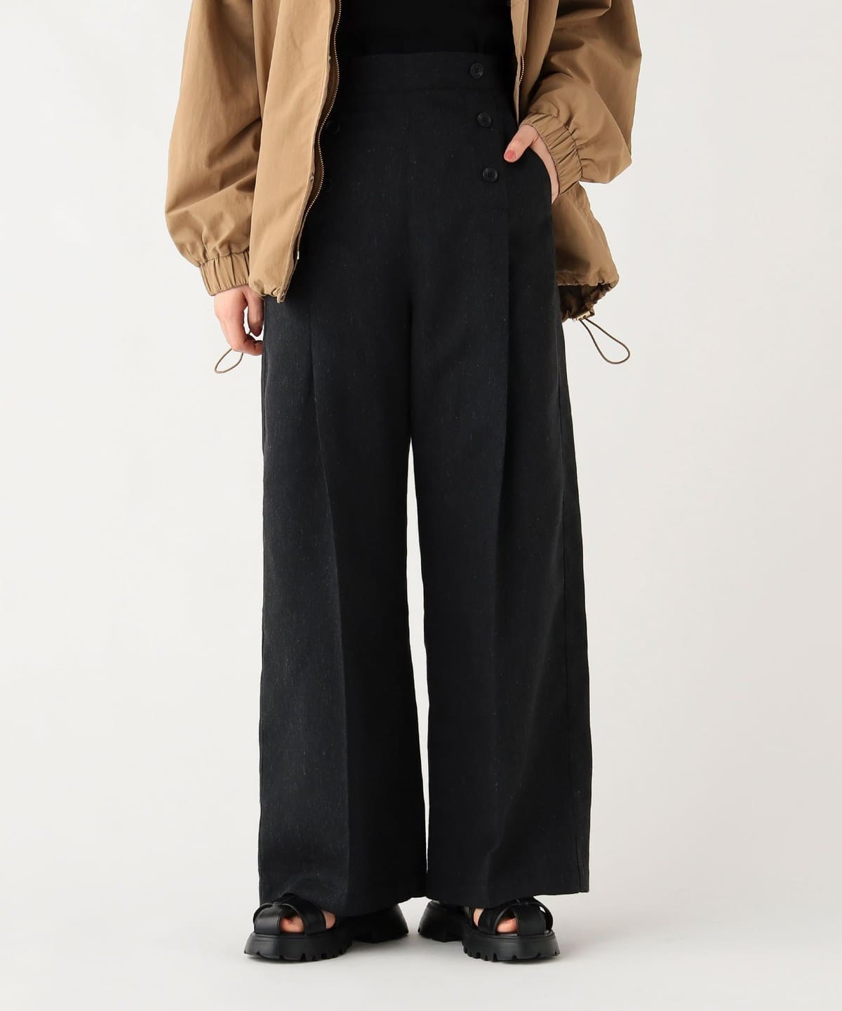 프론트에 정렬된 버튼 디테일 이 클래식한 포인트가 되는 와이드 팬츠입니다.