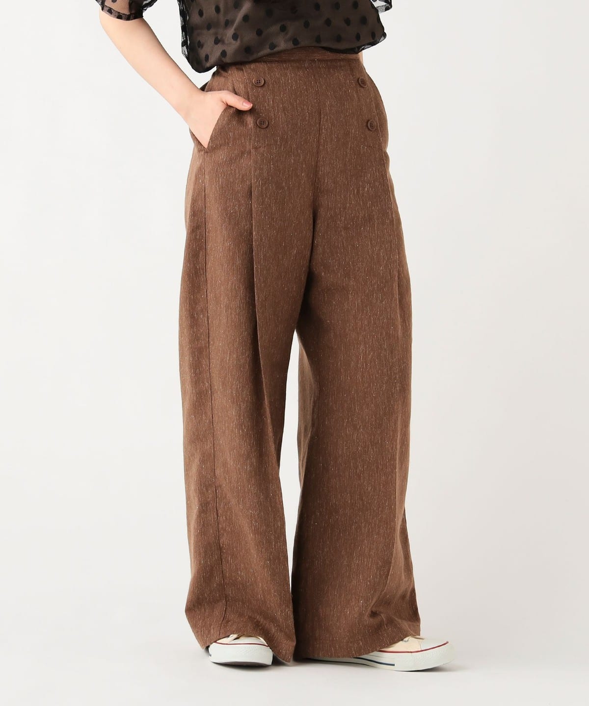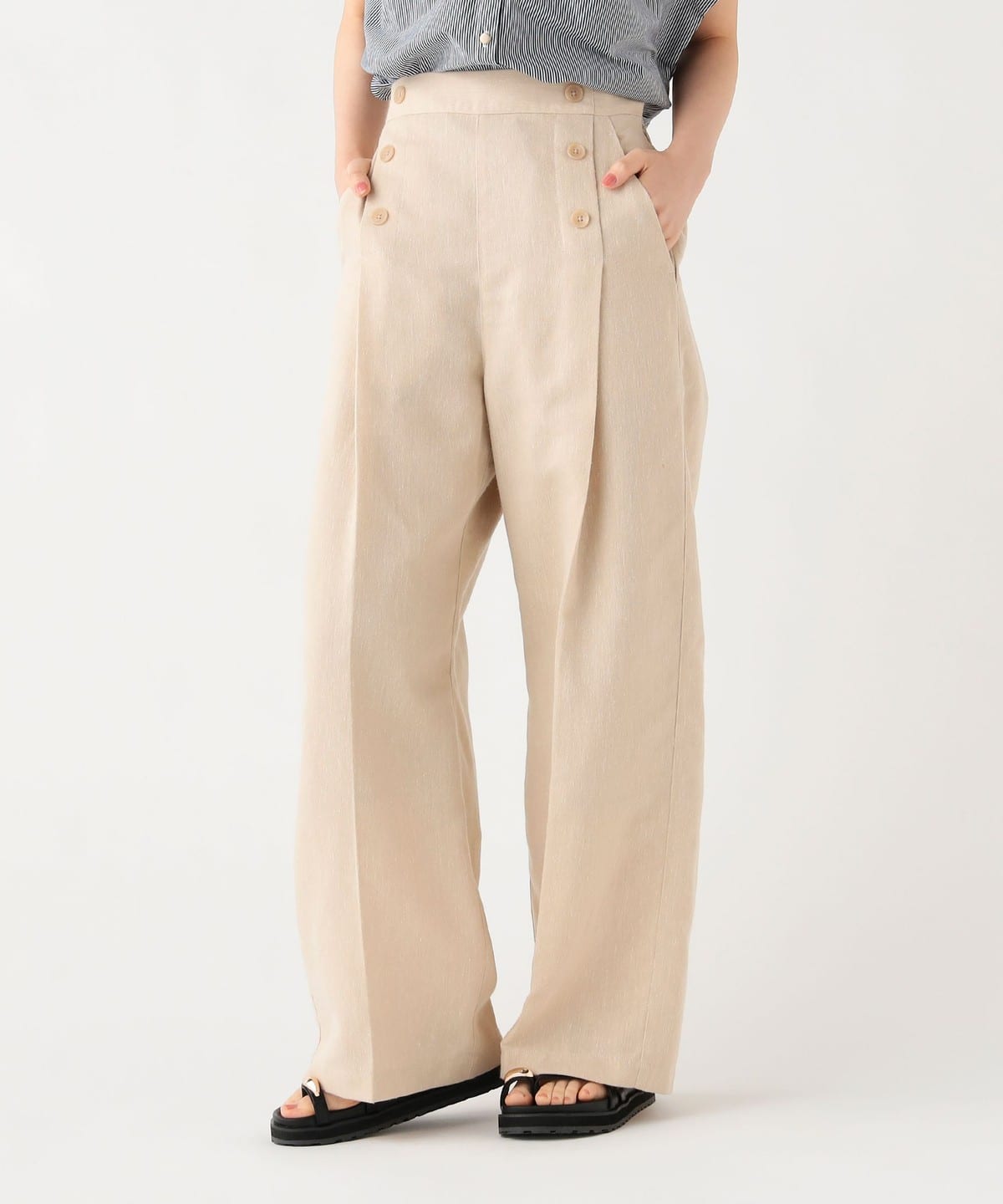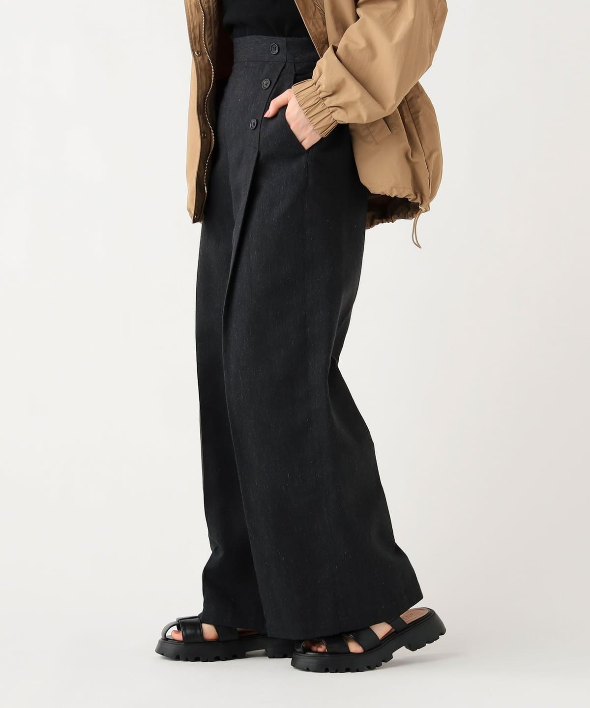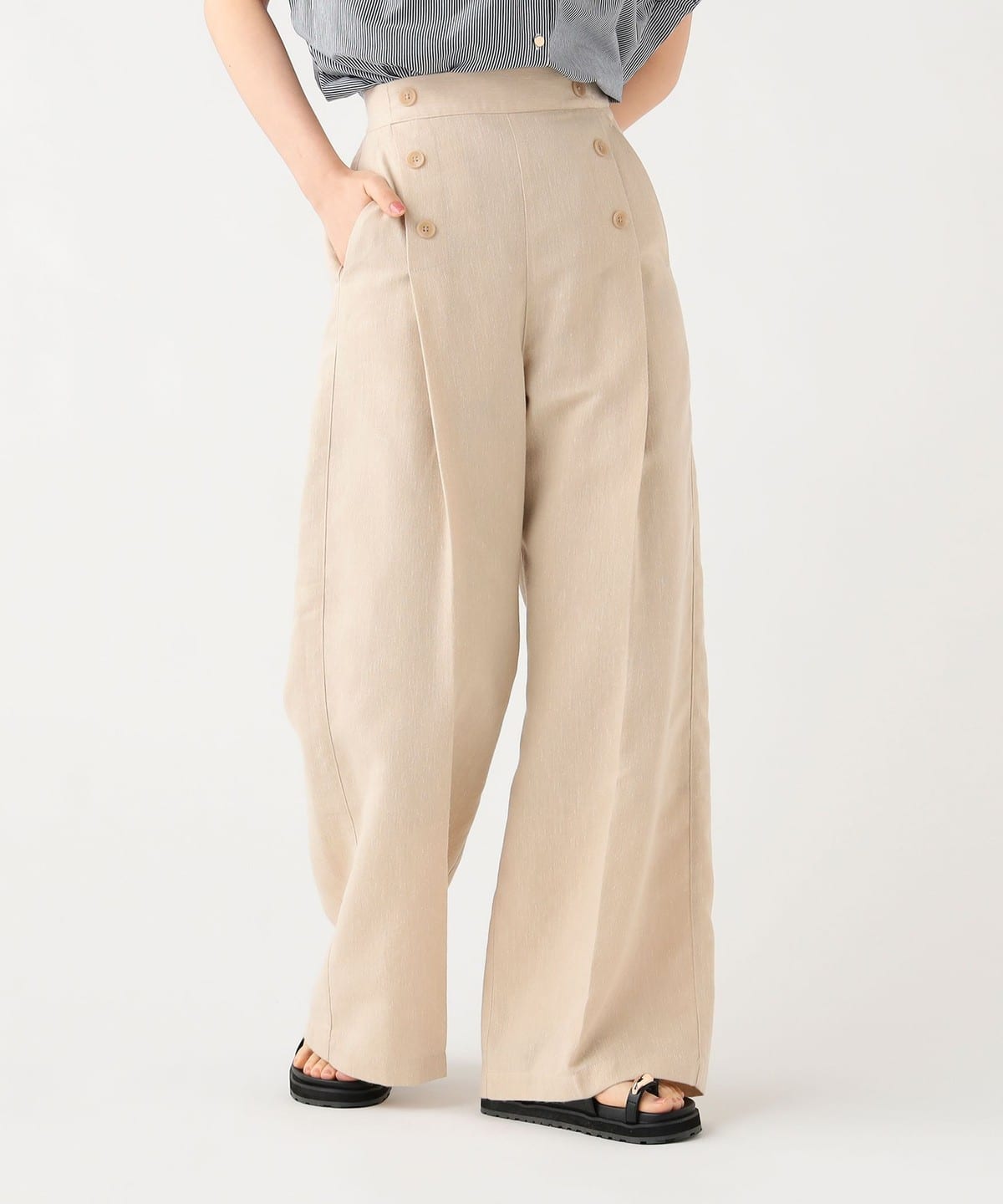 프론트에 정렬된 버튼 디테일 이 클래식한 포인트가 되는 와이드 팬츠입니다.