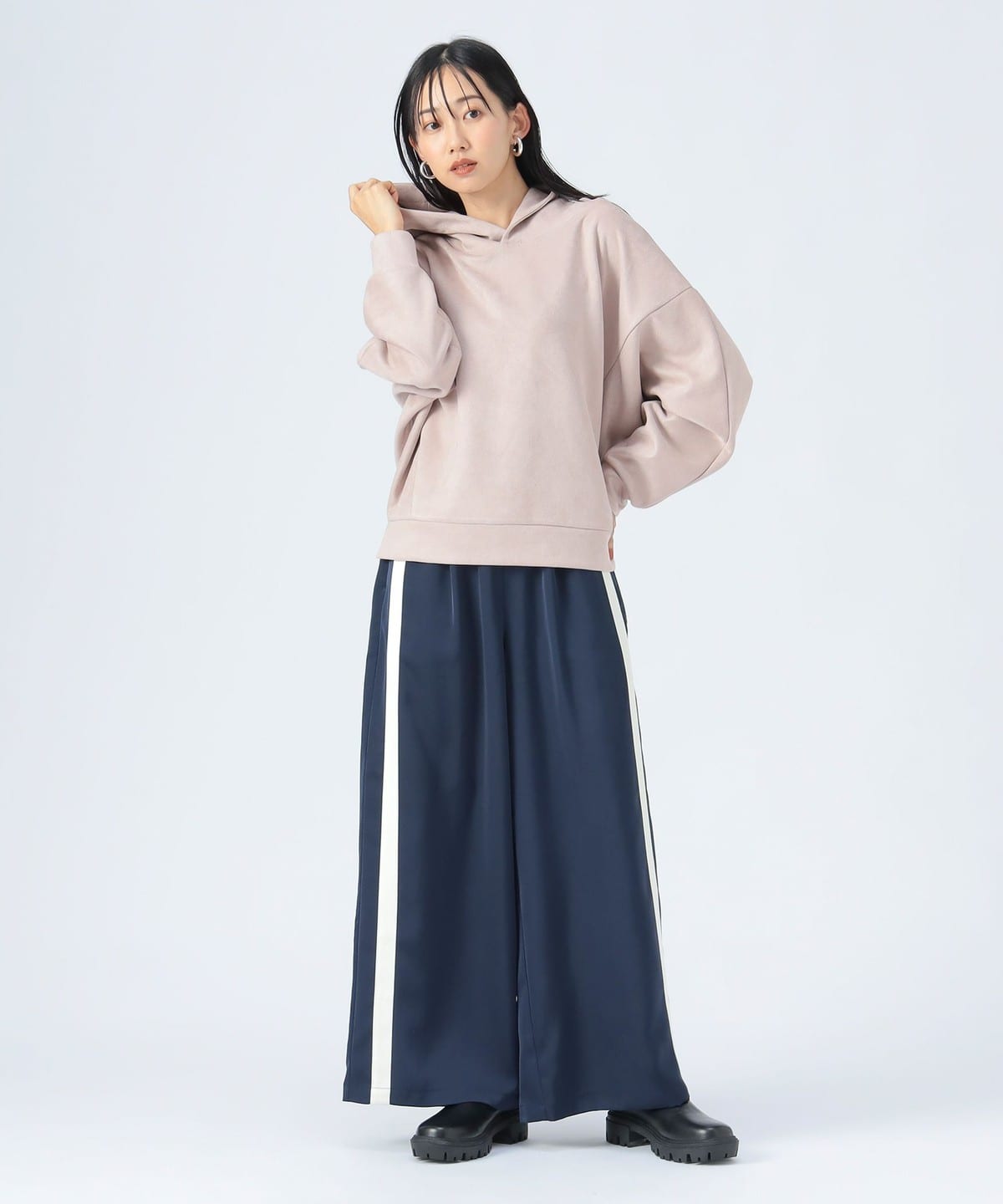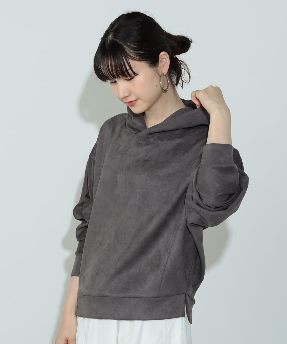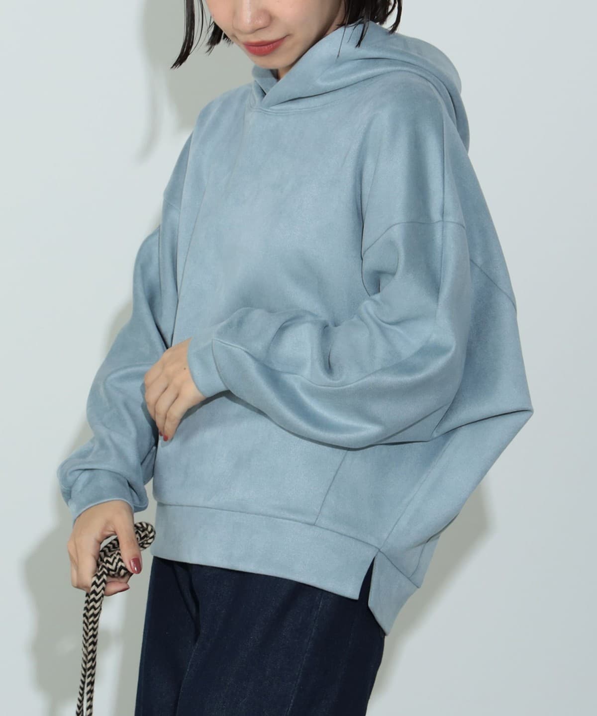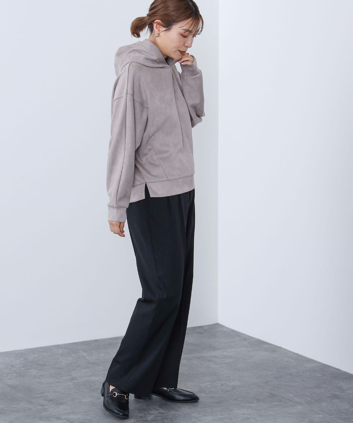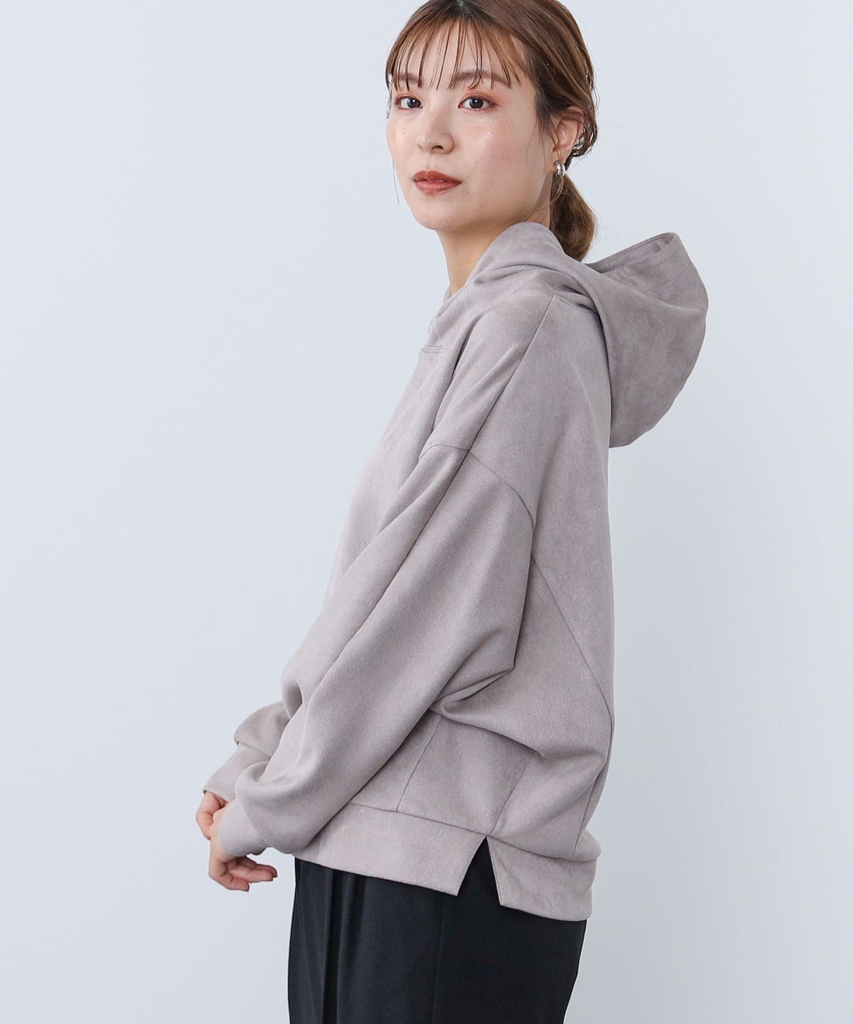 사이드에 슬릿이 있으며 후드에 스트링이 없는 심플한 디자인입니다.