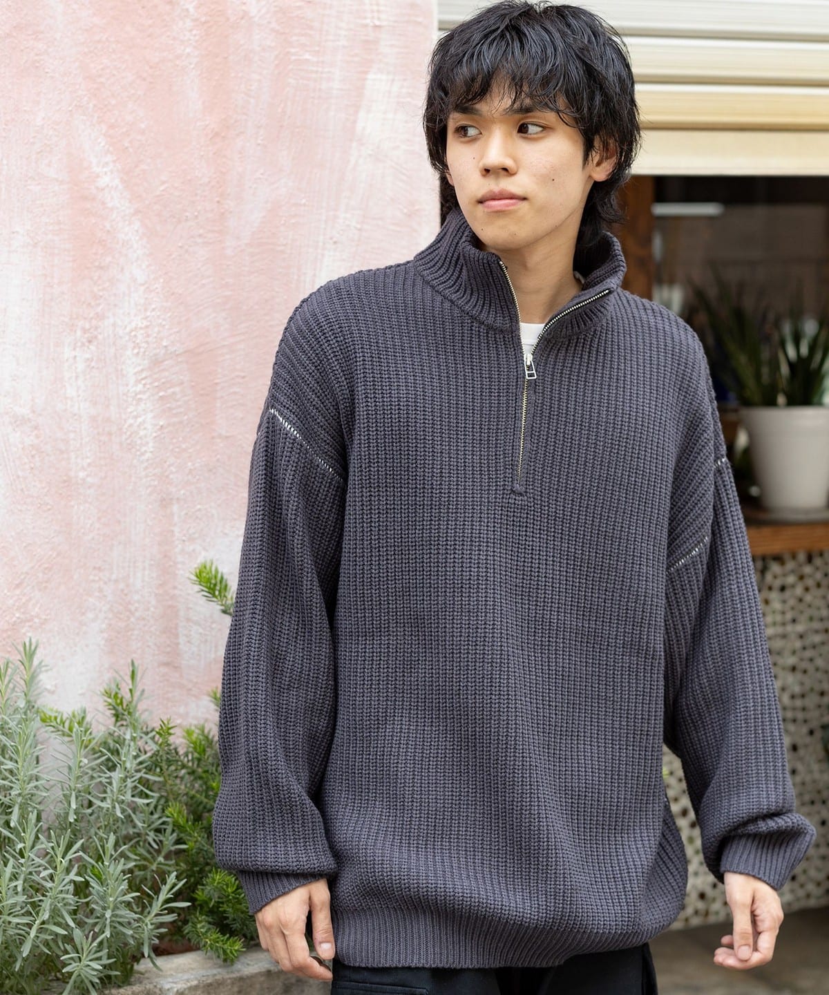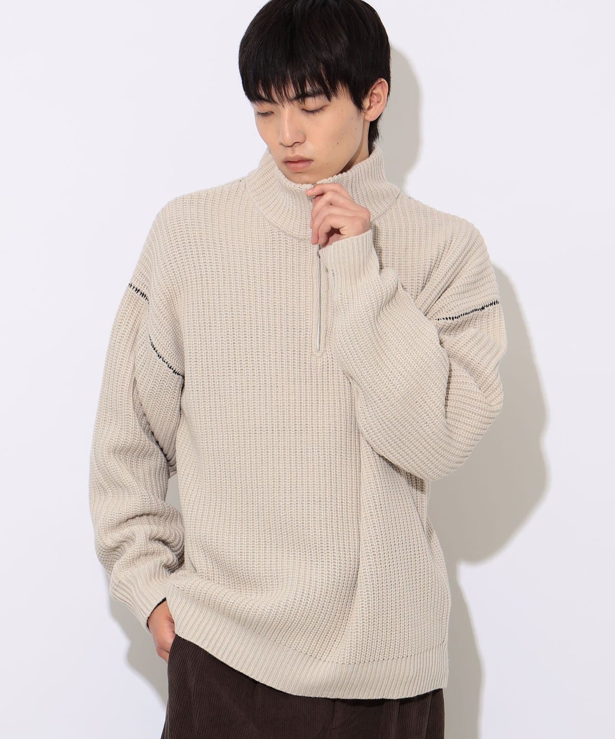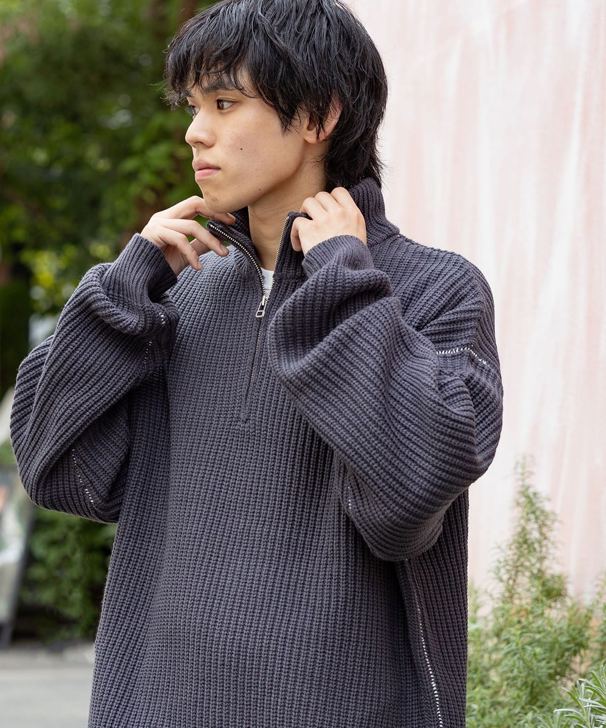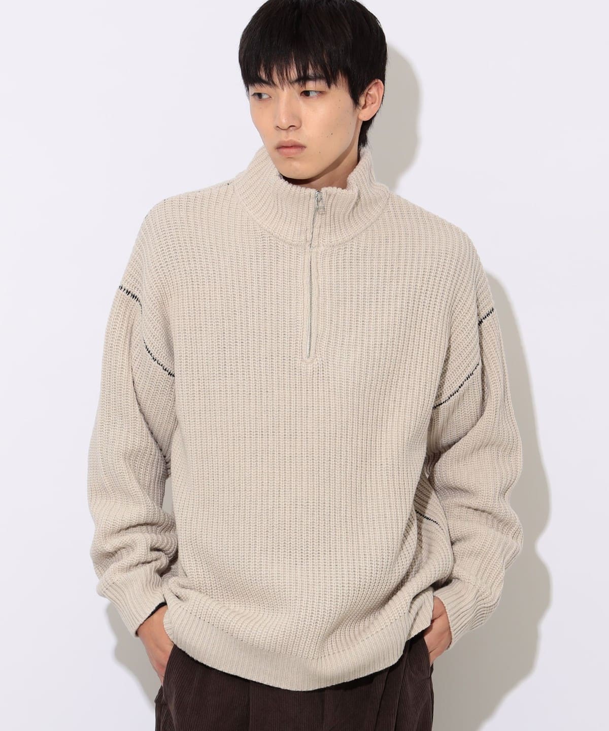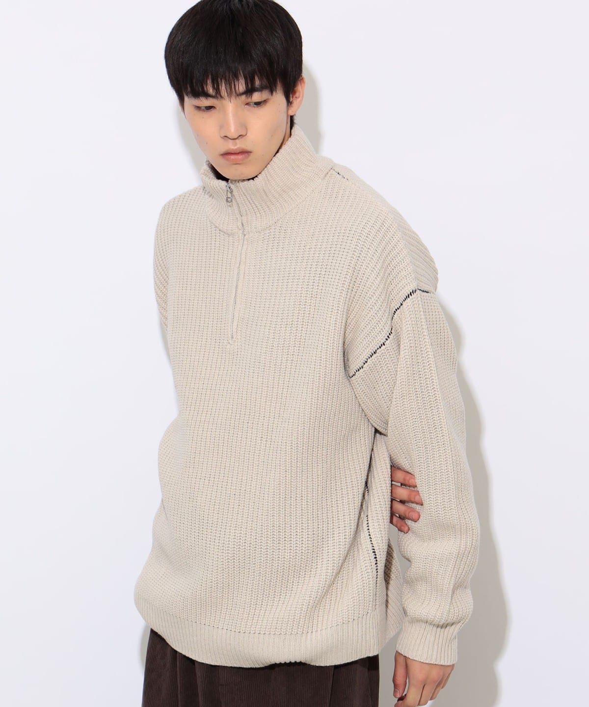 거친 니트 원단이 특징인 우아한 니트. 스탠드업 칼라, 하프 지퍼 디자인으로 부분적인 색상 포인트가 있습니다. 릴렉스핏