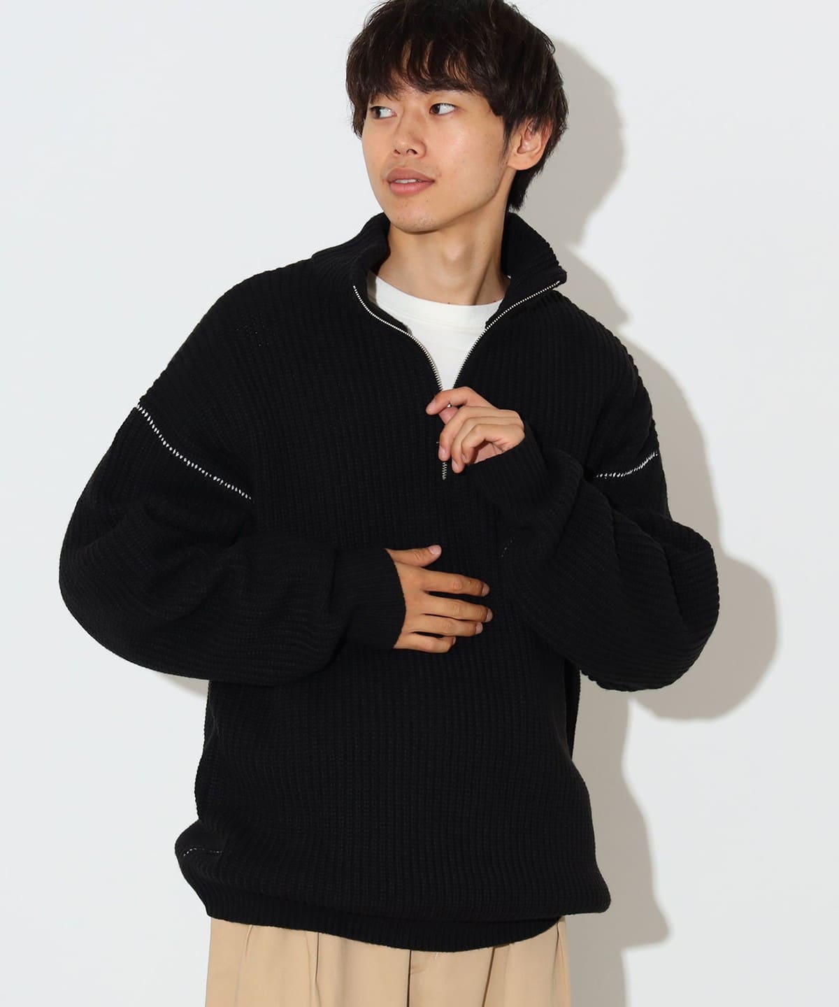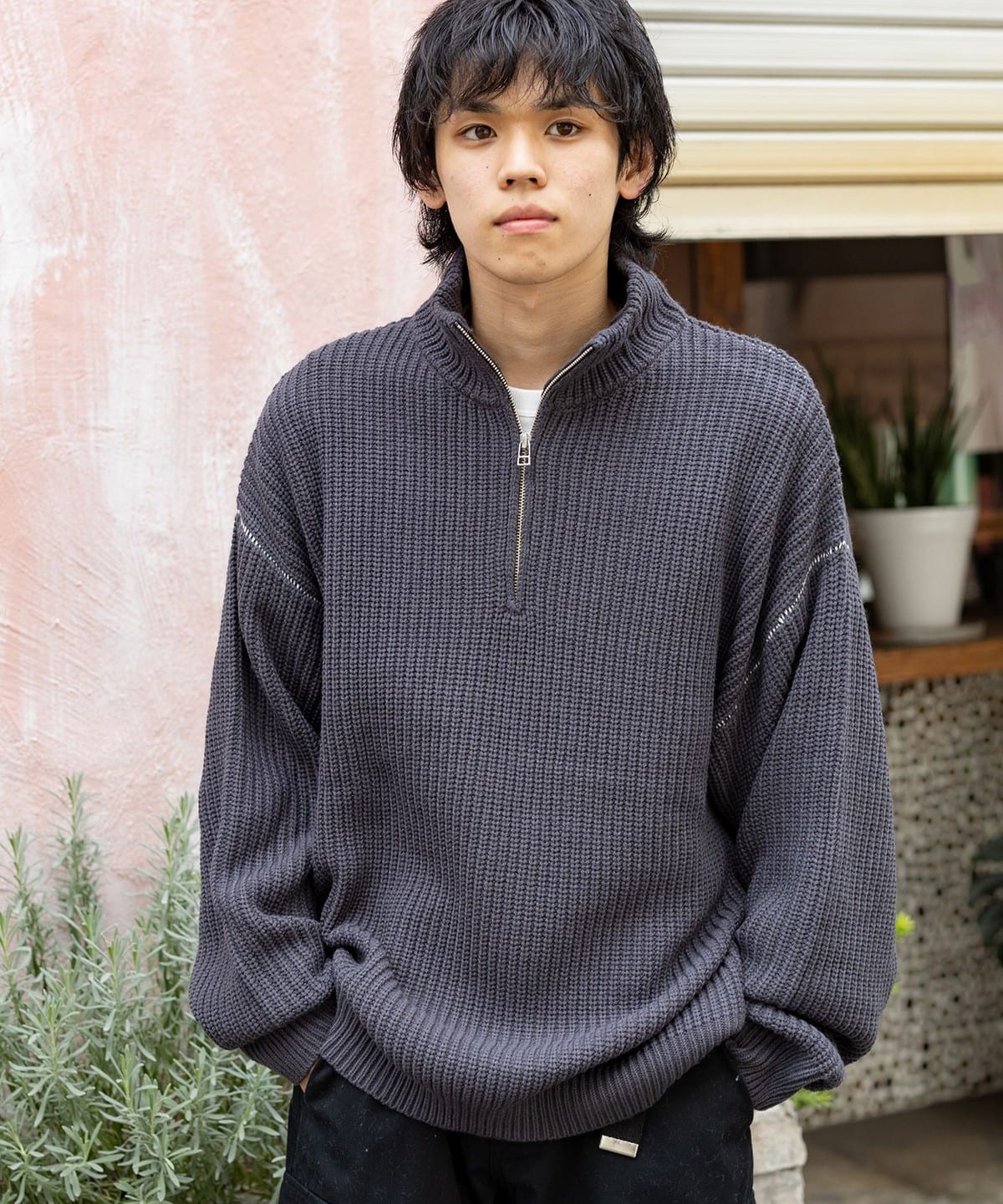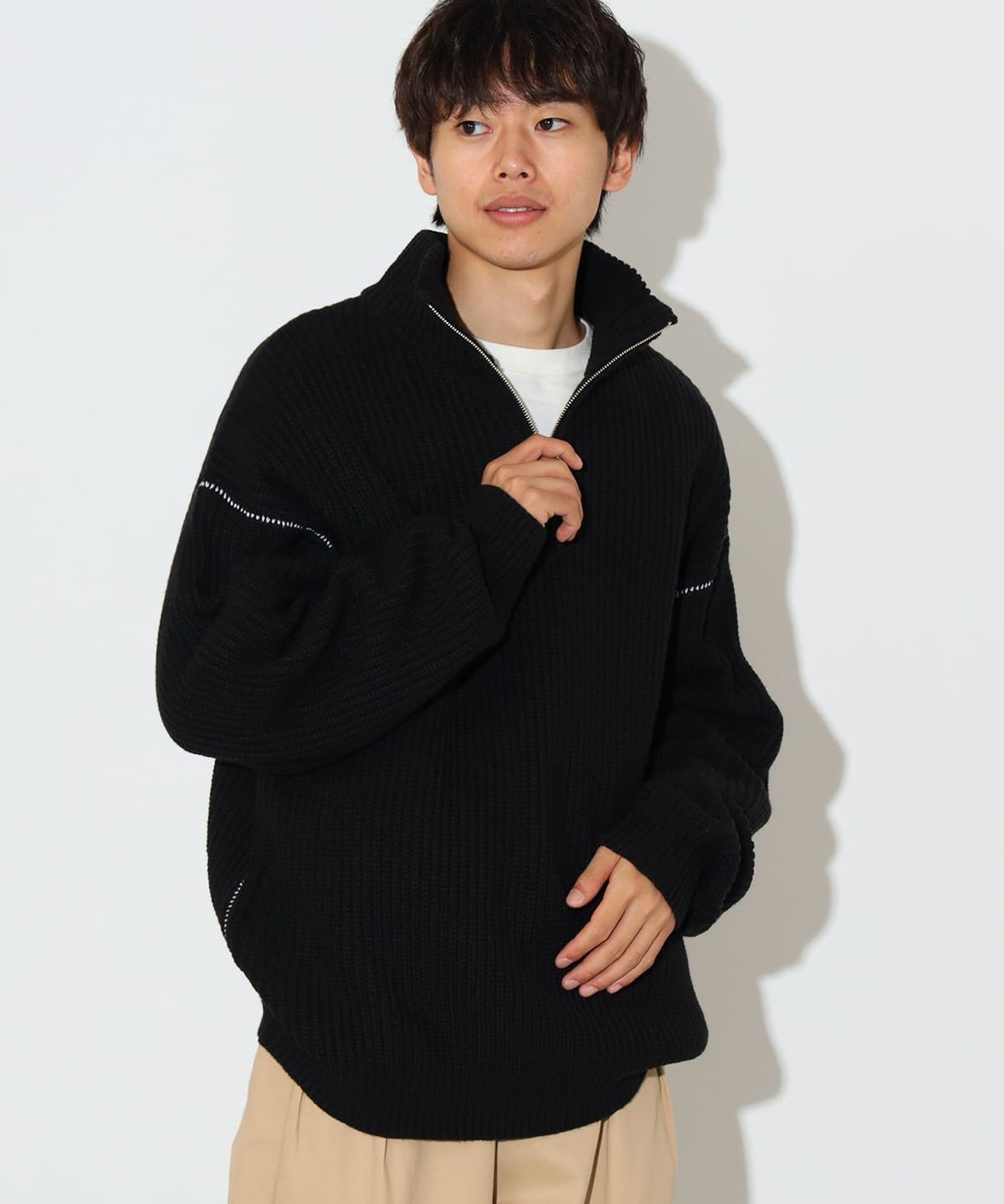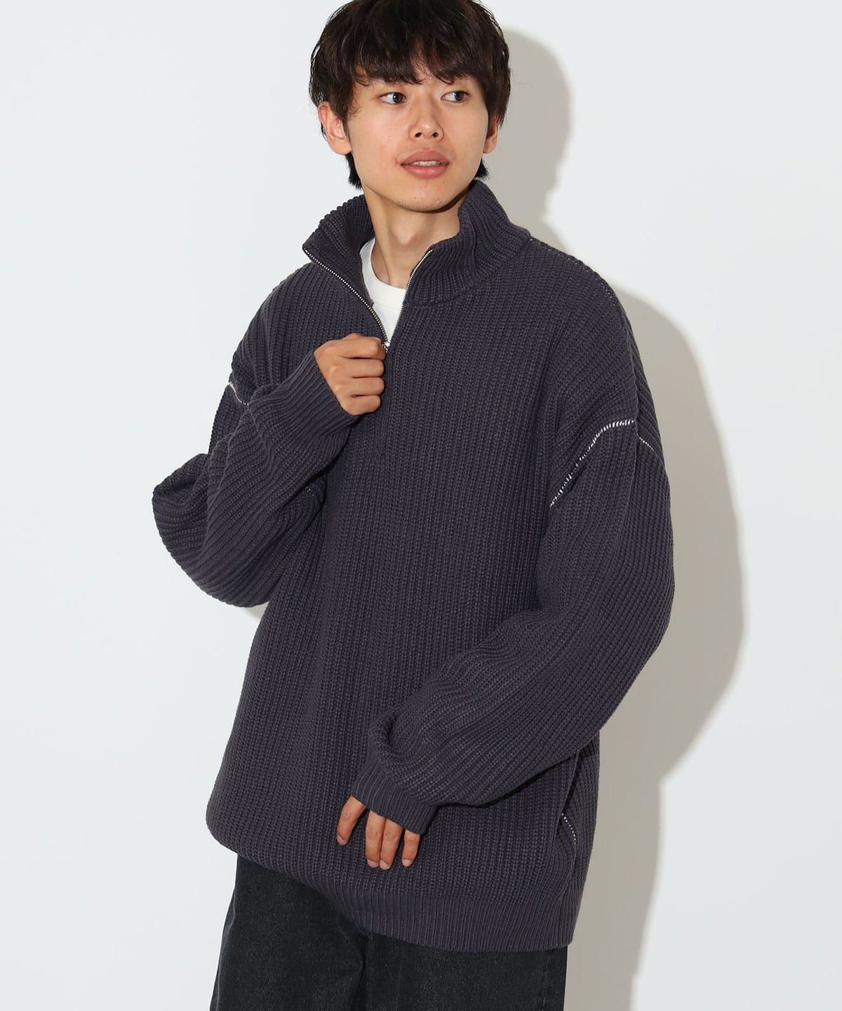 거친 니트 원단이 특징인 우아한 니트. 스탠드업 칼라, 하프 지퍼 디자인으로 부분적인 색상 포인트가 있습니다. 릴렉스핏
