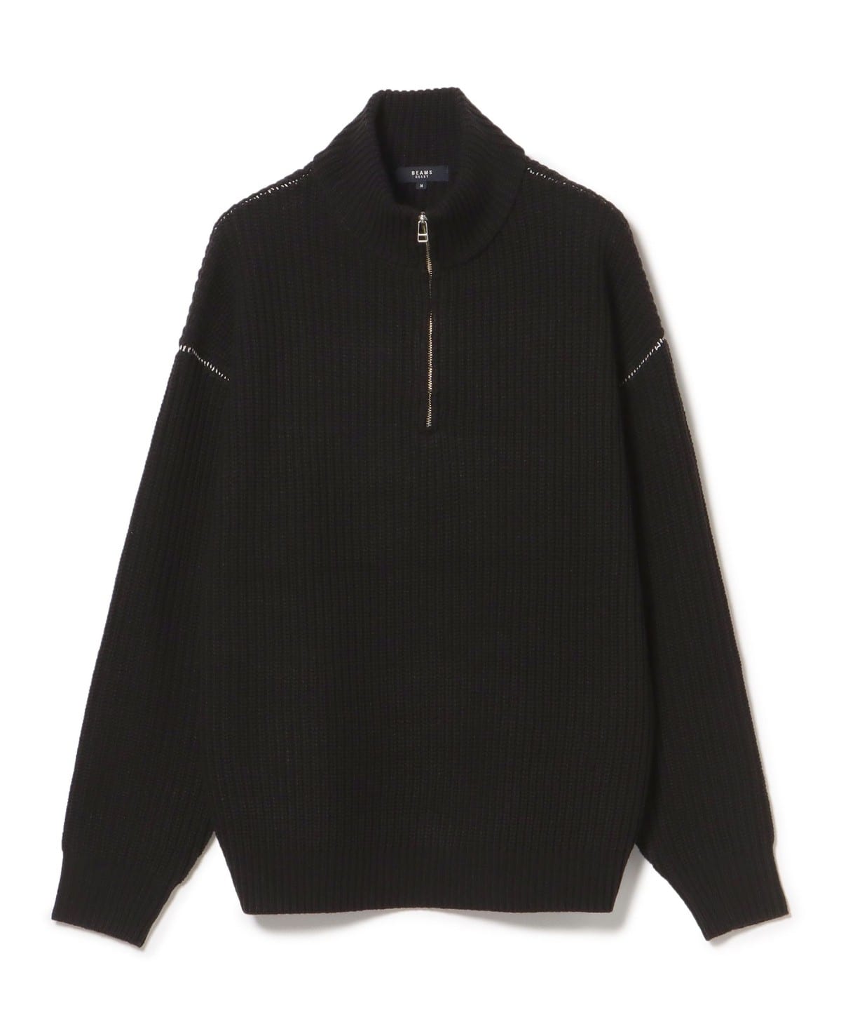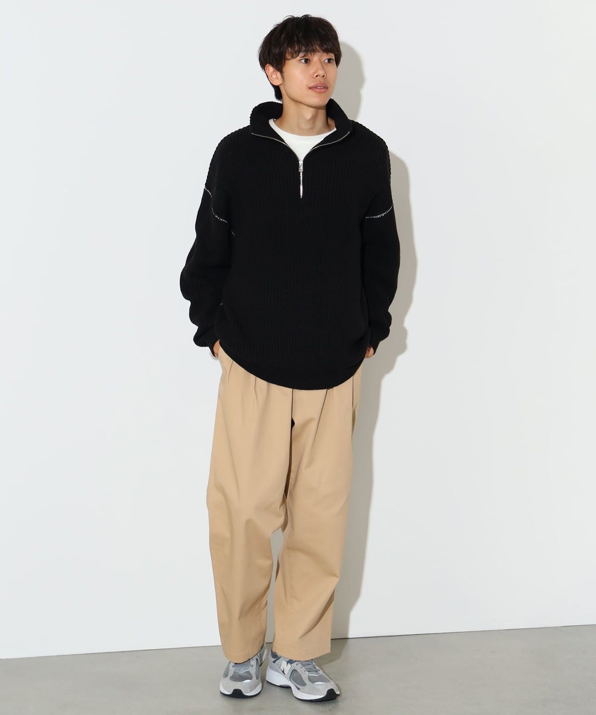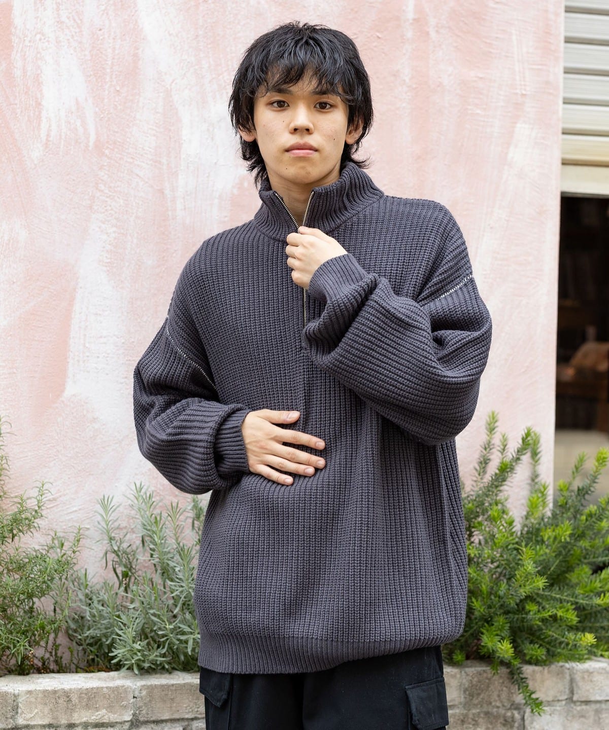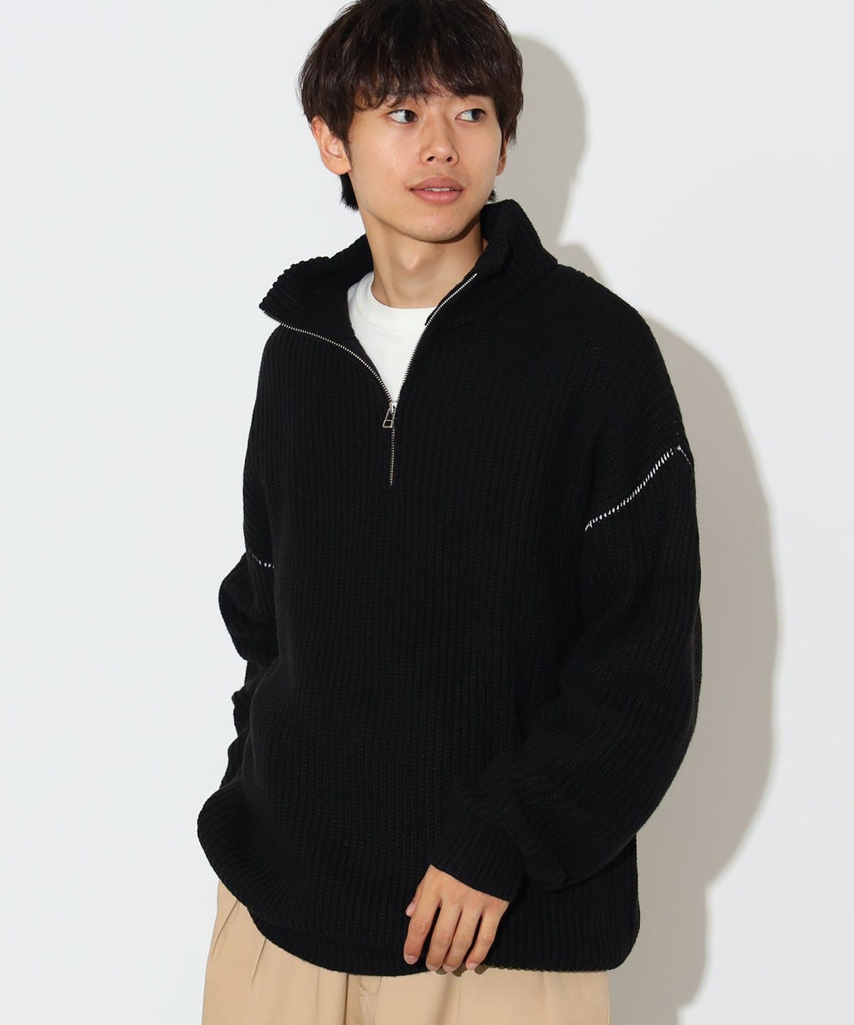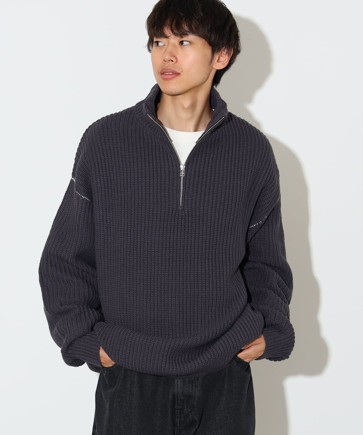 거친 니트 원단이 특징인 우아한 니트. 스탠드업 칼라, 하프 지퍼 디자인으로 부분적인 색상 포인트가 있습니다. 릴렉스핏