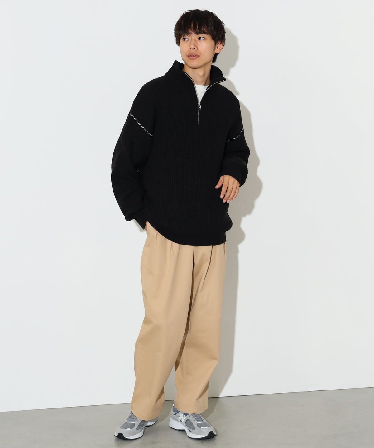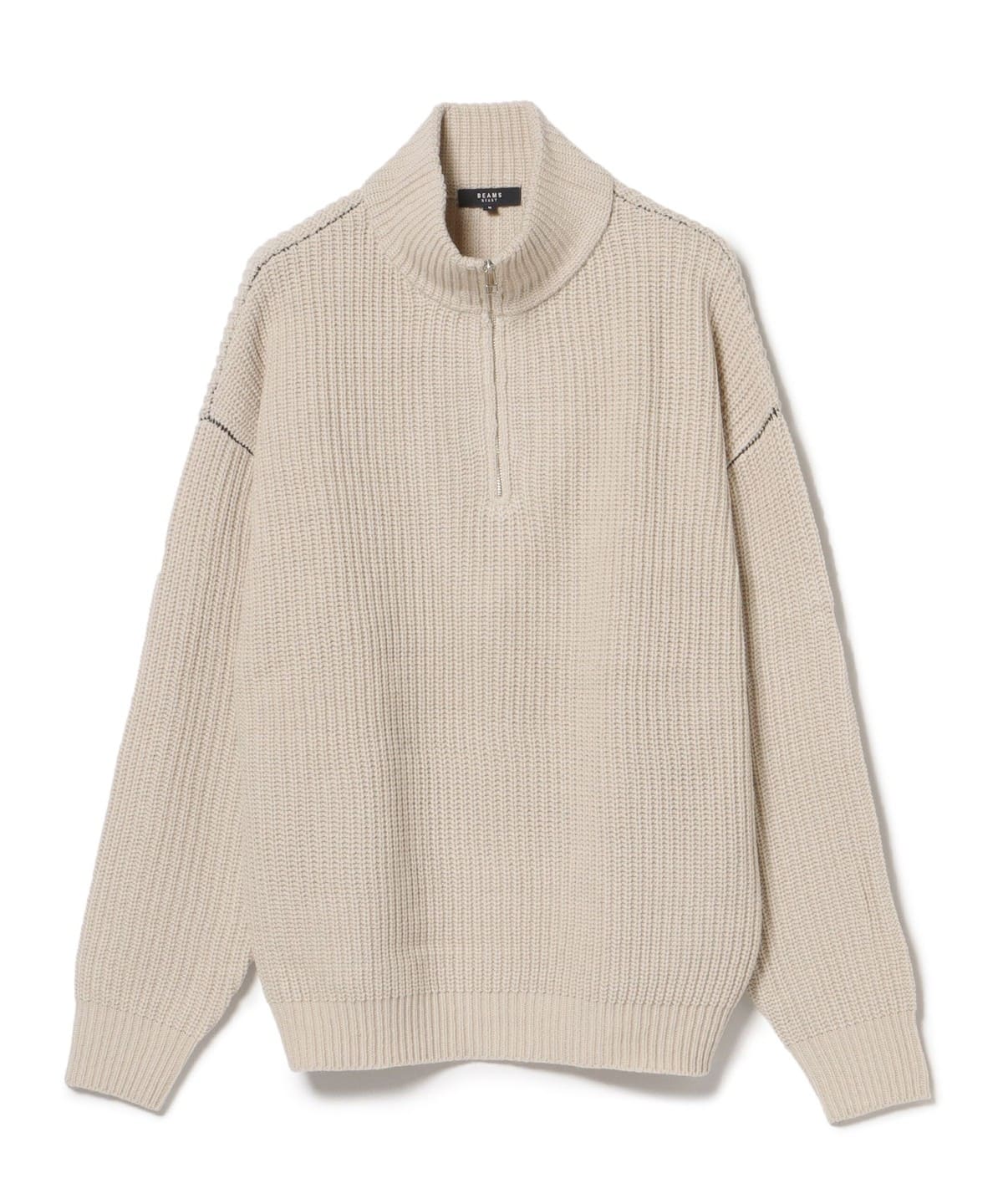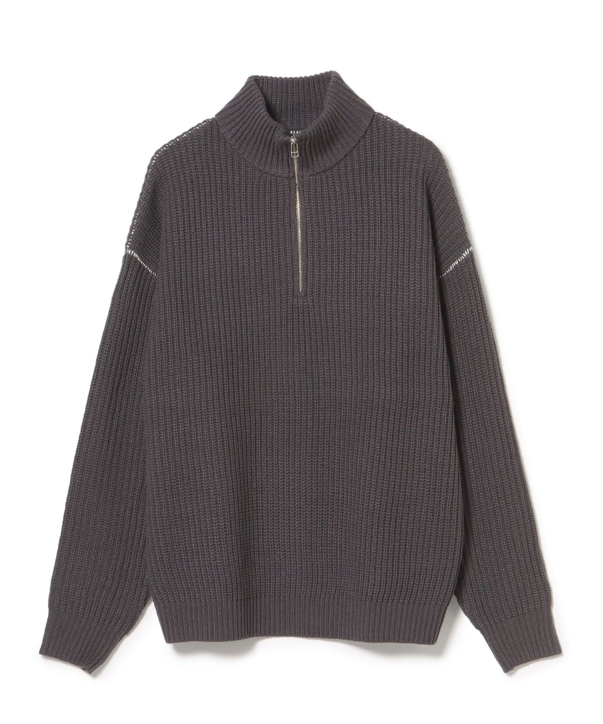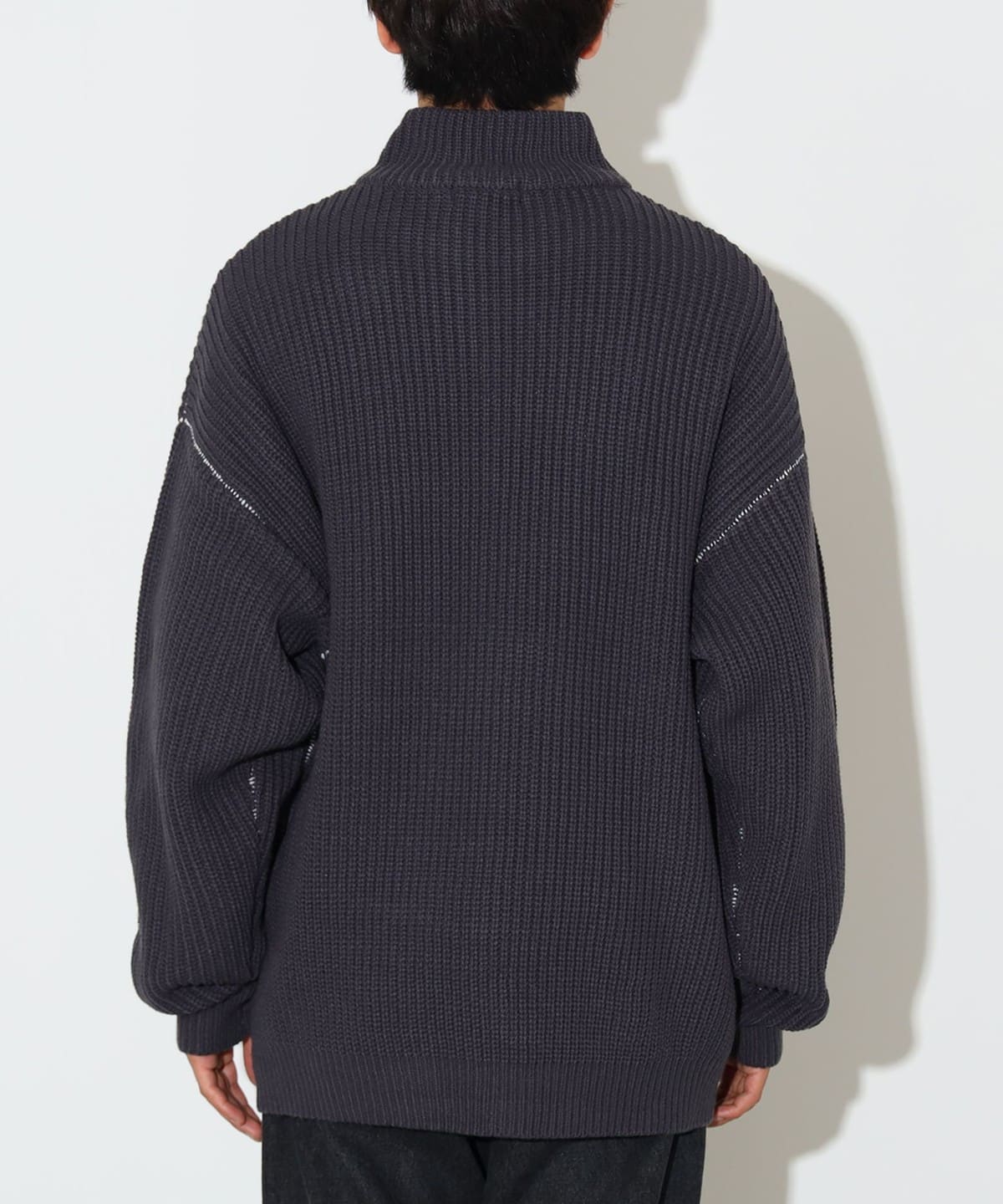 거친 니트 원단이 특징인 우아한 니트. 스탠드업 칼라, 하프 지퍼 디자인으로 부분적인 색상 포인트가 있습니다. 릴렉스핏