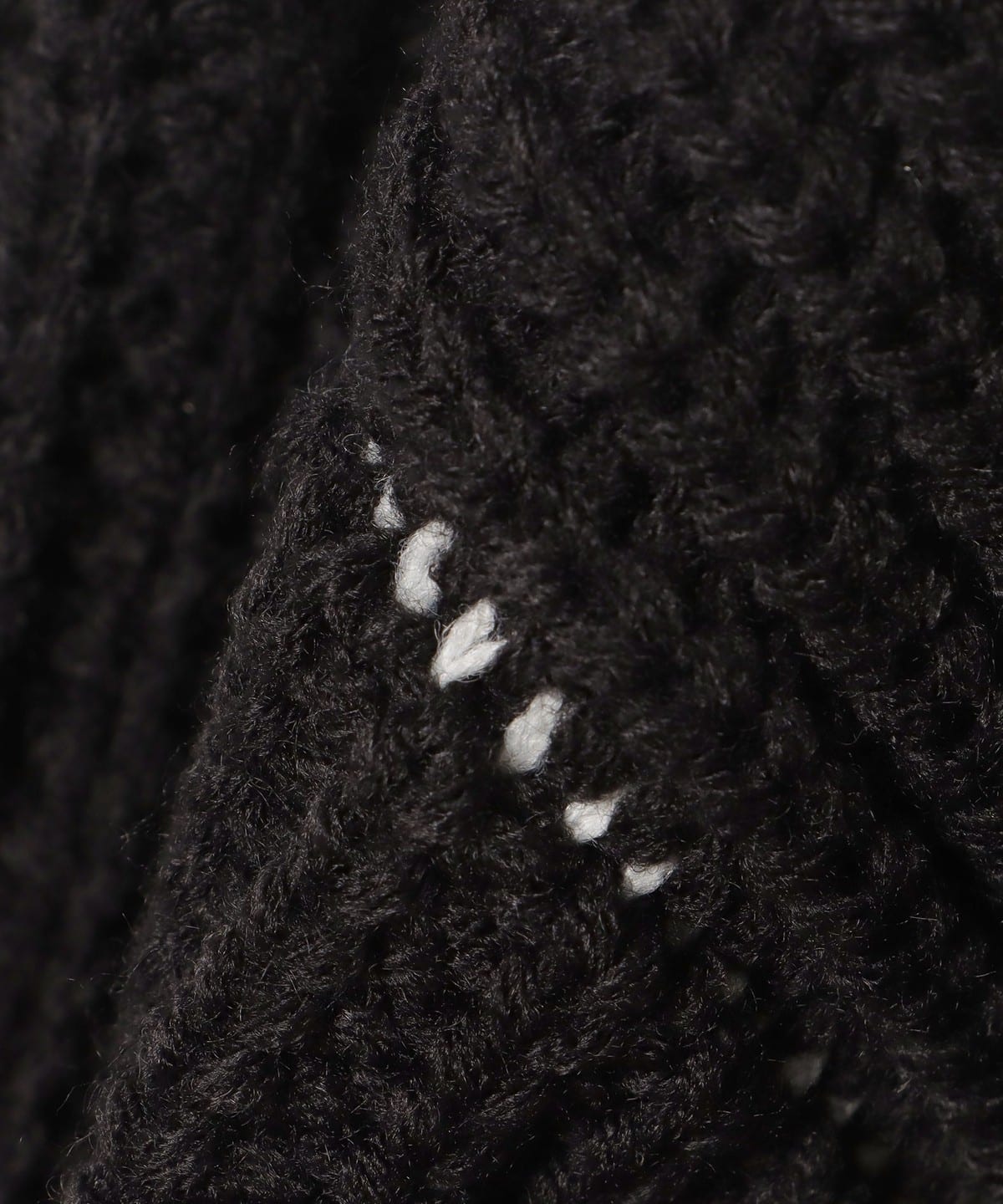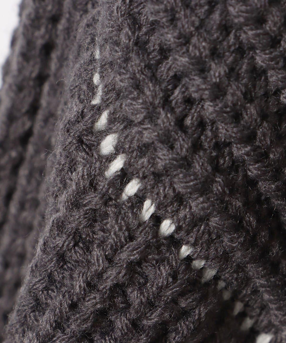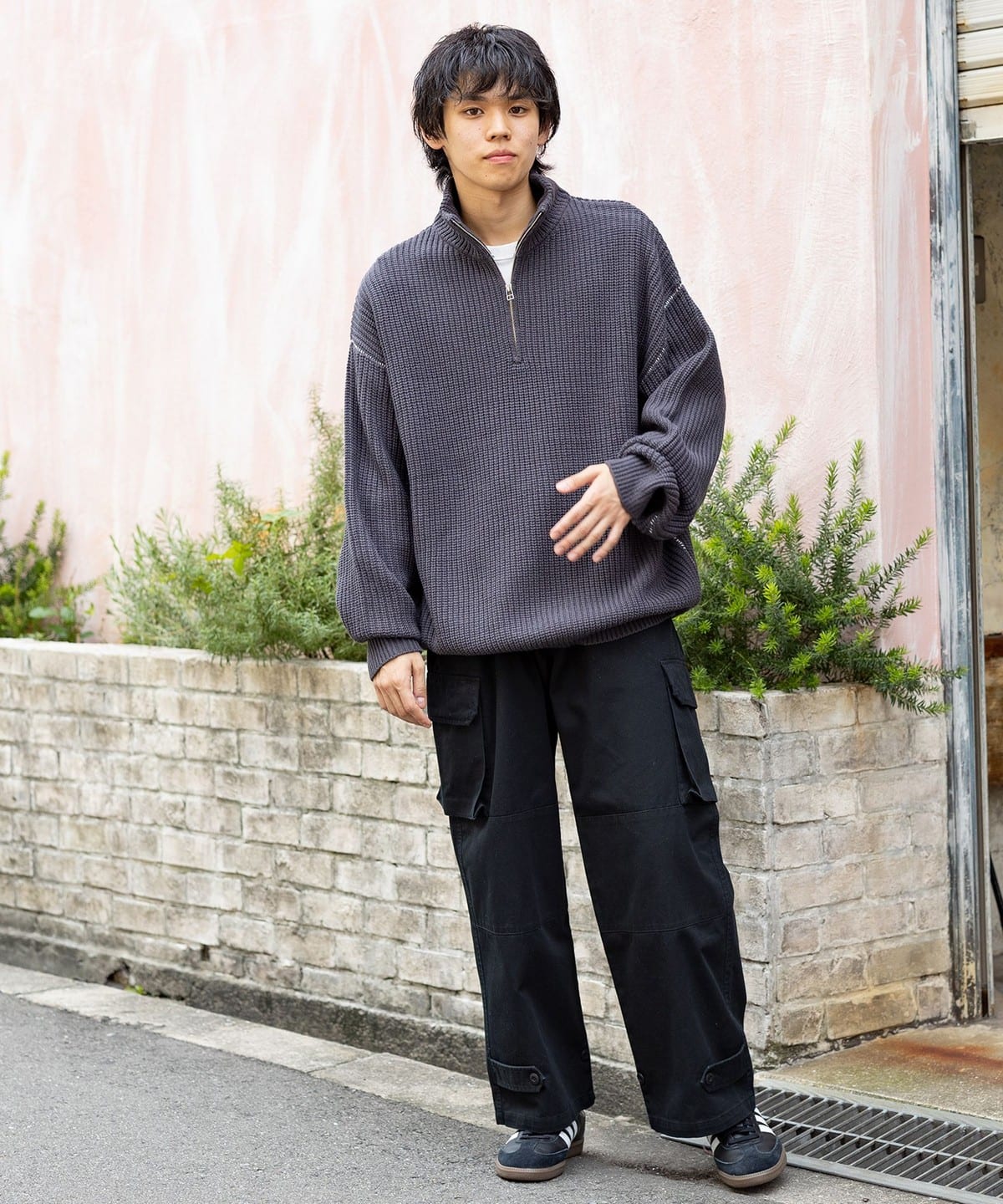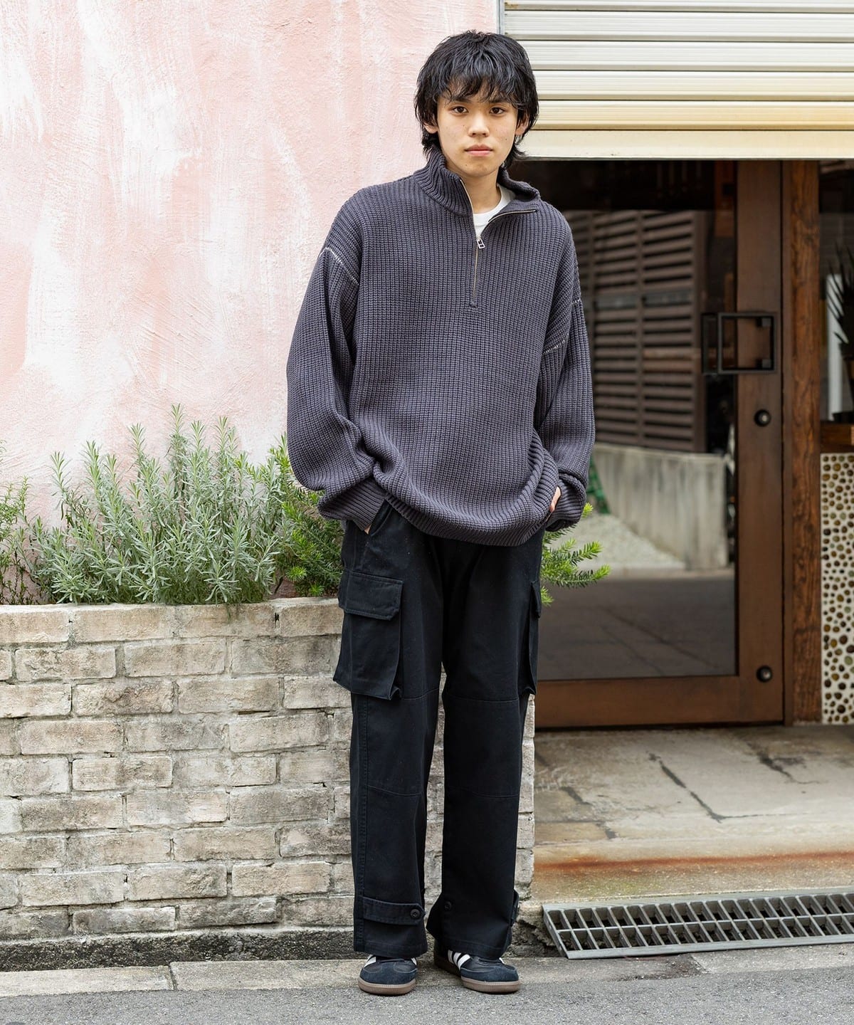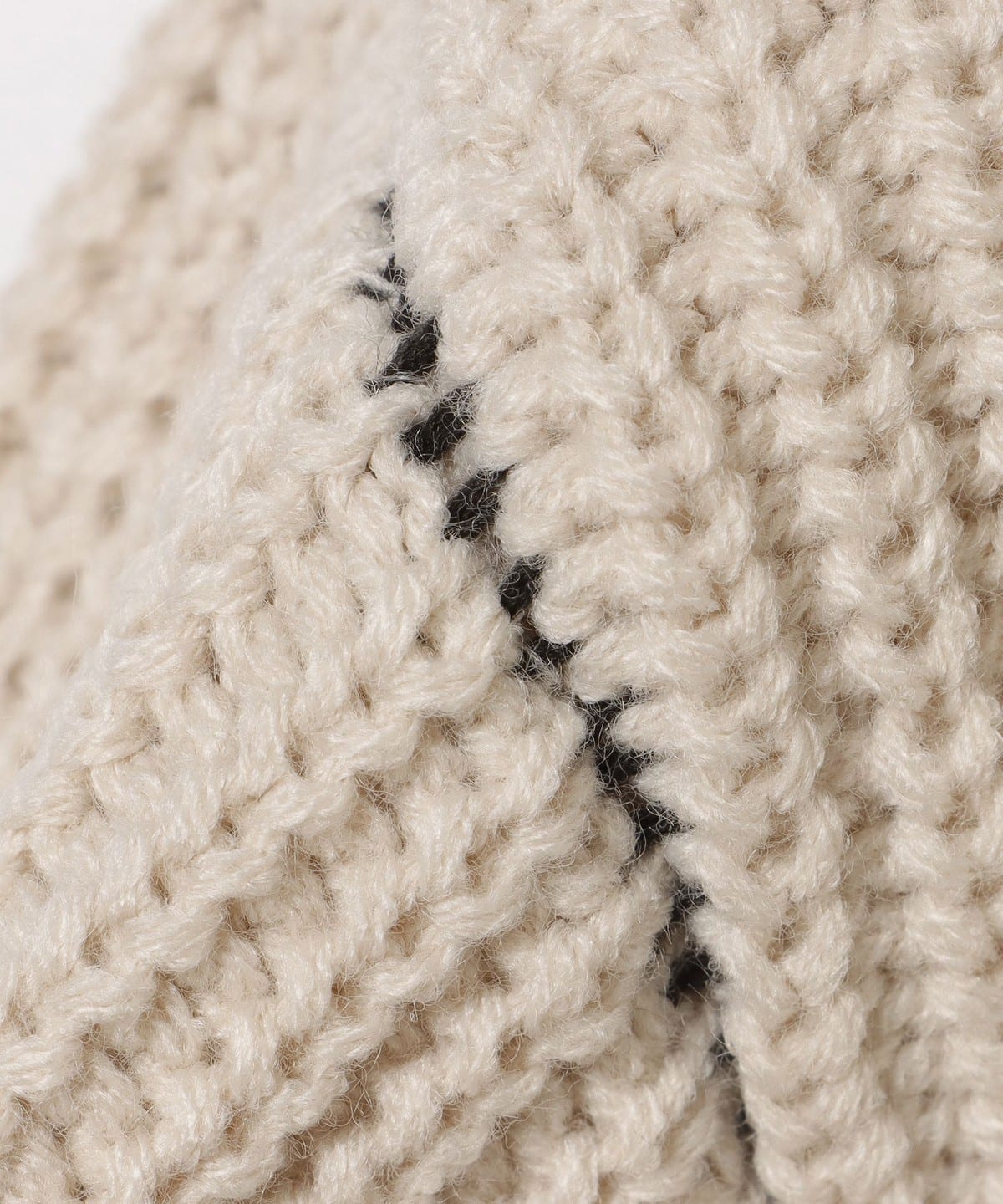 거친 니트 원단이 특징인 우아한 니트. 스탠드업 칼라, 하프 지퍼 디자인으로 부분적인 색상 포인트가 있습니다. 릴렉스핏