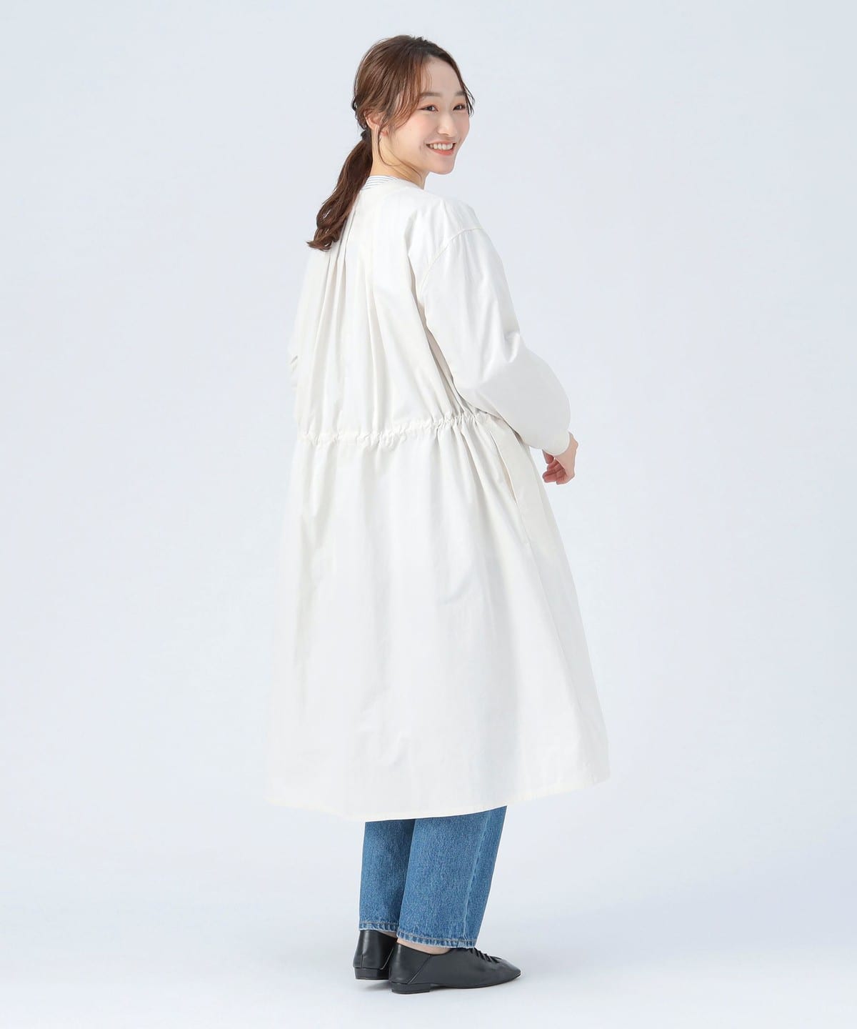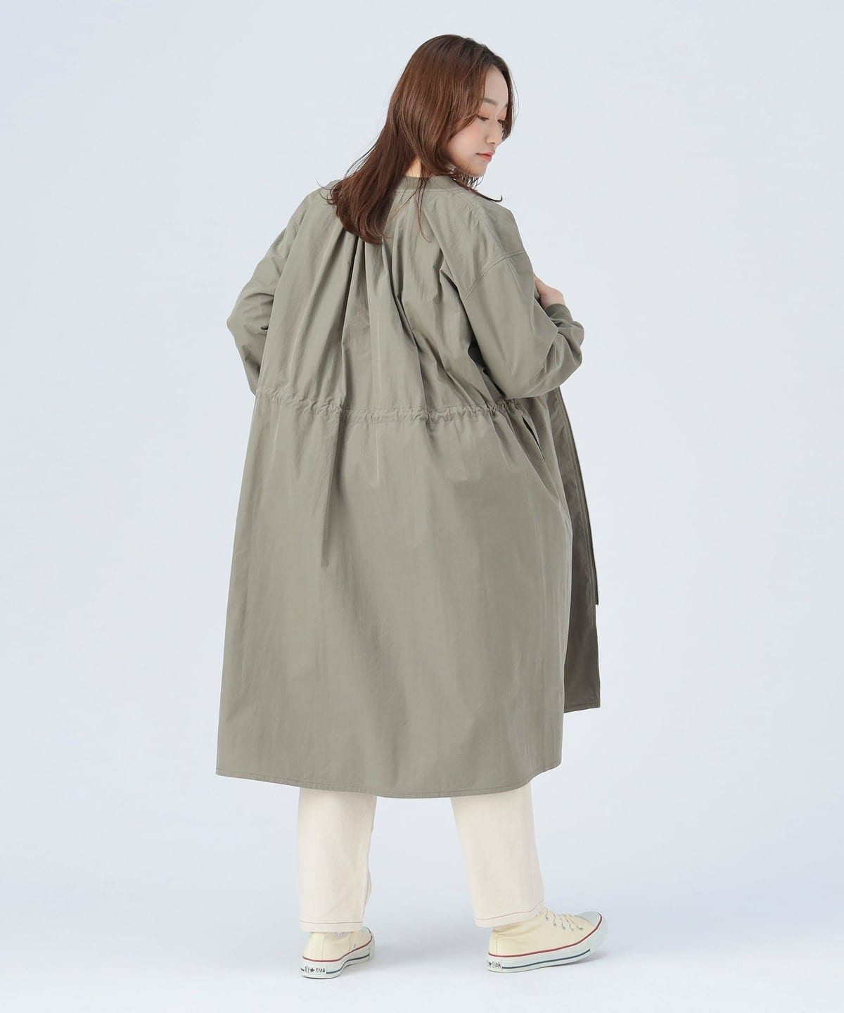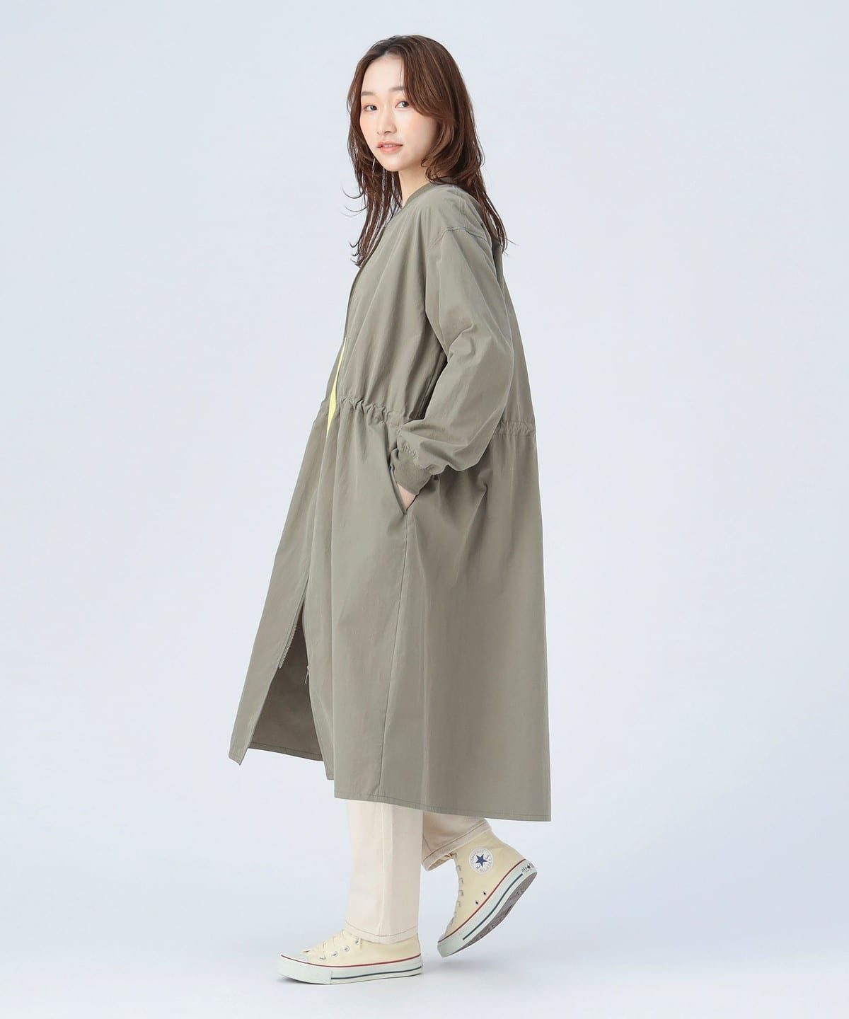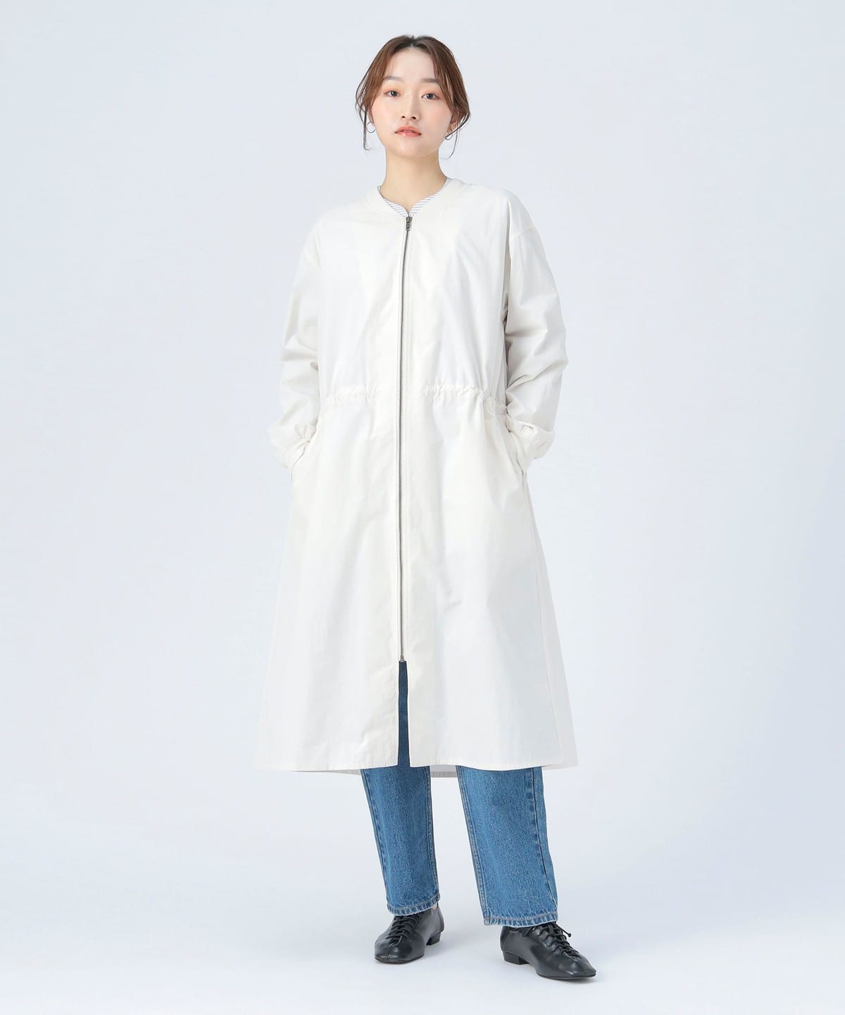 MA-1 점퍼의 디테일을 네크라인과 소매 리브에 적용한 롱 코트 입니다. 뒷면의 백 턱 디테일이 자연스러운 볼륨을 만들어 여유 있는 실루엣입니다. 전체적으로 오보사이즈 핏이며 허리는 드로우스트링으로 조절할 수 있습니다.