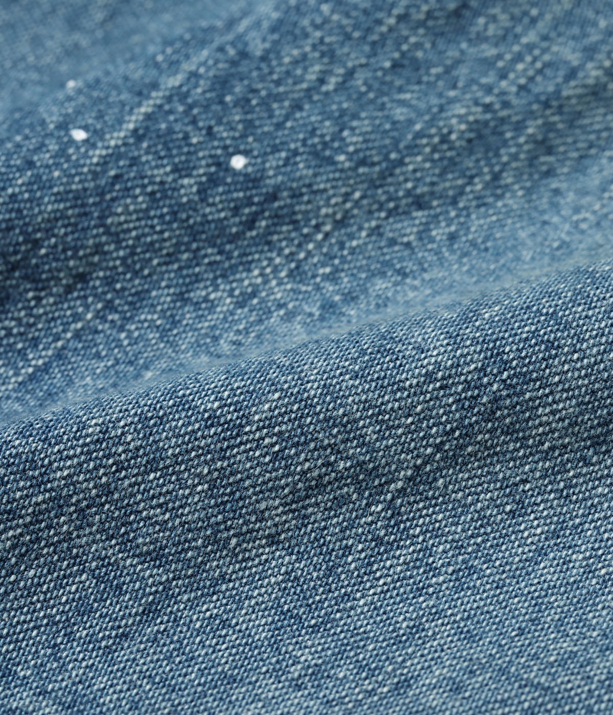 로프 염색한 인디고 실을 경사로, 회색 실을 위사로 사용하여 셔틀직기로 짜낸 블루 데님 워크 쇼츠입니다.