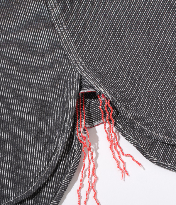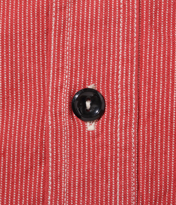 두꺼운 색의 실로 직조된 Jean cord(코드 스트라이프) 원단으로 만든 워크 셔츠. 질감은 약간 뻣뻣하고 단단한 마무리가 있습니다. 강도를 높이기 위해 이중 팔꿈치 원단이 있는 이중 팔꿈치 사양과 같은 작업복 고유의 디테일이 특징입니다.