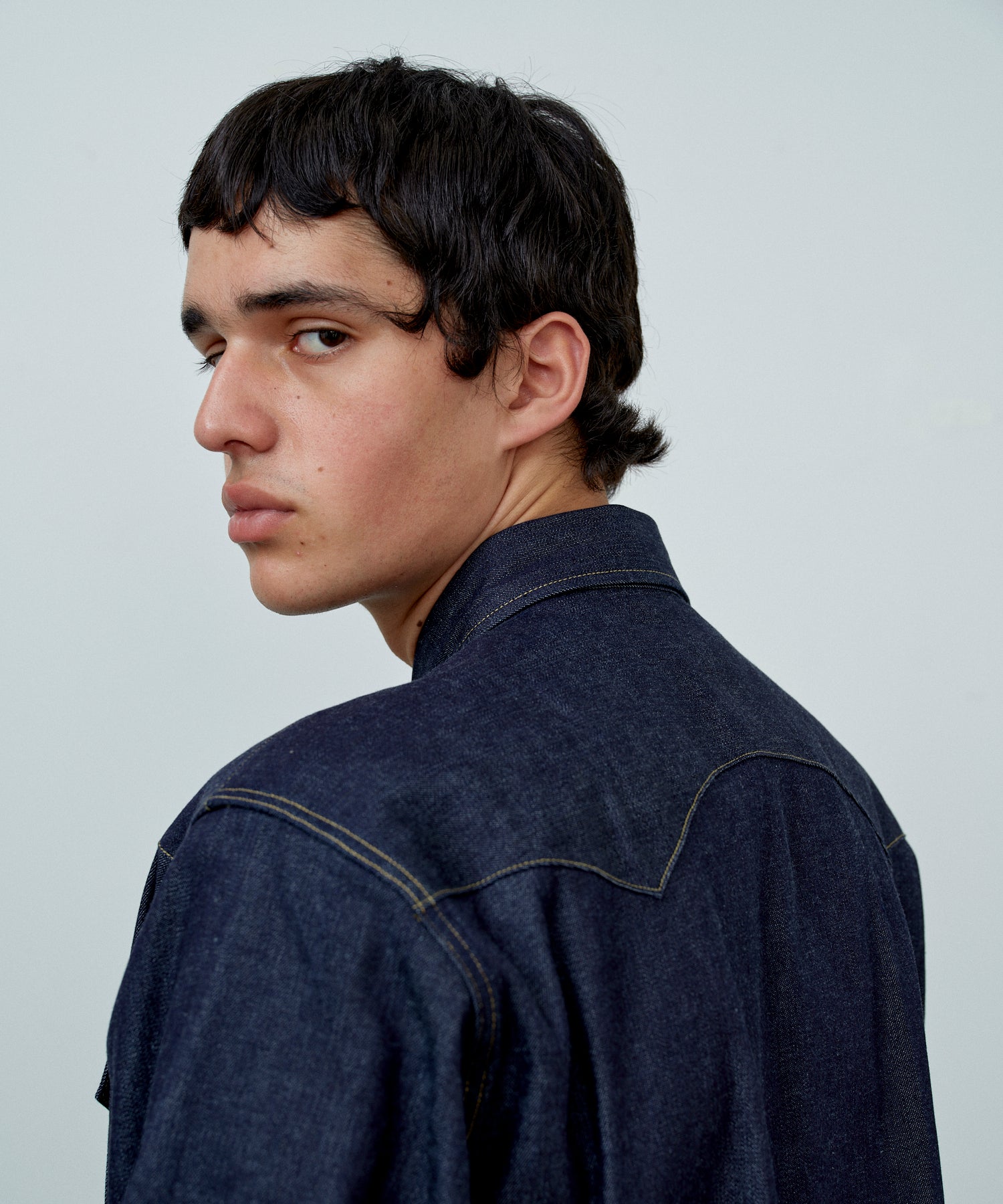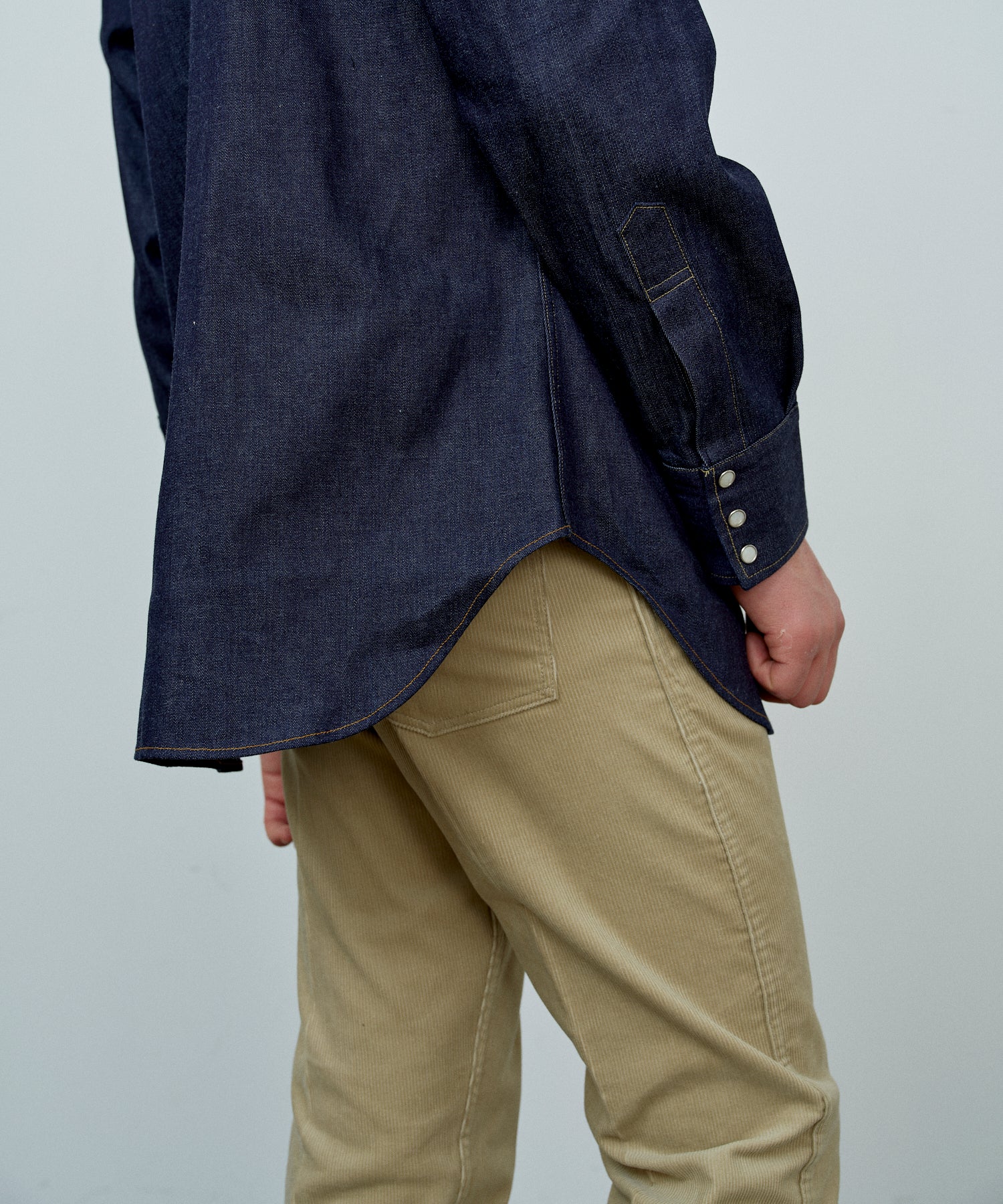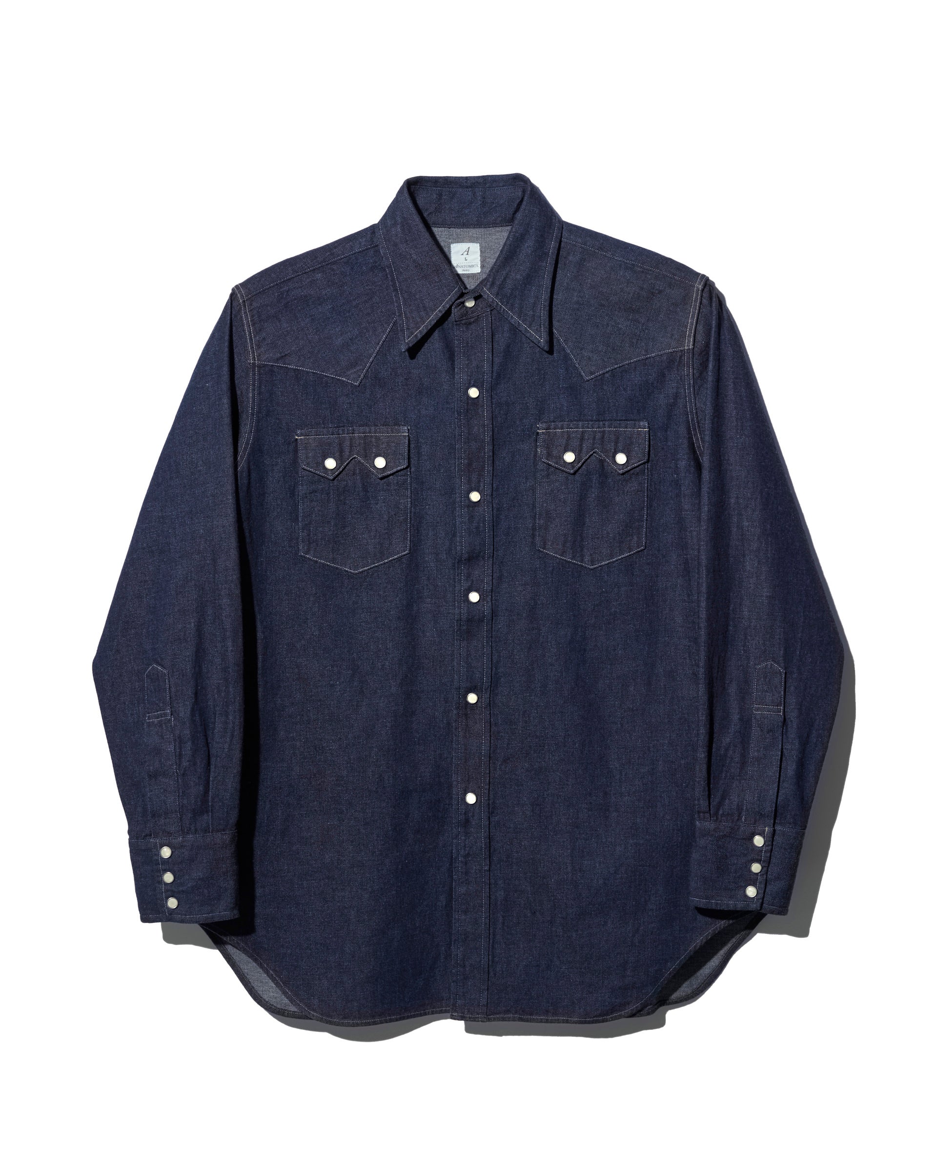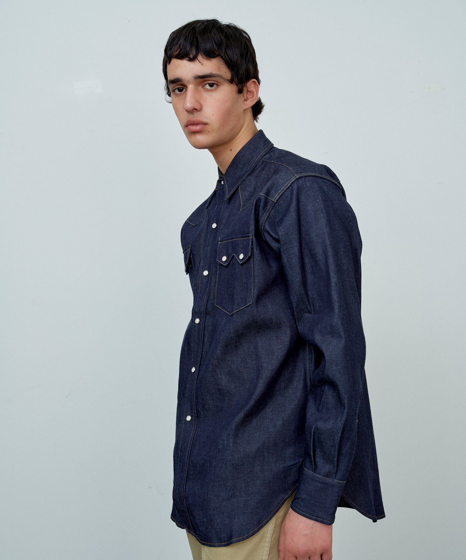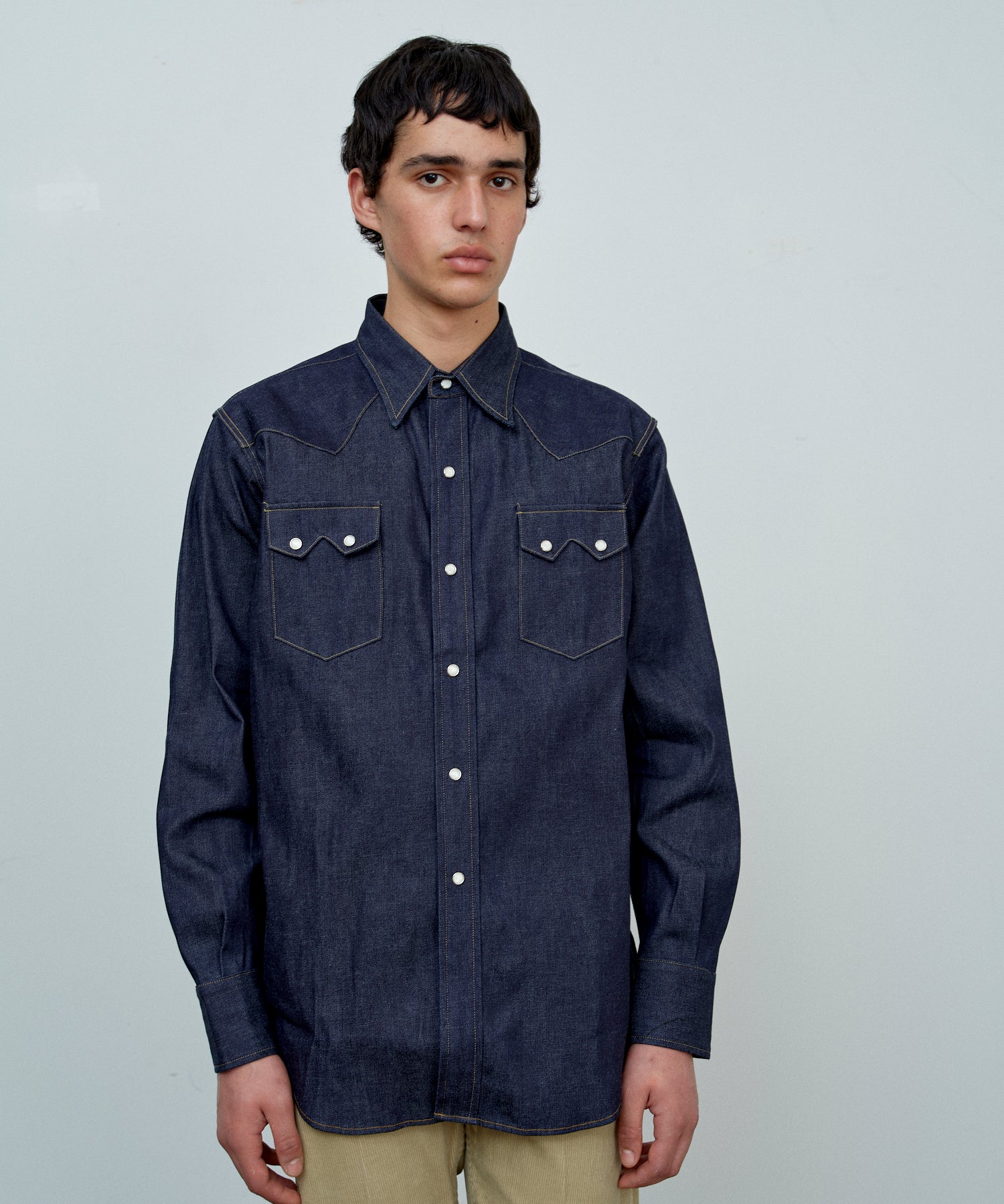 1950년대 웨스턴 셔츠를 베이스로 재구성한 모델입니다. 플랩이 달린 체스트 포켓, 요크 전환, 스냅 버튼 등 클래식한 디테일을 충실히 재현했습니다.