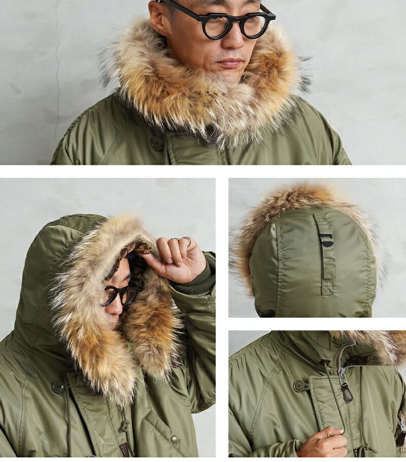 라그란 소매를 적용해 기존 플라이트 자켓보다 팔의 가동성이 좋고, 팔 라인에는 입체적인 주름 디테일을 넣어 볼륨감 있는 형태를 완성했습니다. 퍼는 볼륨감이 뛰어난 고급 라쿤 퍼를 사용해 풍성한 실루엣을 제공합니다.