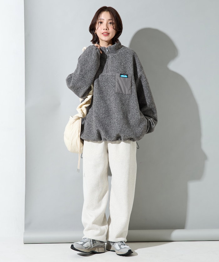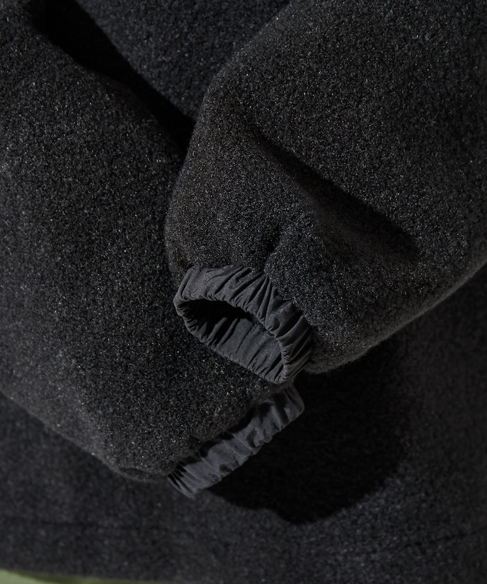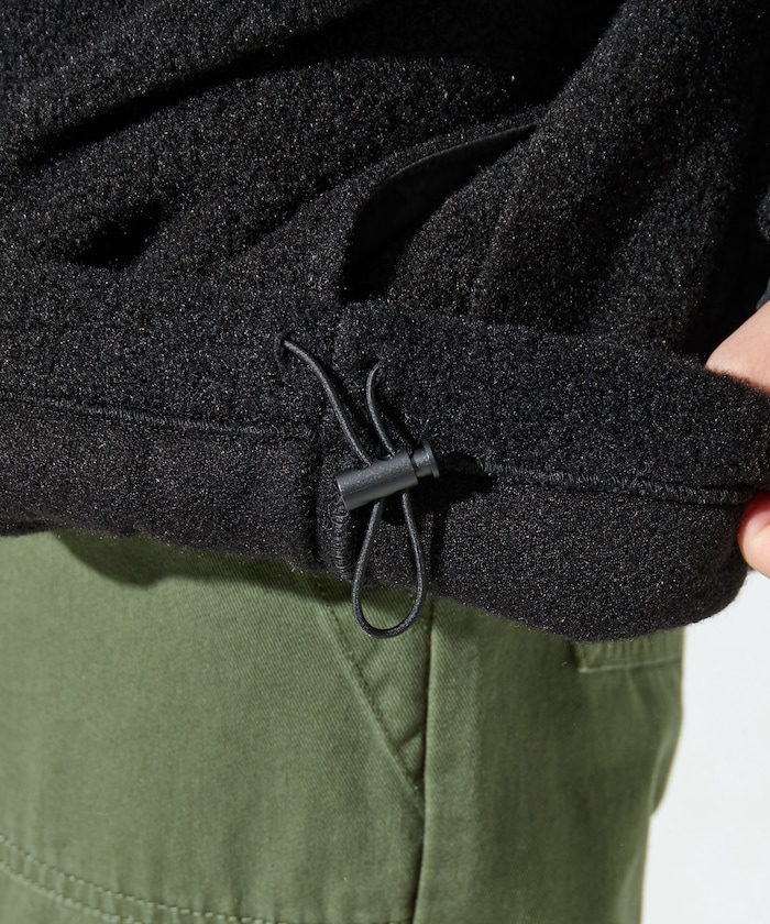 가볍고 따뜻한, 짧은 털감의 보아 소재 하프집 아노락. 가슴 포켓에 로고 라벨 포인트가 있습니다. 밑단 드로우코드로 실루엣 조절이 가능하며 여유 있는 빅 실루엣로 체형을 커버할 수 있습니다.