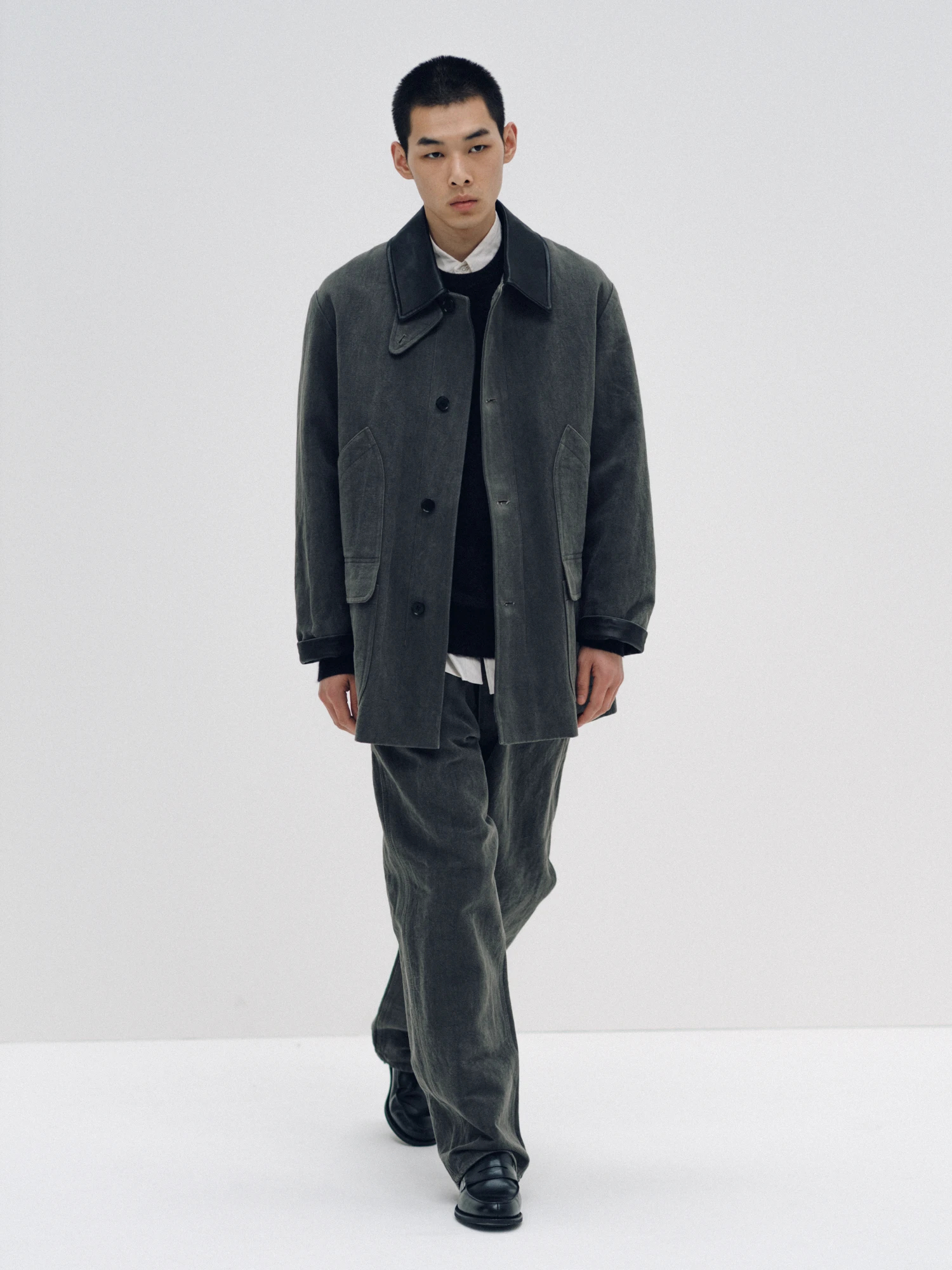 전통적인 일본 염료인 먹과 감즙탄닌으로 염색한 후, 장력을 주지 않고 여러 차례 워싱 처리하여 풍성한 볼륨감을 살렸습니다.