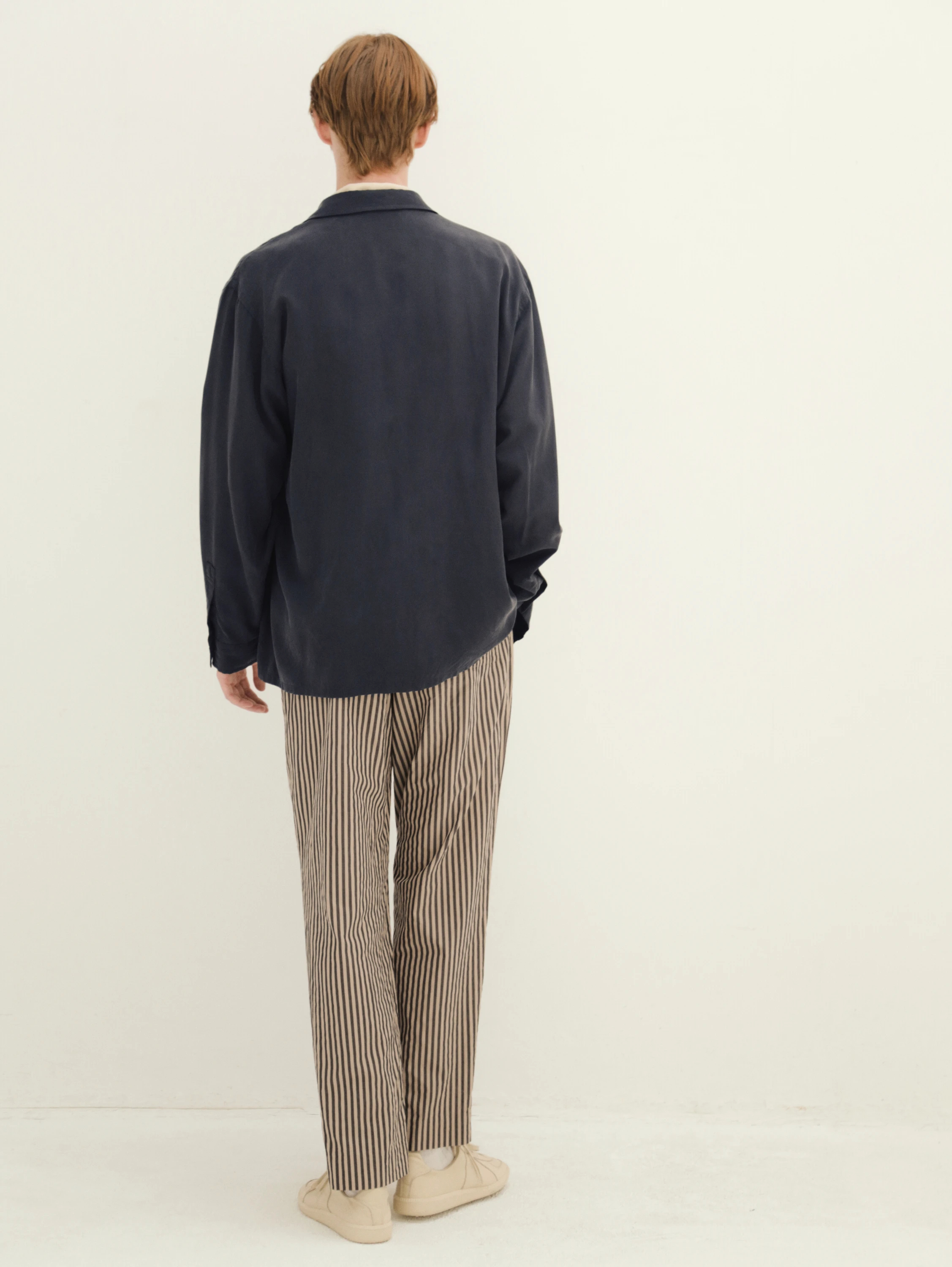 원단을 충분히 워싱한 뒤 가볍게 기모 가공을 더해, 실크 특유의 부드럽고 미끄러지는 듯한 촉감과 함께, 적당한 탄력감과 내구성, 그리고 은은하게 눌린 듯한 매트한 광택감을 동시에 구현한 것이 특징입니다.