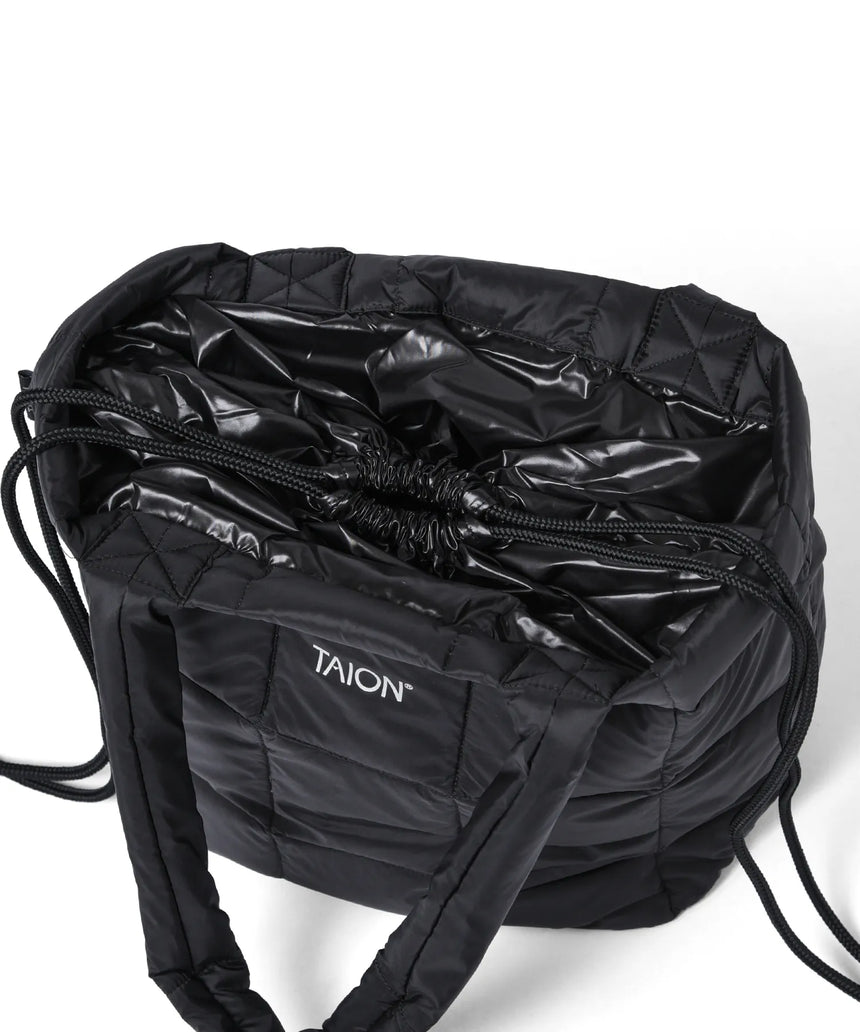 앞면 상단에 작은 타이온 로고가 있는 다운 런치 토트백. 내부에 드로우스트링으로 열고 닫을 수 있습니다.