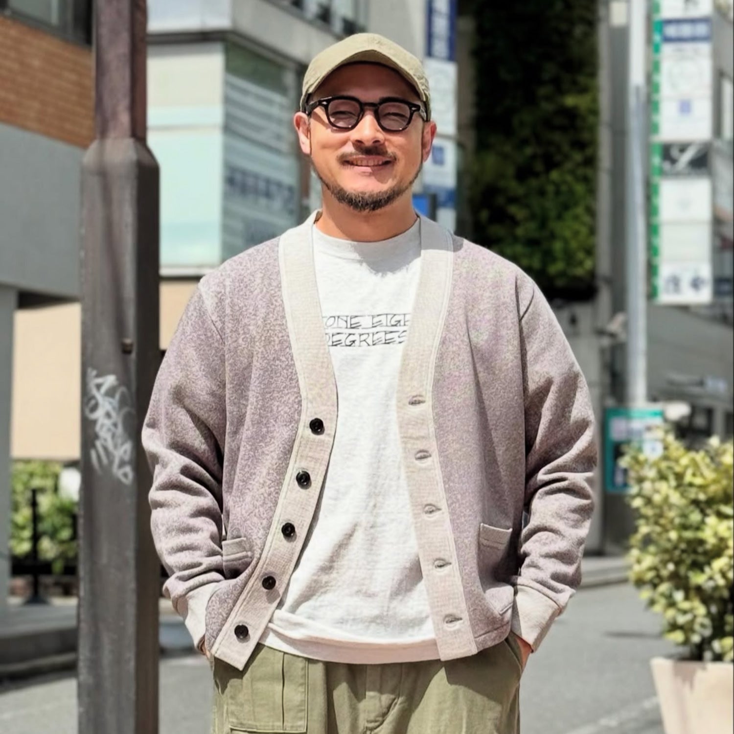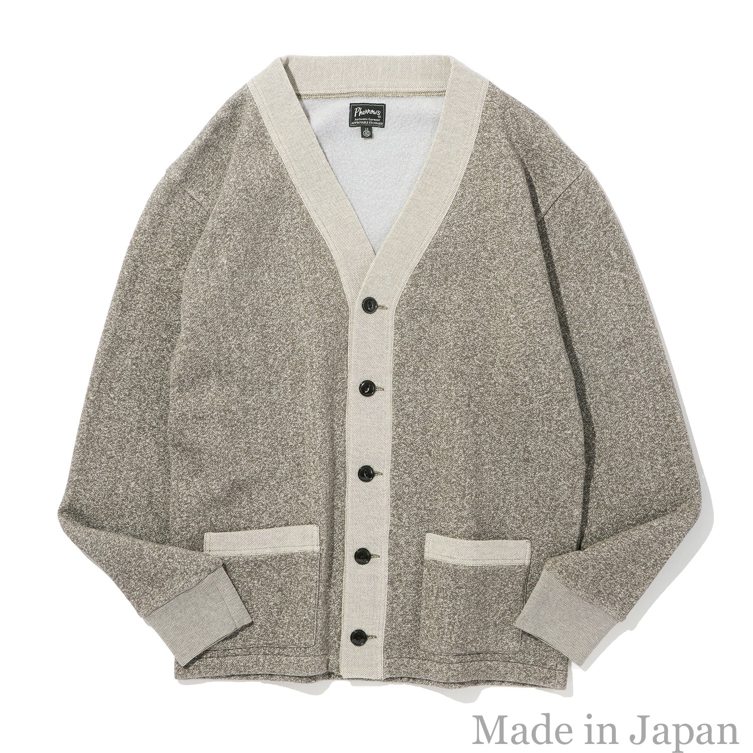 몸판에는 기모 안감 스웨트 원단, 칼라 부분에는 피케 소재, 소매에는 리브 원단을 사용한 가디건. 빈티지에서 볼 수 있는 캣츠아이 버튼을 사용합니다.
