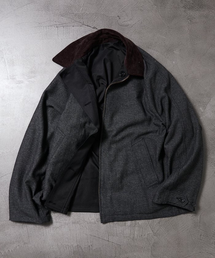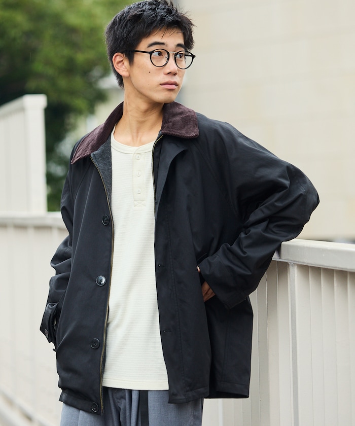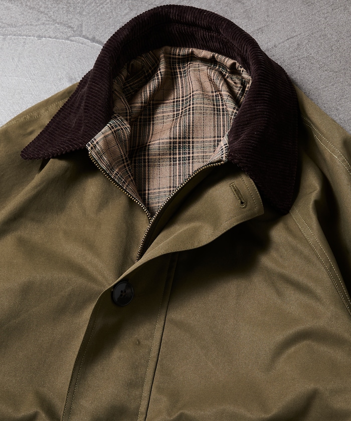 코듀로이 카라, 래글런 슬리브, 히든 버튼 전면 여밈의 디테일이 있습니다.