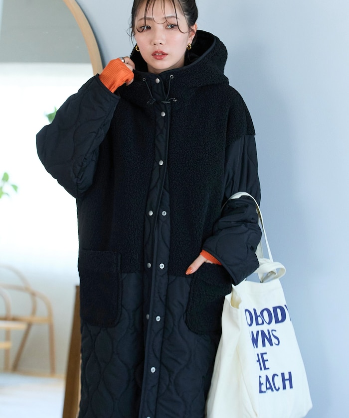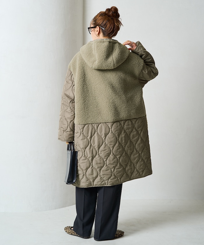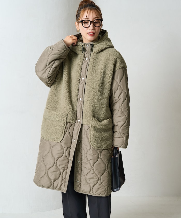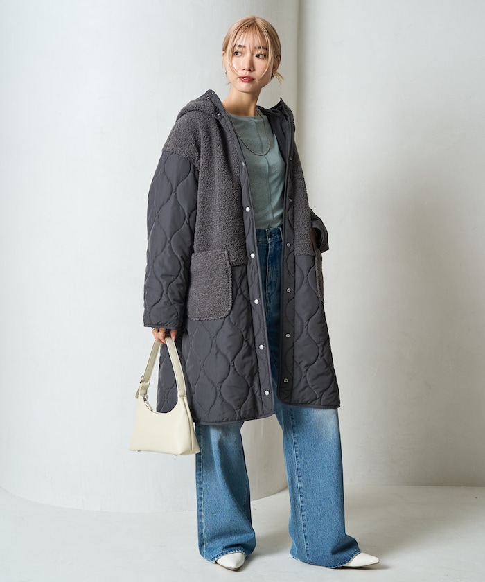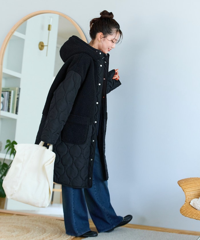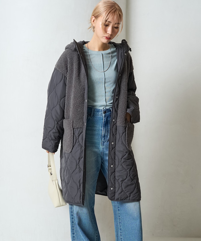 보아와 퀼팅을 조합한 디자인이 계절 분위기를 잘 살려주는 롱코트 입니다. 스냅 버튼을 사용하여 열고 닫기 쉬운 구조이며 리에어드 하기 좋은 빅실루엣 입니다.