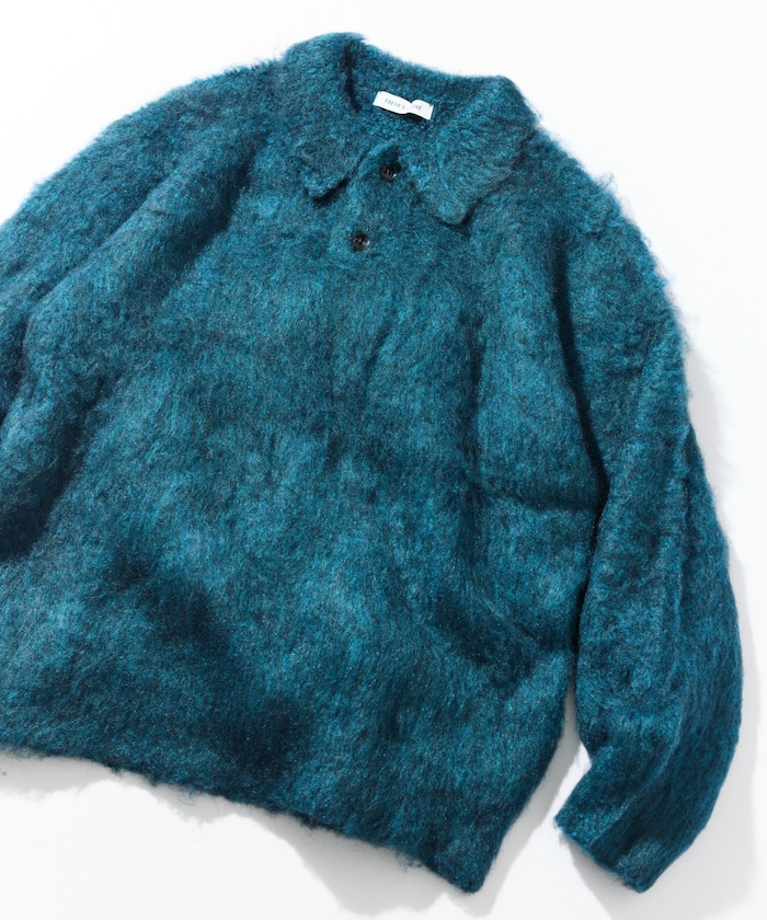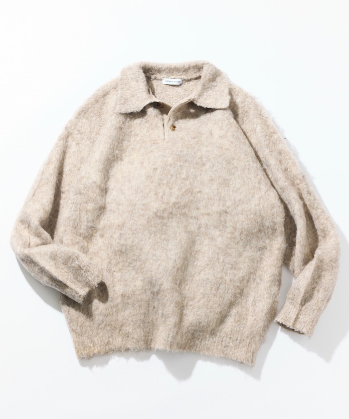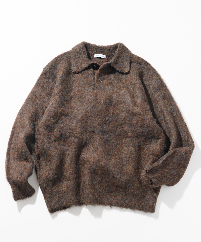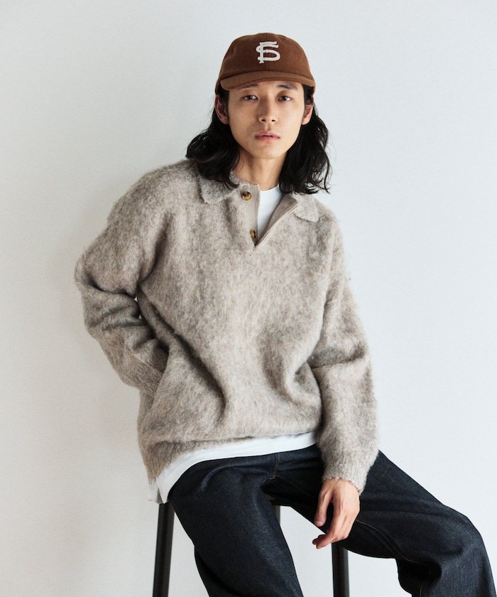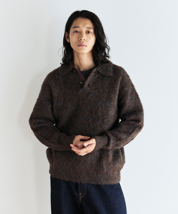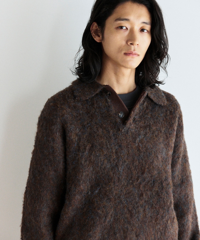 적당한 기모감과 부드러운 촉감의 폴로 니트. 샤기 소재 특유의 포근하고 고급스러운 질감으로 따뜻한 분위기입니다.