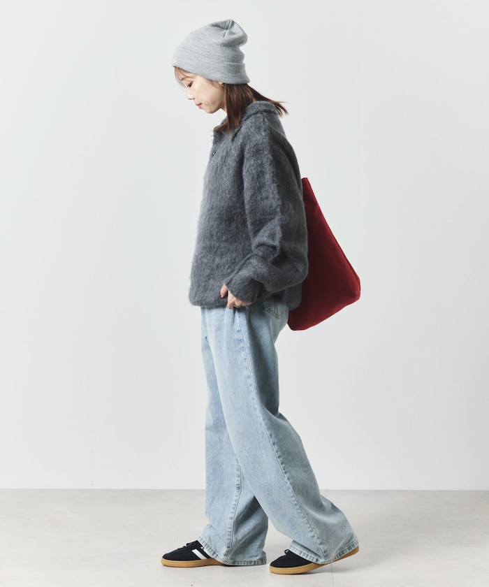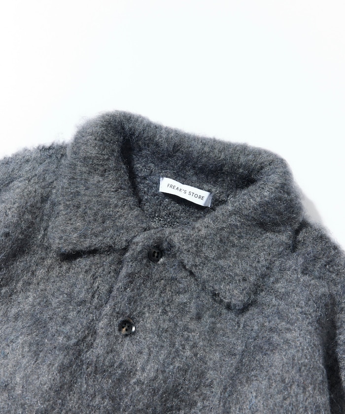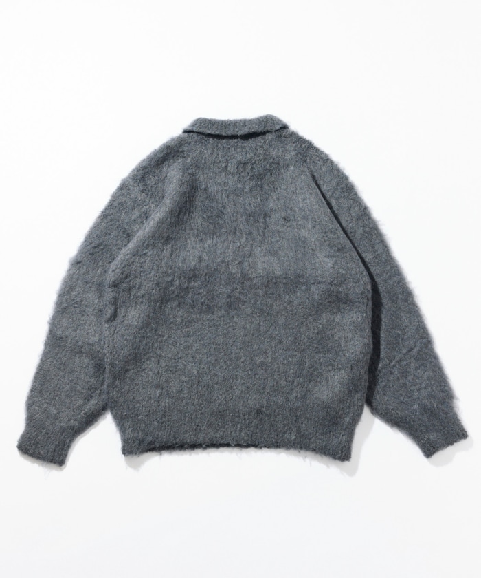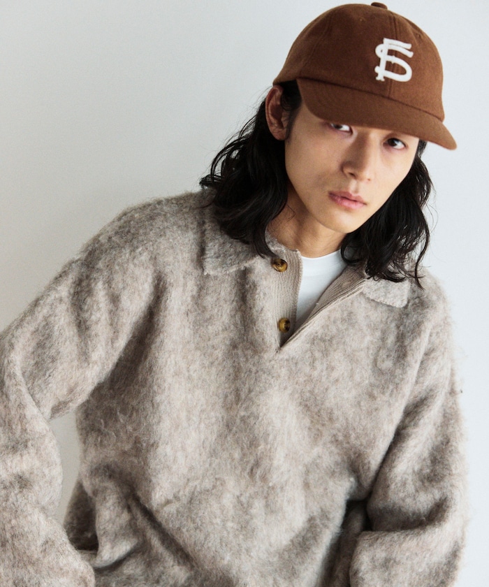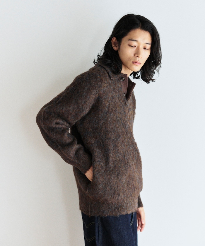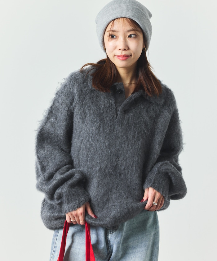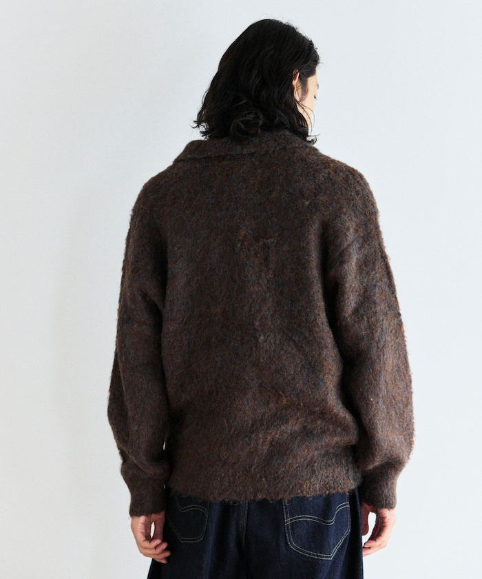 적당한 기모감과 부드러운 촉감의 폴로 니트. 샤기 소재 특유의 포근하고 고급스러운 질감으로 따뜻한 분위기입니다.