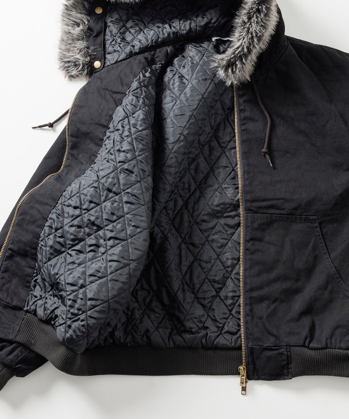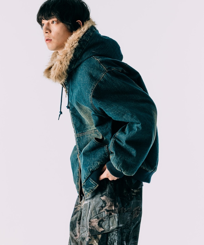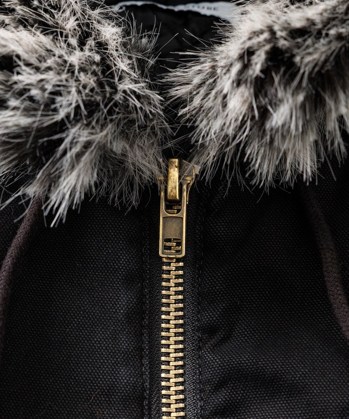 밀리터리 무드의 디자인에 페이크 퍼 후드는 탈착 가능합니다.