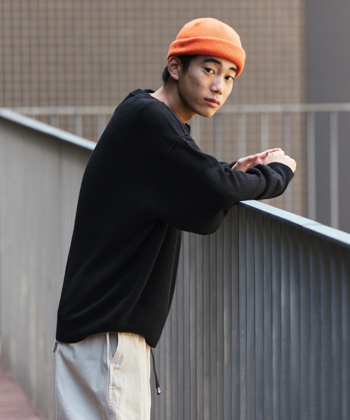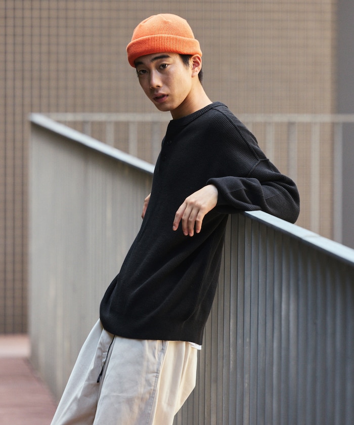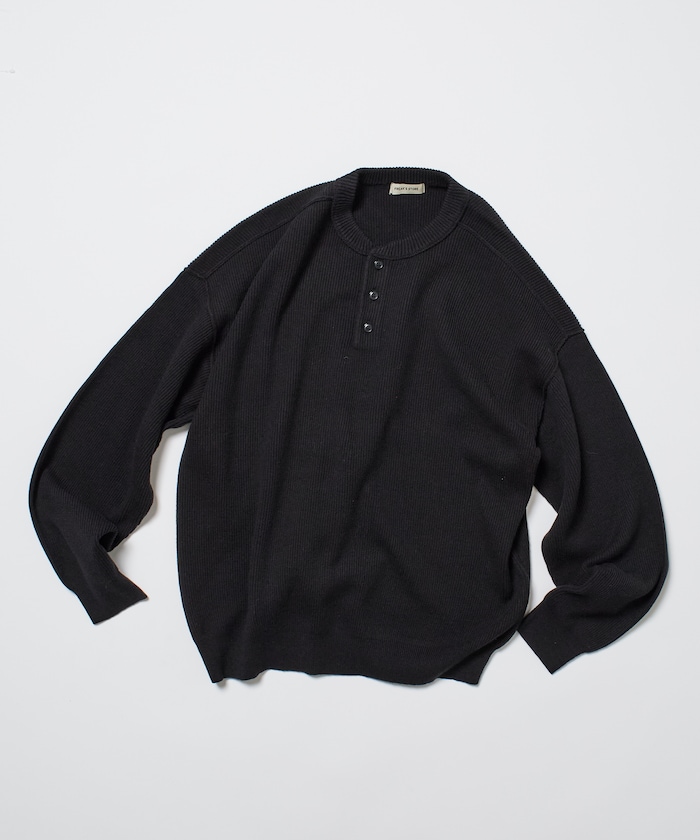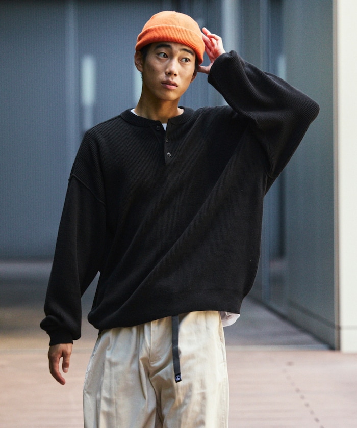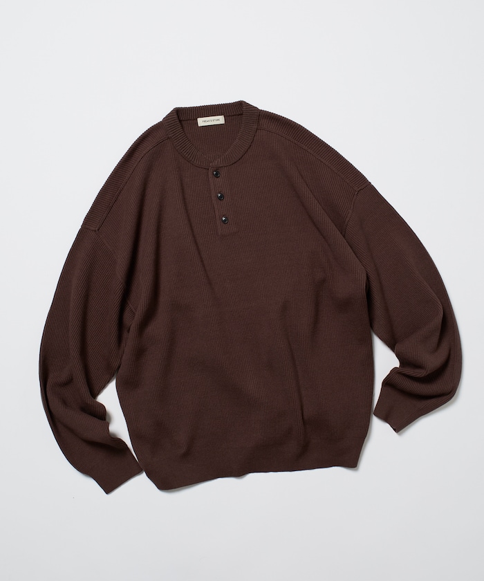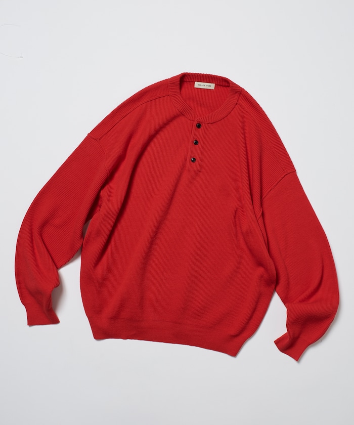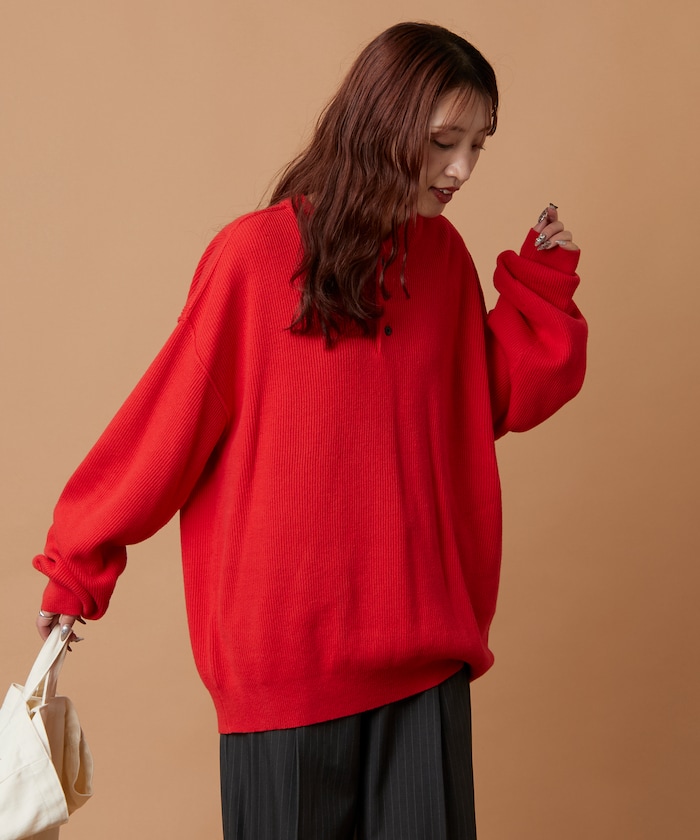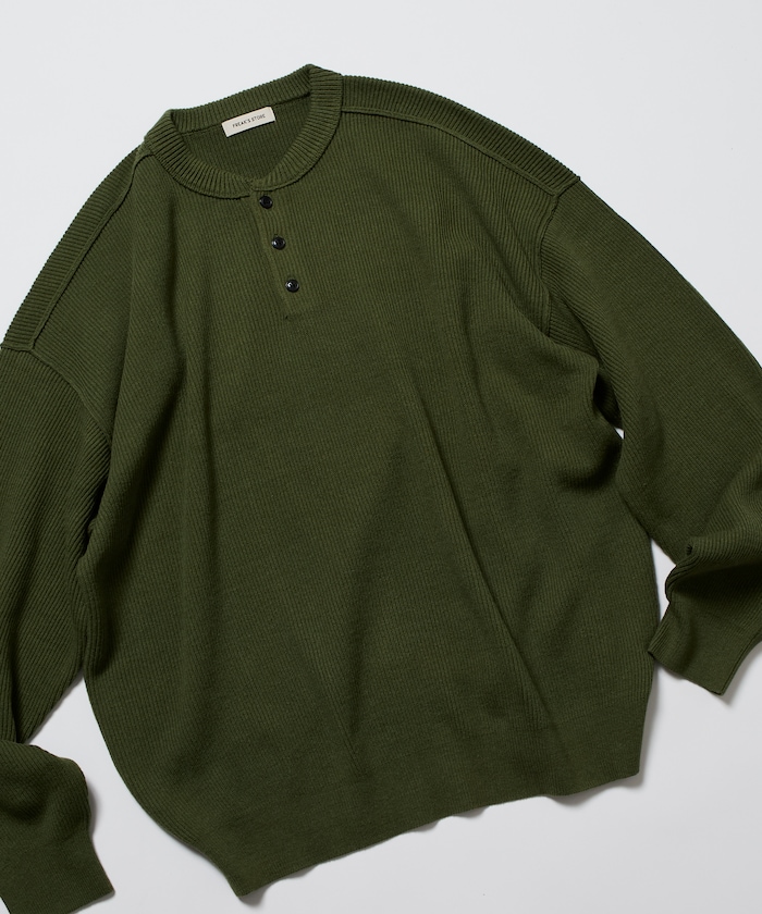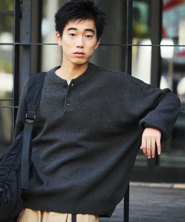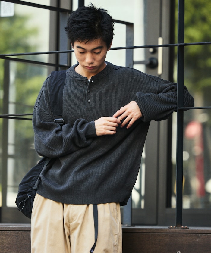 여유 있는 실루엣과 부드러운 촉감의 헨리넥 니트입니다. 적당한 두께와 신축성을 지닌 편직 구조로 편안한 착용감입니다.