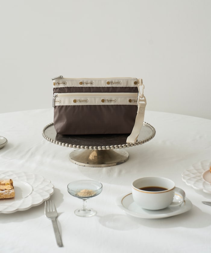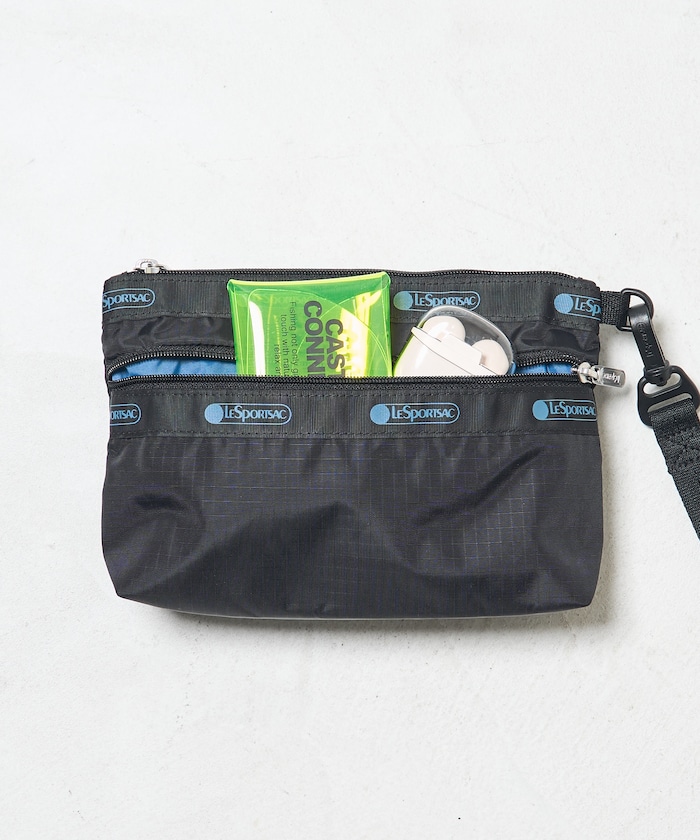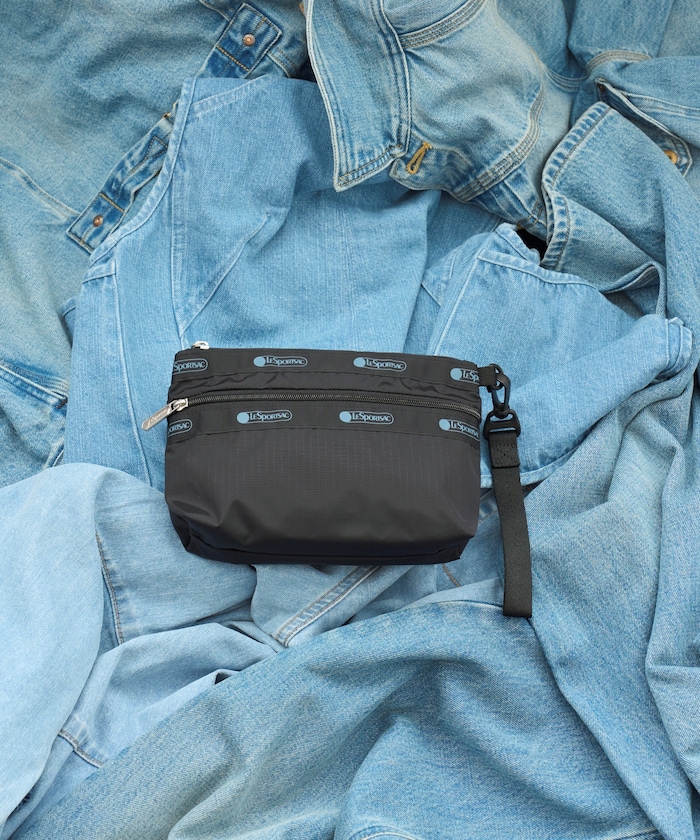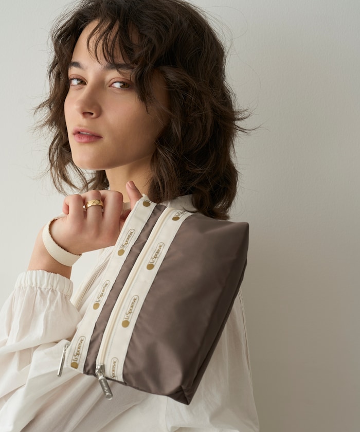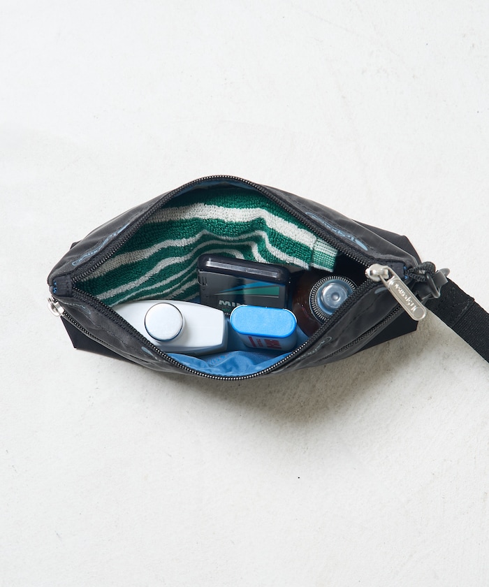 화장품이나 소지품을 깔끔하게 수납할 수 있는 사이즈로, 가방 안 파우치로는 물론 손목에 걸어 미니백처럼 활용 가능한 파우치.