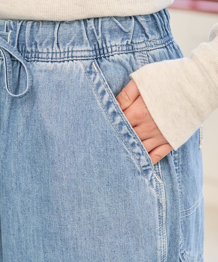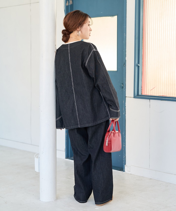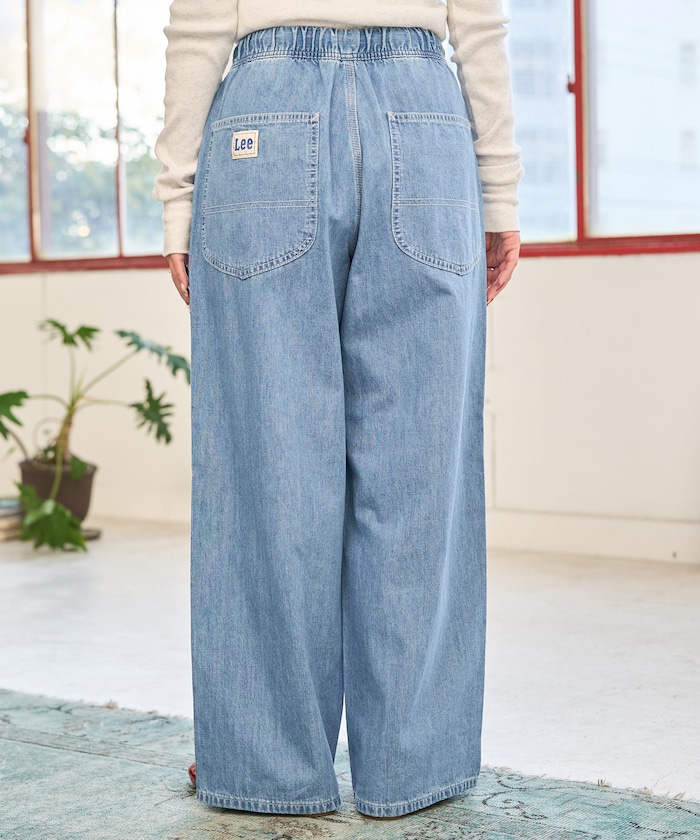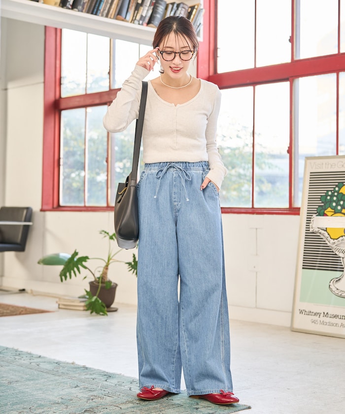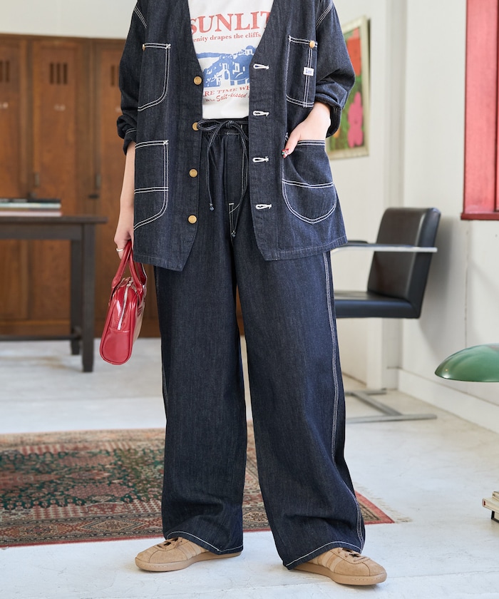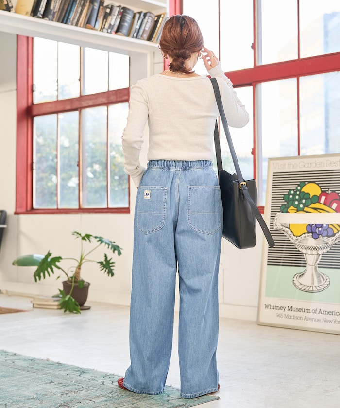 티셔츠나 블라우스 등 캐주얼한 상의와 잘 어울리는 와이드 스트레이트 실루엣의 이지 팬츠. 배색 스티치와 큼직한 힙 포켓 디자인이며 여름까지 시원하게 입을 수 있는 라이트온스 소재를 사용합니다.