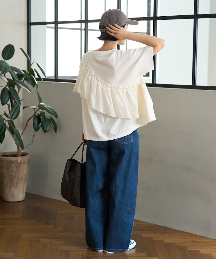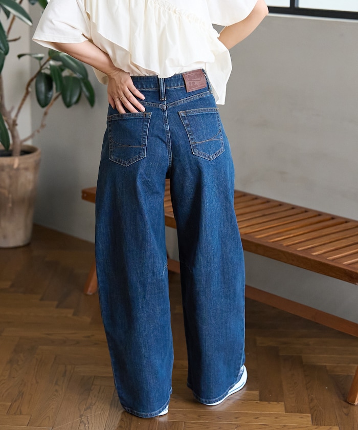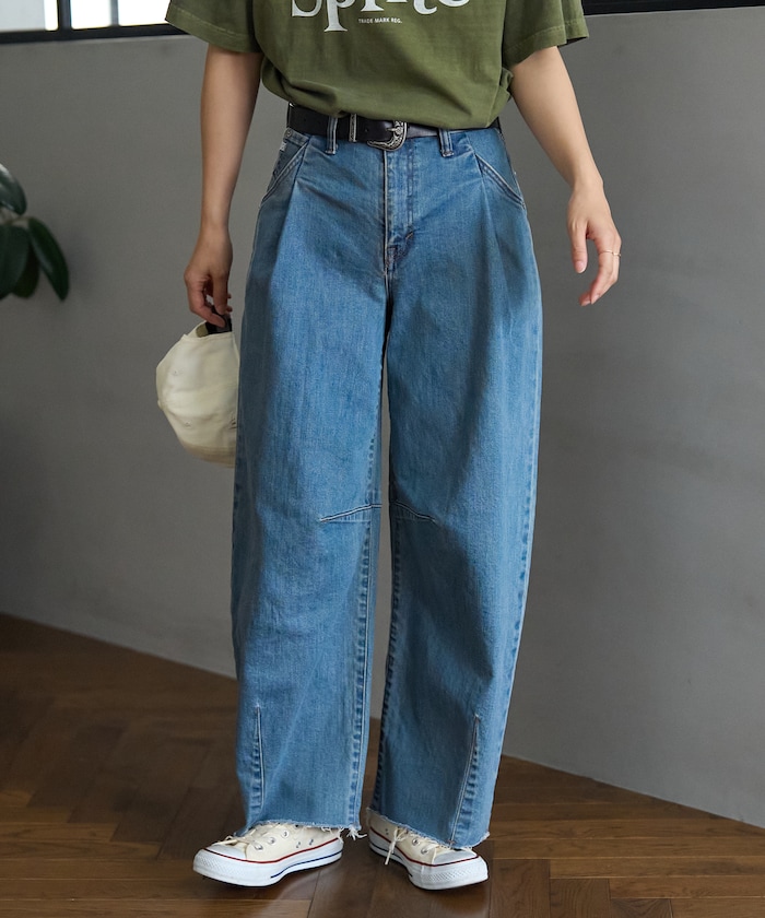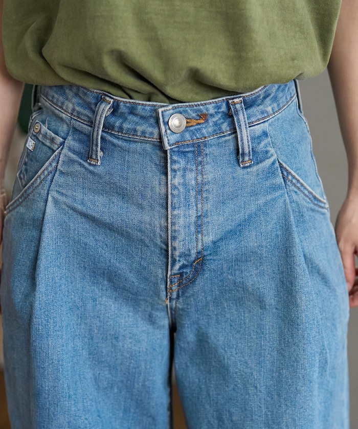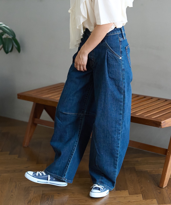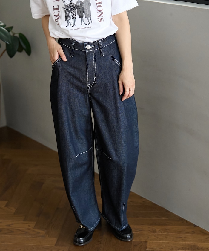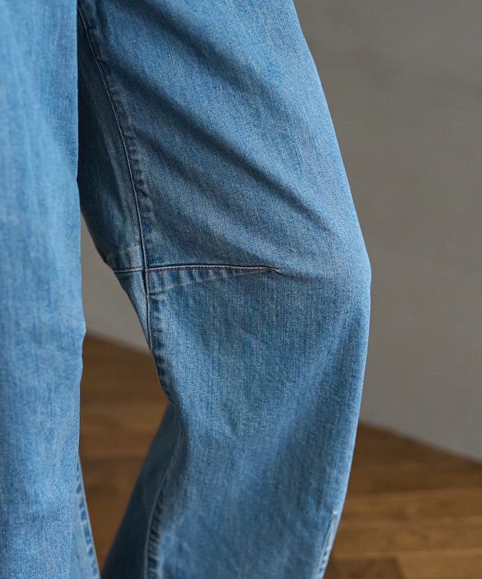 허리에 핀턱 디테일, 무릎과 밑단의 다트 디테일로 입체적인 곡선 실루엣의 데님 팬츠.