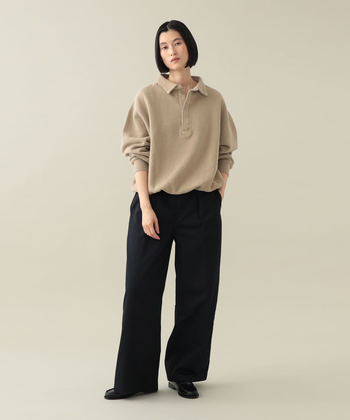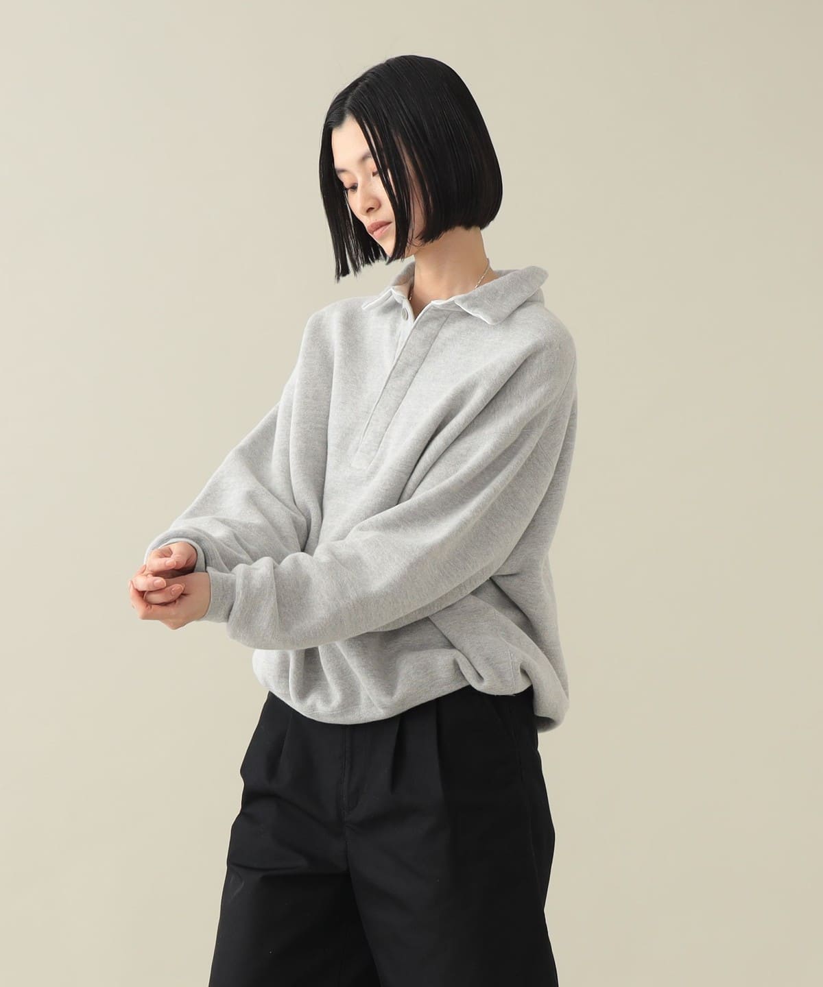 여유로운 실루엣을 바탕으로, 카라 디테일과 하프 버튼 디자인의 스웨트 티.