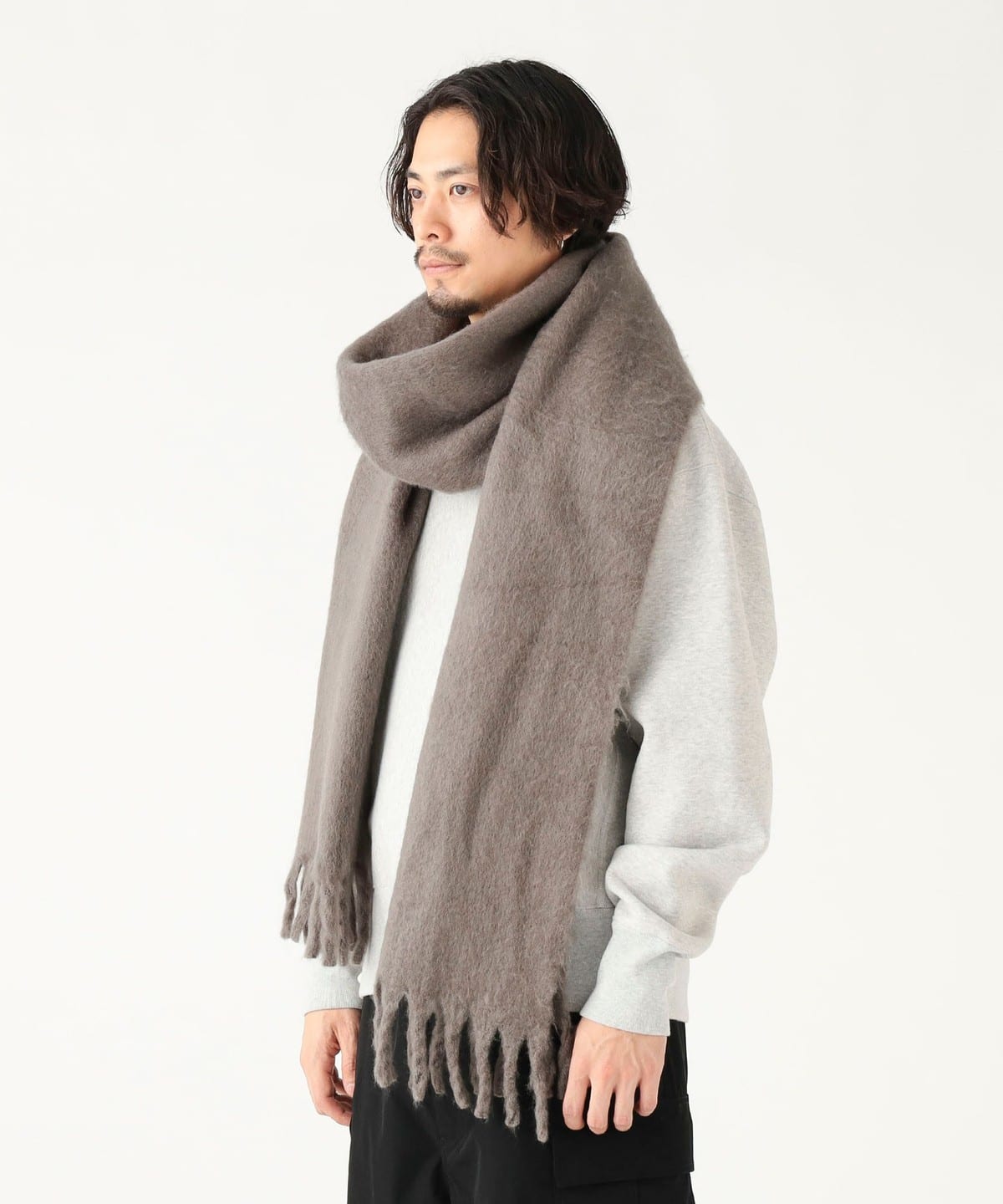 프린지가 돋보이는 샤기 머플러. 도톰한 질감과 대형 사이즈가 특징입니다.