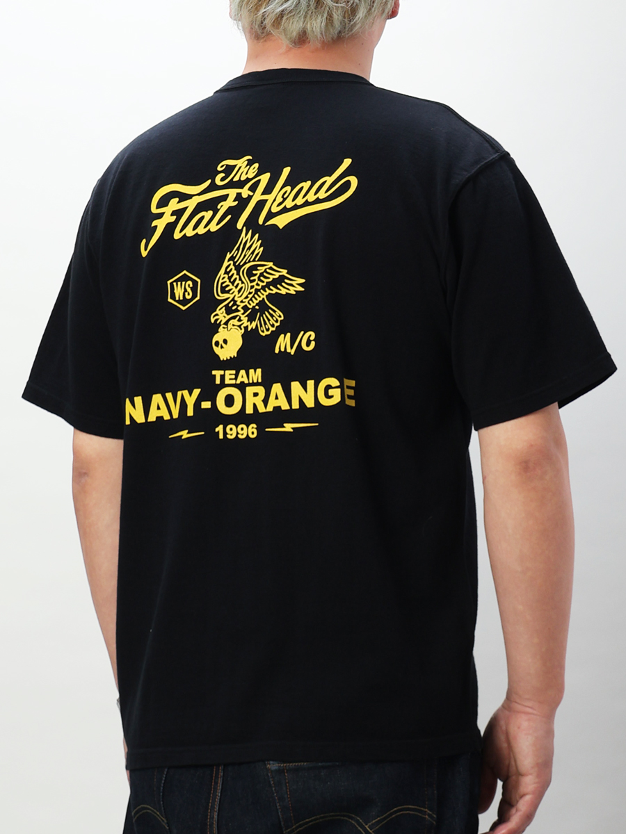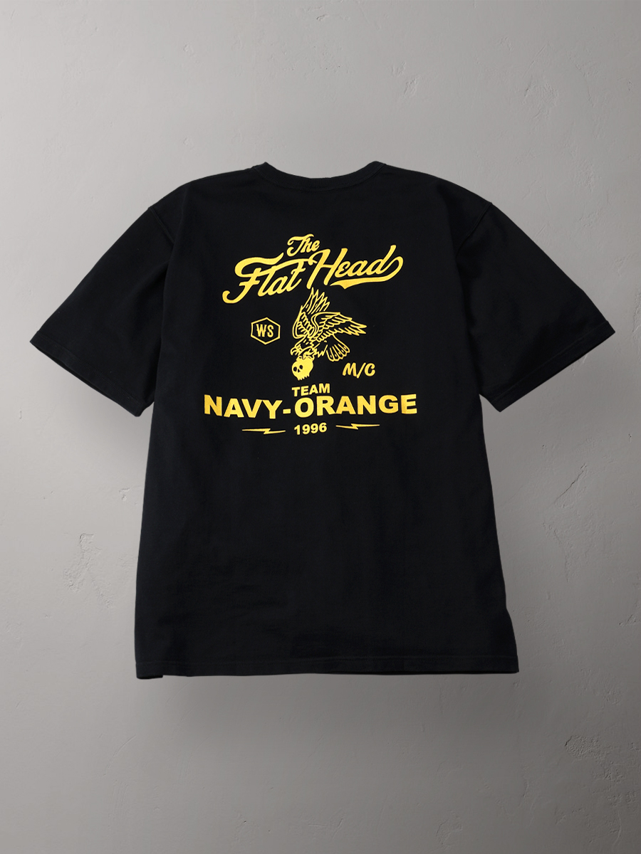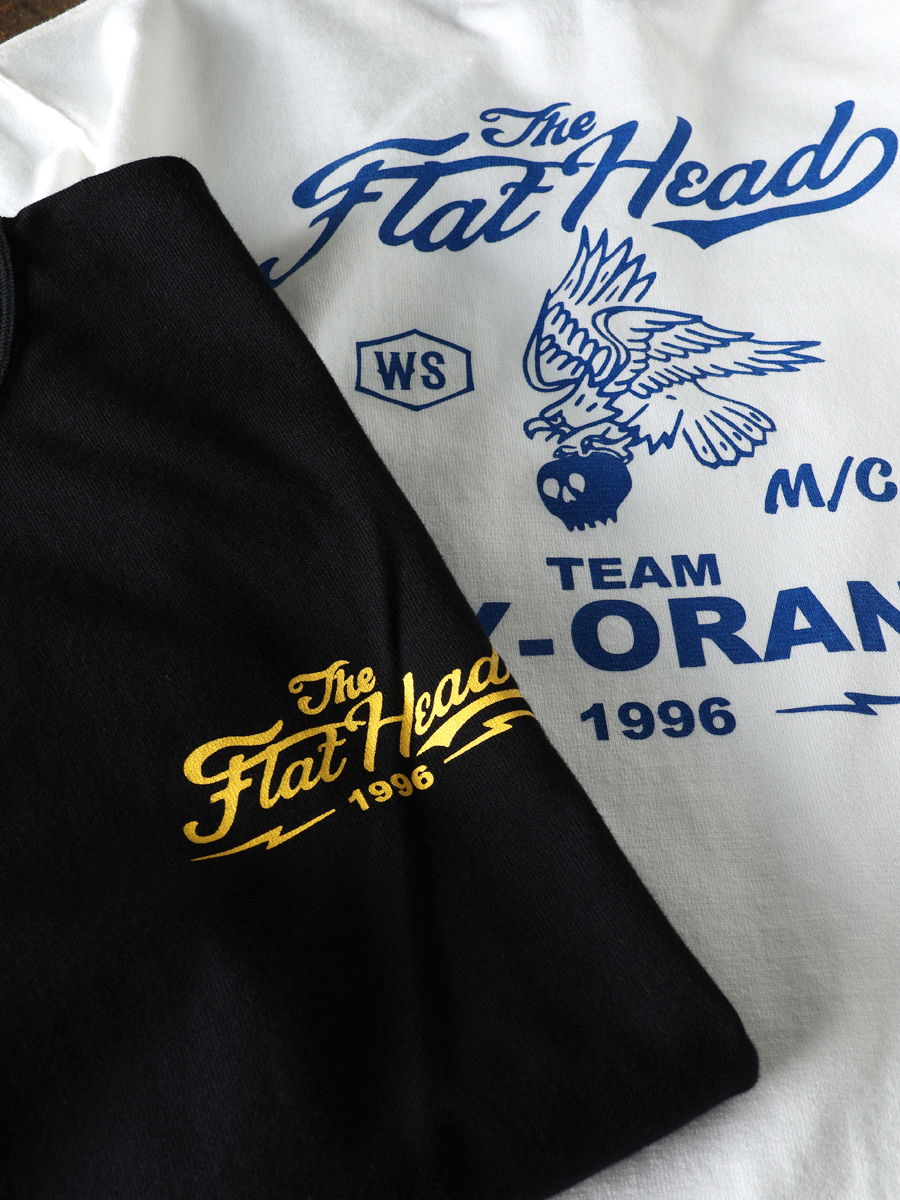 프린트는 아메리칸 바이커의 상징인 독수리와 해골 을 모티브로, 플랫헤드 브랜드의 아이덴티티를 팀 로고처럼 표현한 디자인입니다.