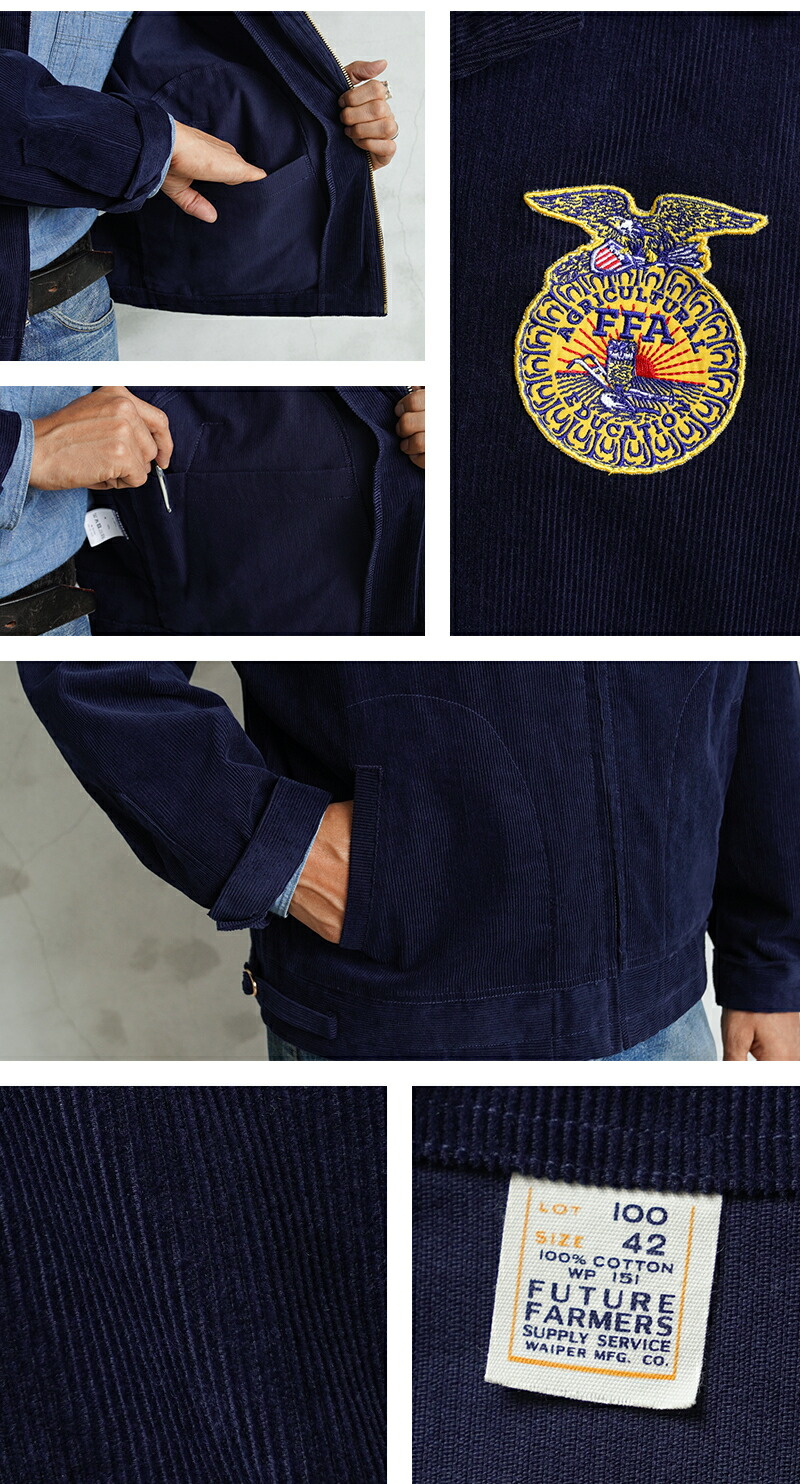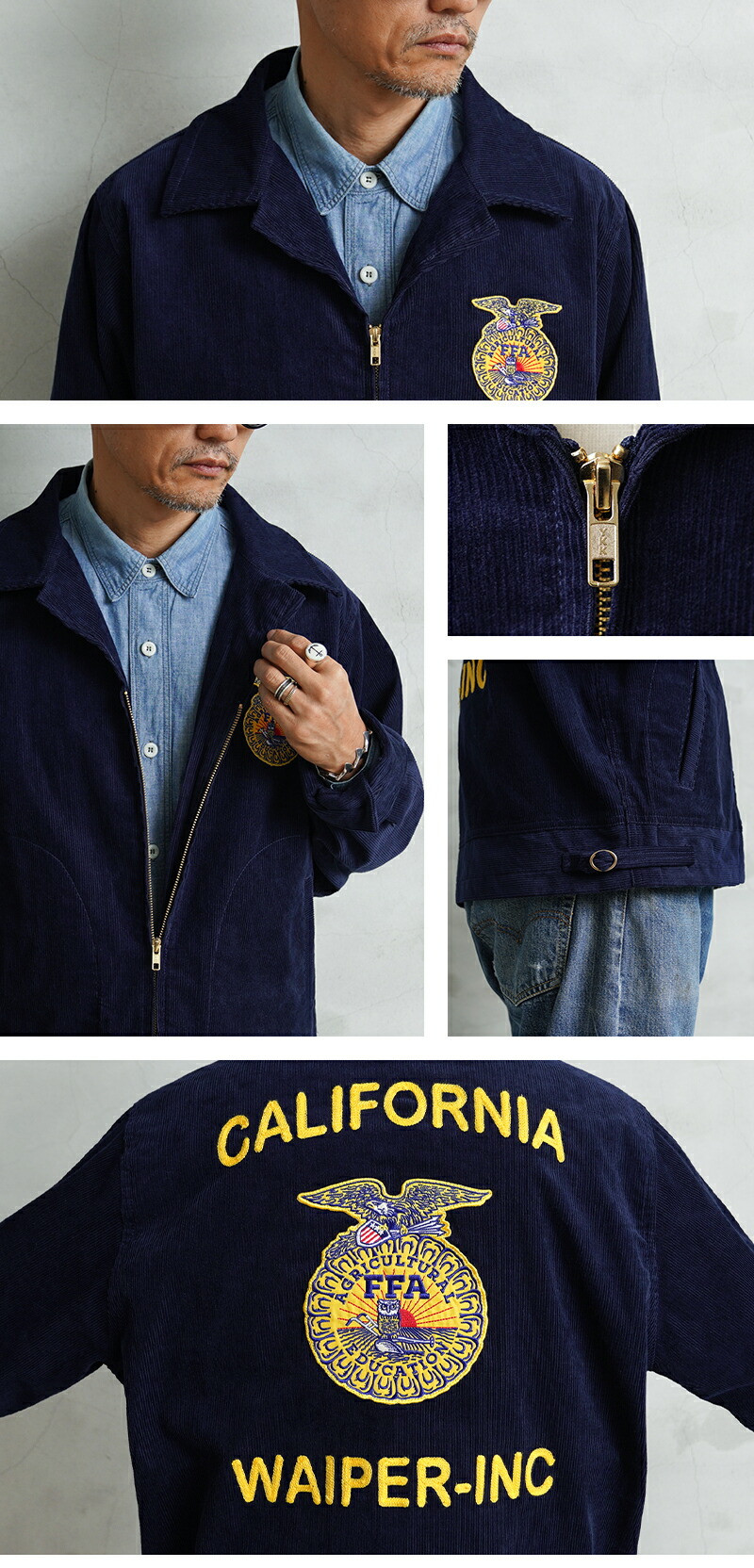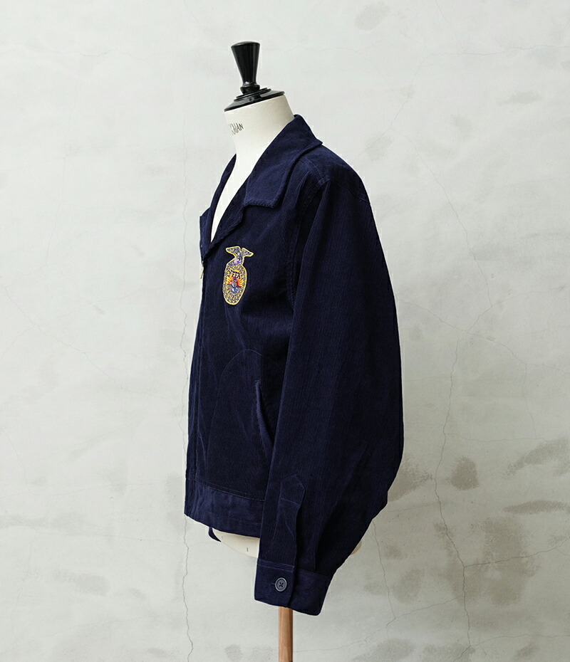미국의 농업 교육을 상징하는 학생 조직 FFA의 유니폼으로 알려진 재킷의 복각 제품입니다. 고급스러운 네이비 블루 코듀로이 소재를 사용했으며,