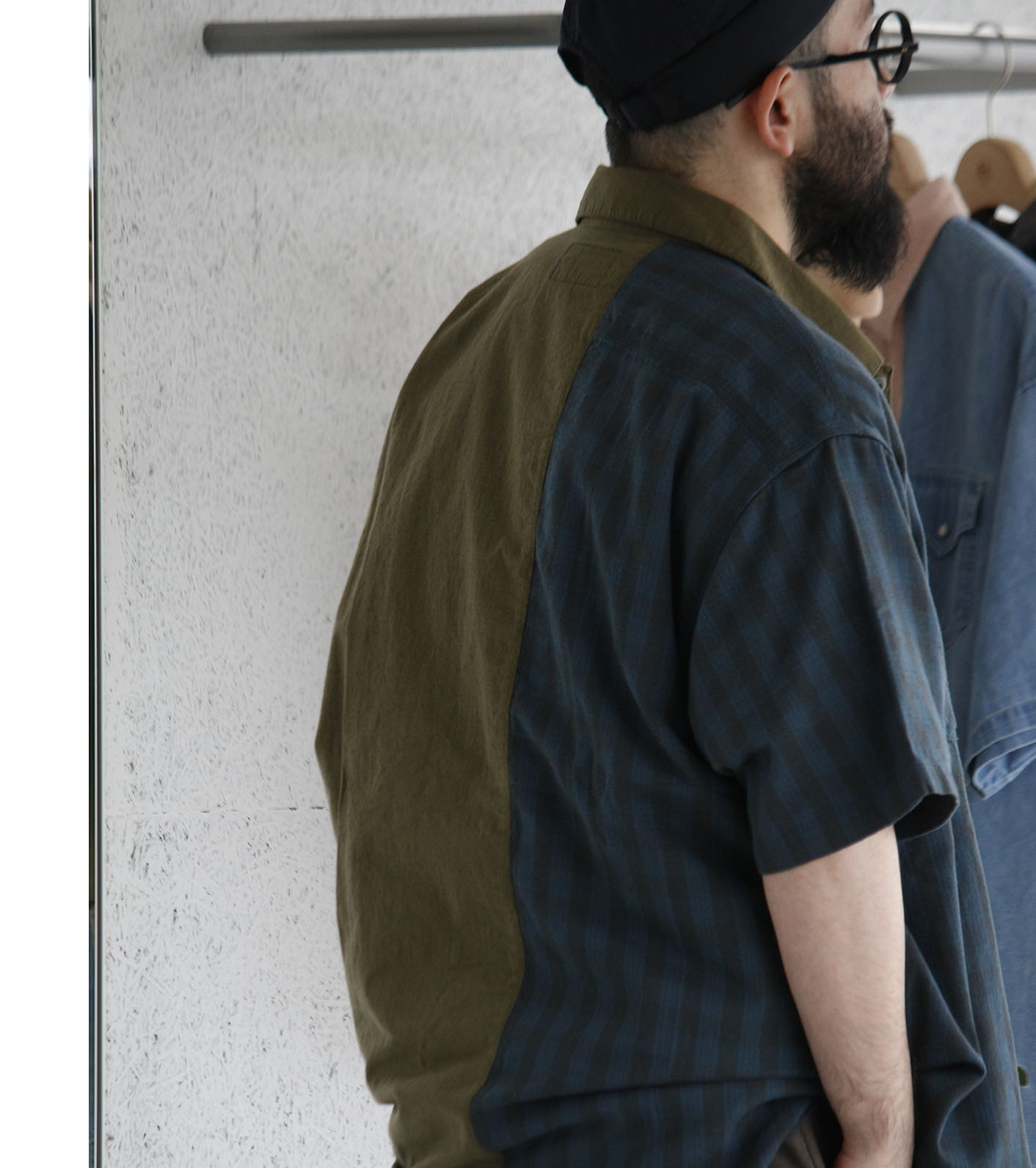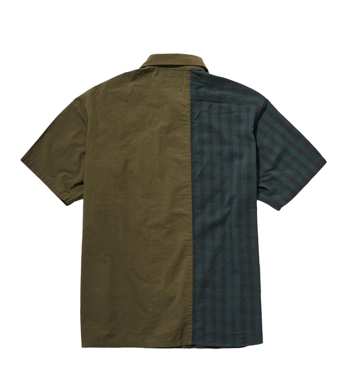 여러 원단을 조합한듯한 디자인의 반팔 셔츠