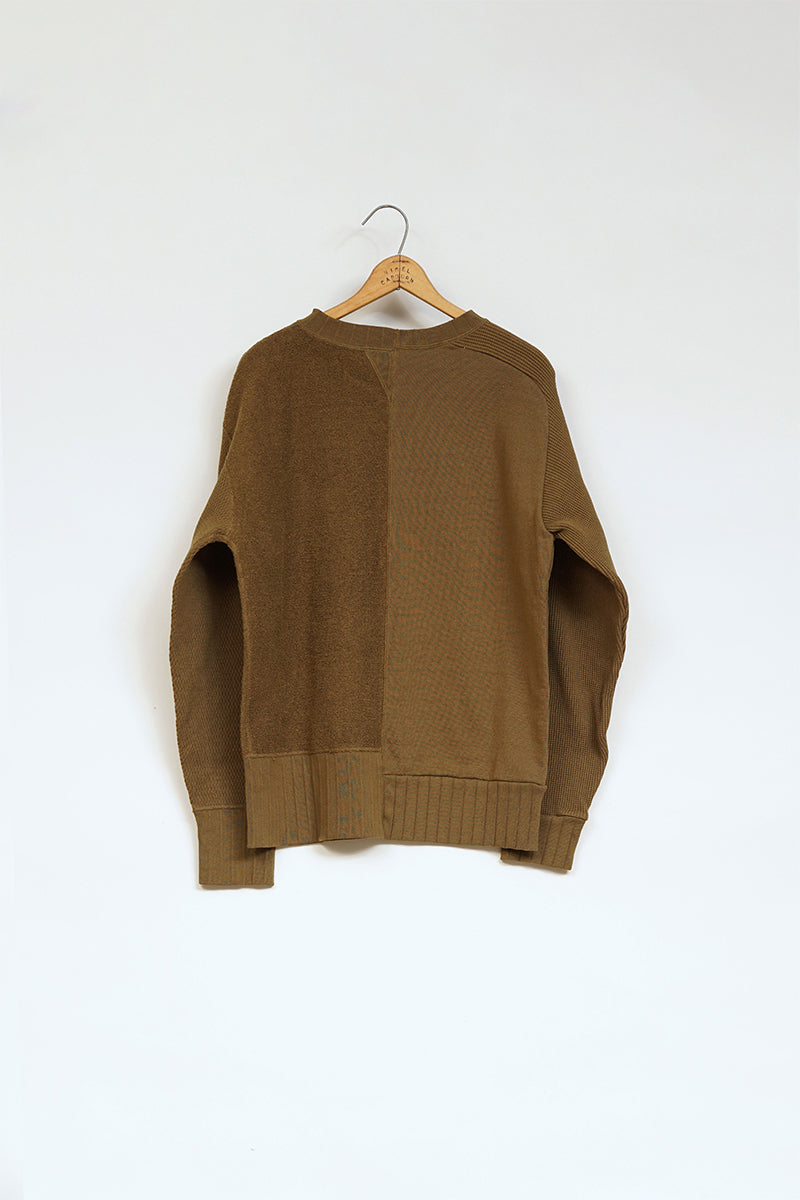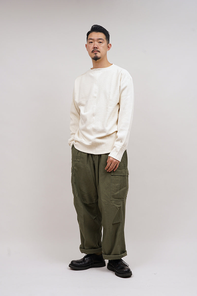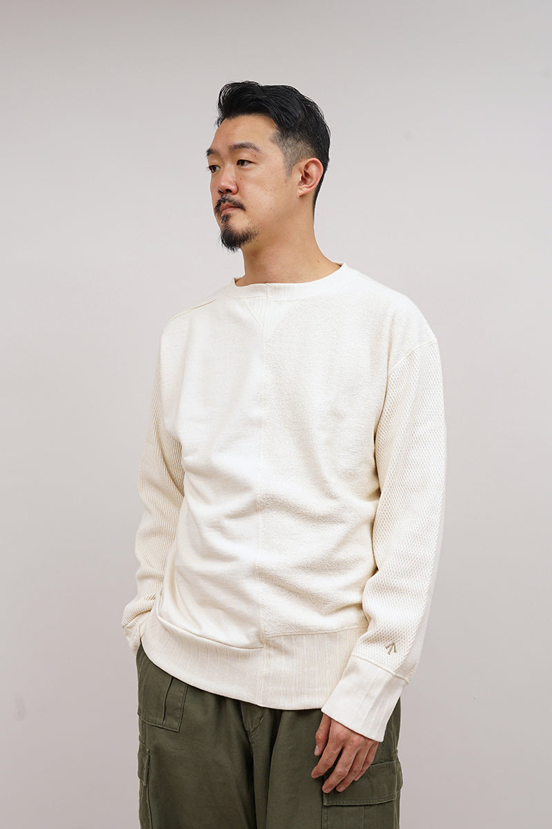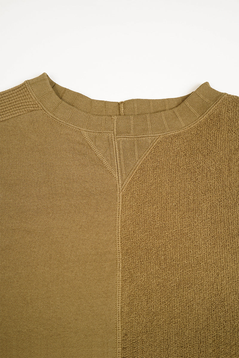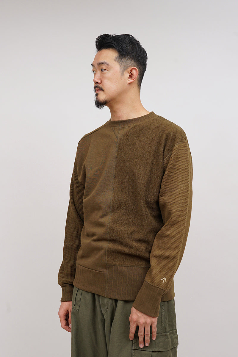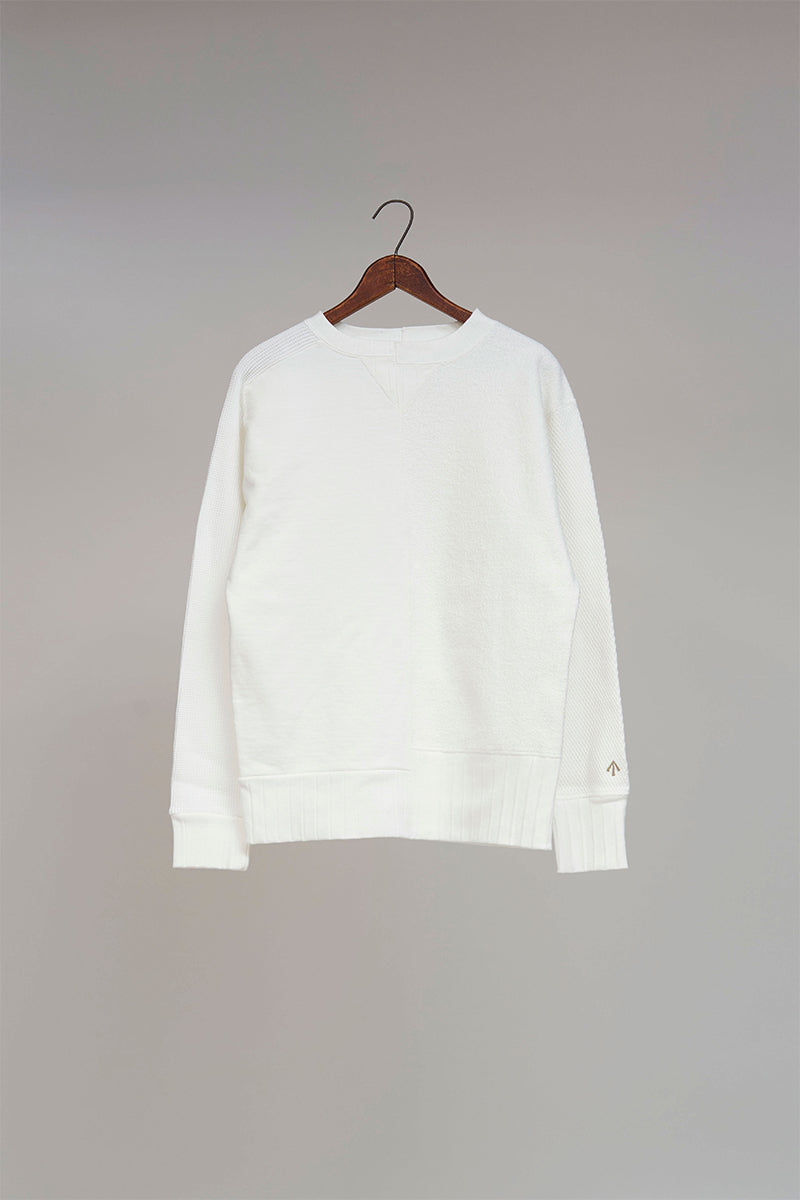 영국 육군에서 사용되던 트레이닝 웨어를 기반으로 디자인되었습니다. 오른쪽 몸판은 1930년대, 왼쪽 몸판은 1940년대 디자인을 충실히 재현하여, 서로 다른 시대의 사양을 과감하게 중앙에서 이어 붙인 독창적인 아이템입니다.