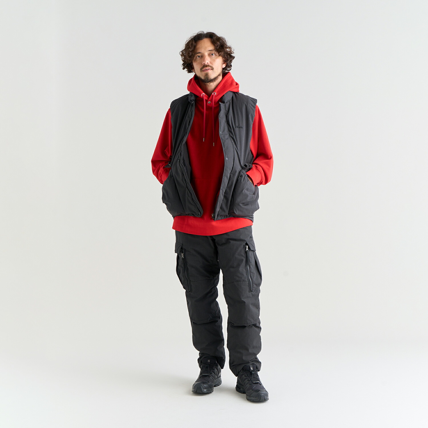 기능적이면서 코튼 같은 질감입니다. 습기에 강하기 위해 UDD(초발수다운)을 사용했습니다. 전면과 사이드에 5개의 포켓이 있으며 허리 양쪽에 지퍼 개폐식 벤츠를 배치했습니다.