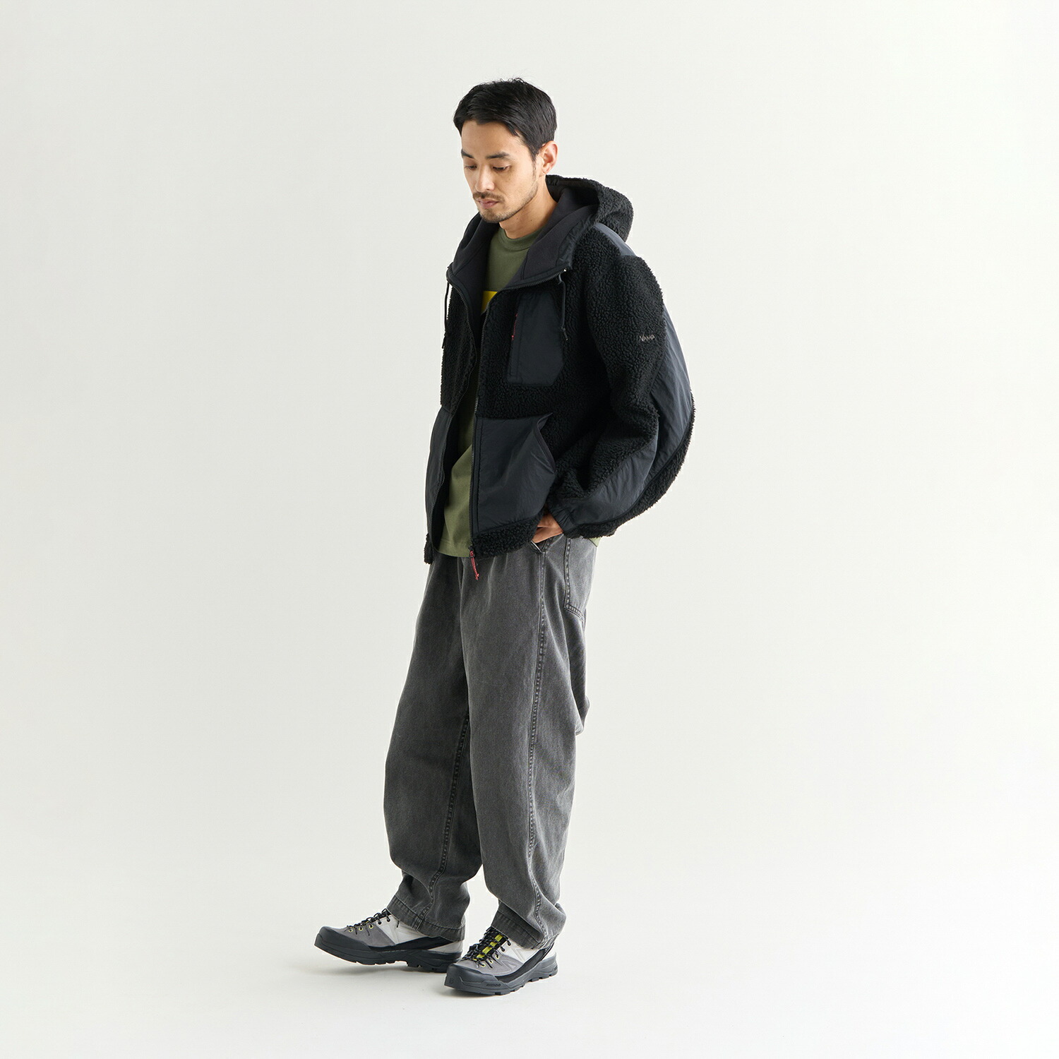 두께감이 있으면서도 부드러운 터치로 부해 보이지 않는 실루엣입니다. 어깨·팔꿈치·포켓 부분에는 발수·내마모성이 뛰어난 나일론 원단을 배치하여 오염과 마찰에 강하고, 아웃도어 활동 시에도 내구성을 보강했습니다.
