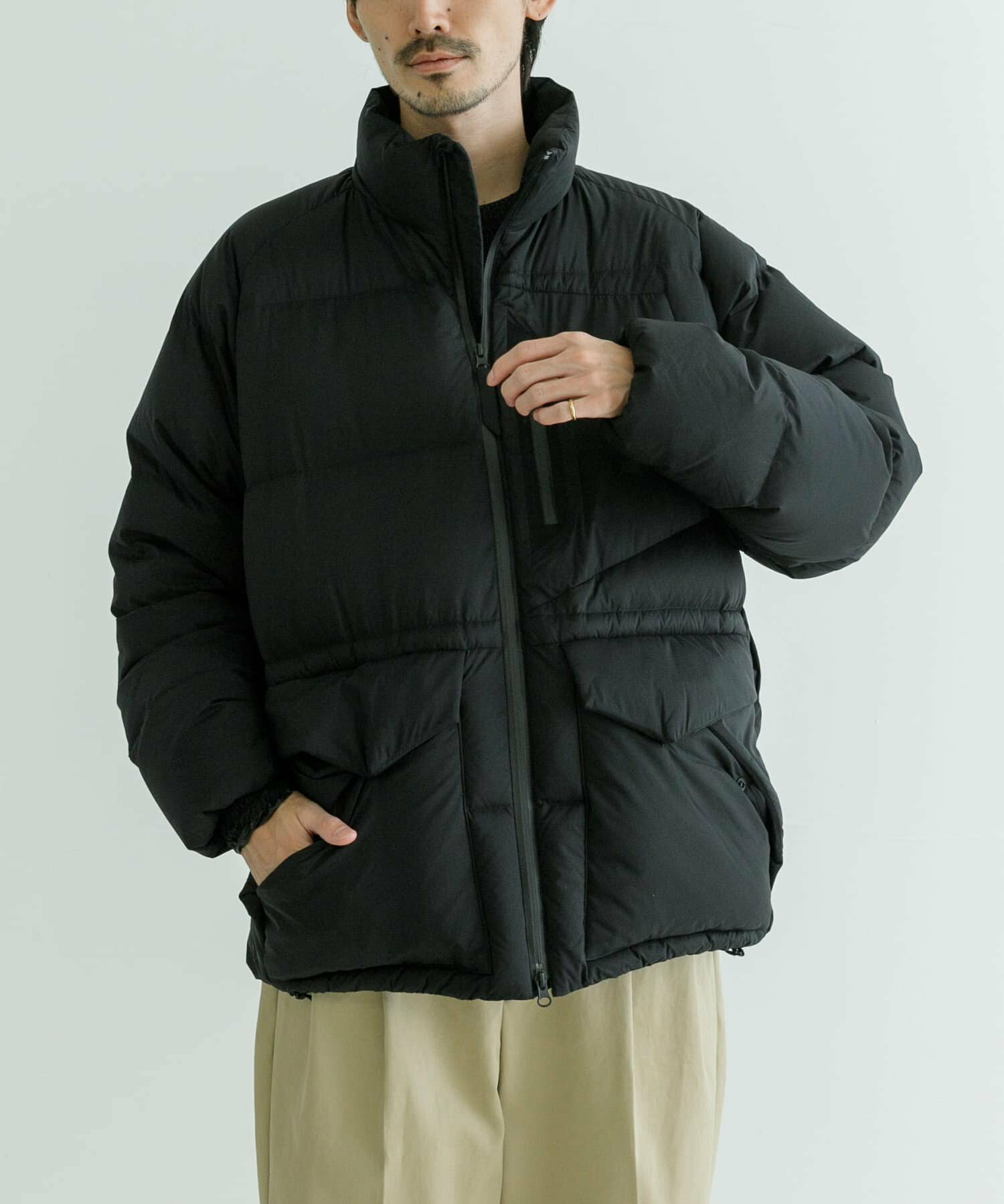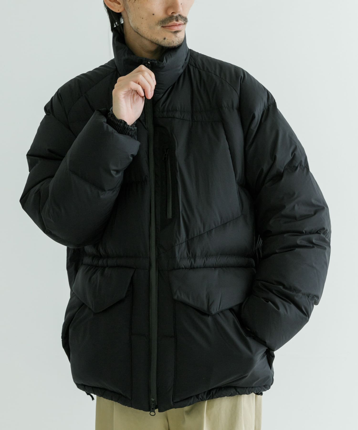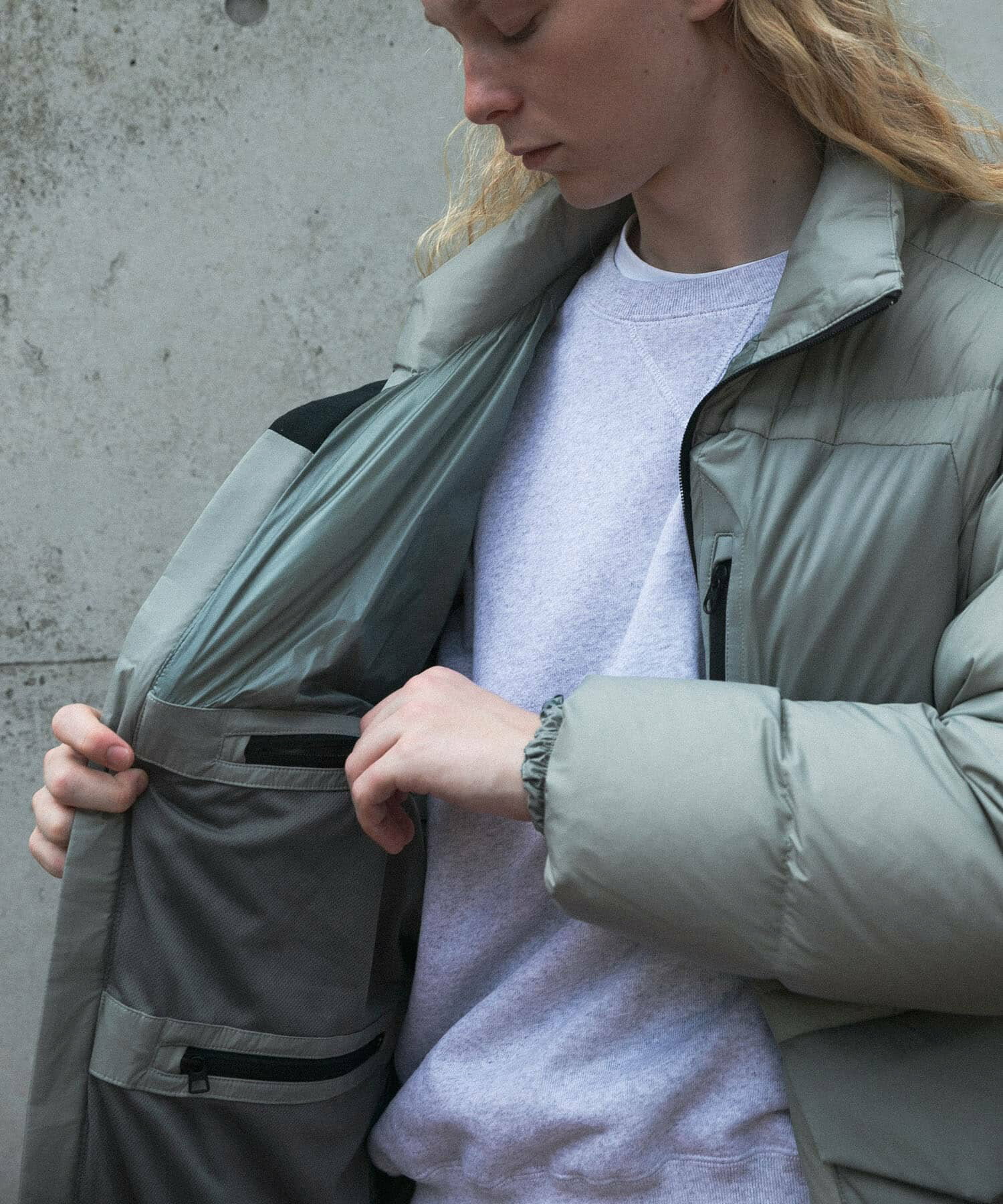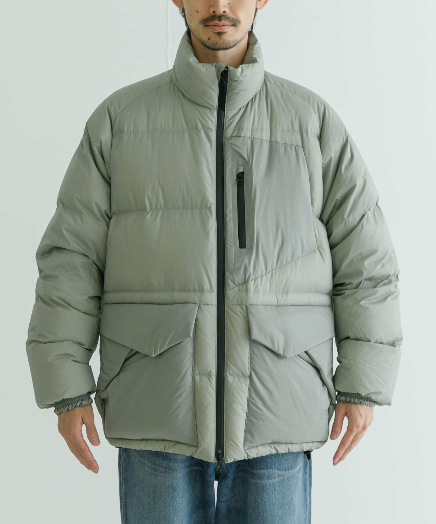 발수성, 보온성, 경량성이 뛰어난 하이 스펙 다운 재킷. 스탠드 칼라와 볼륨감 있는 디자인입니다. 부드럽고 가벼워 착용감이 좋습니다. 소맷단과 밑단은 셔링으로 차가운 공기의 침입을 방지합니다. 왼쪽 가슴에 방수 지퍼가 있는 포켓, 허리에 두개의 플랩 포켓이 있습니다.