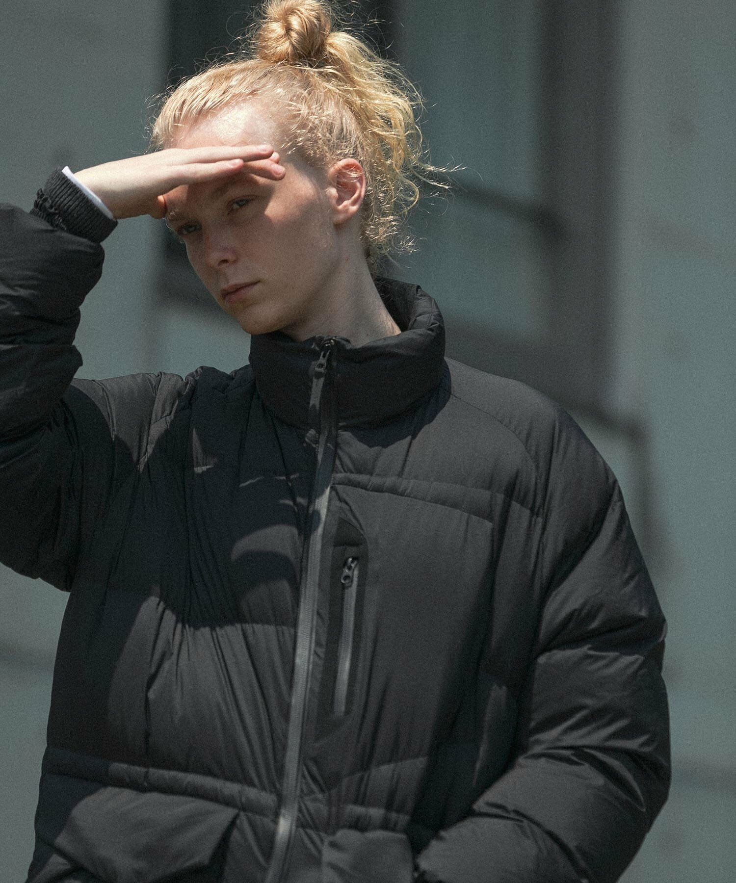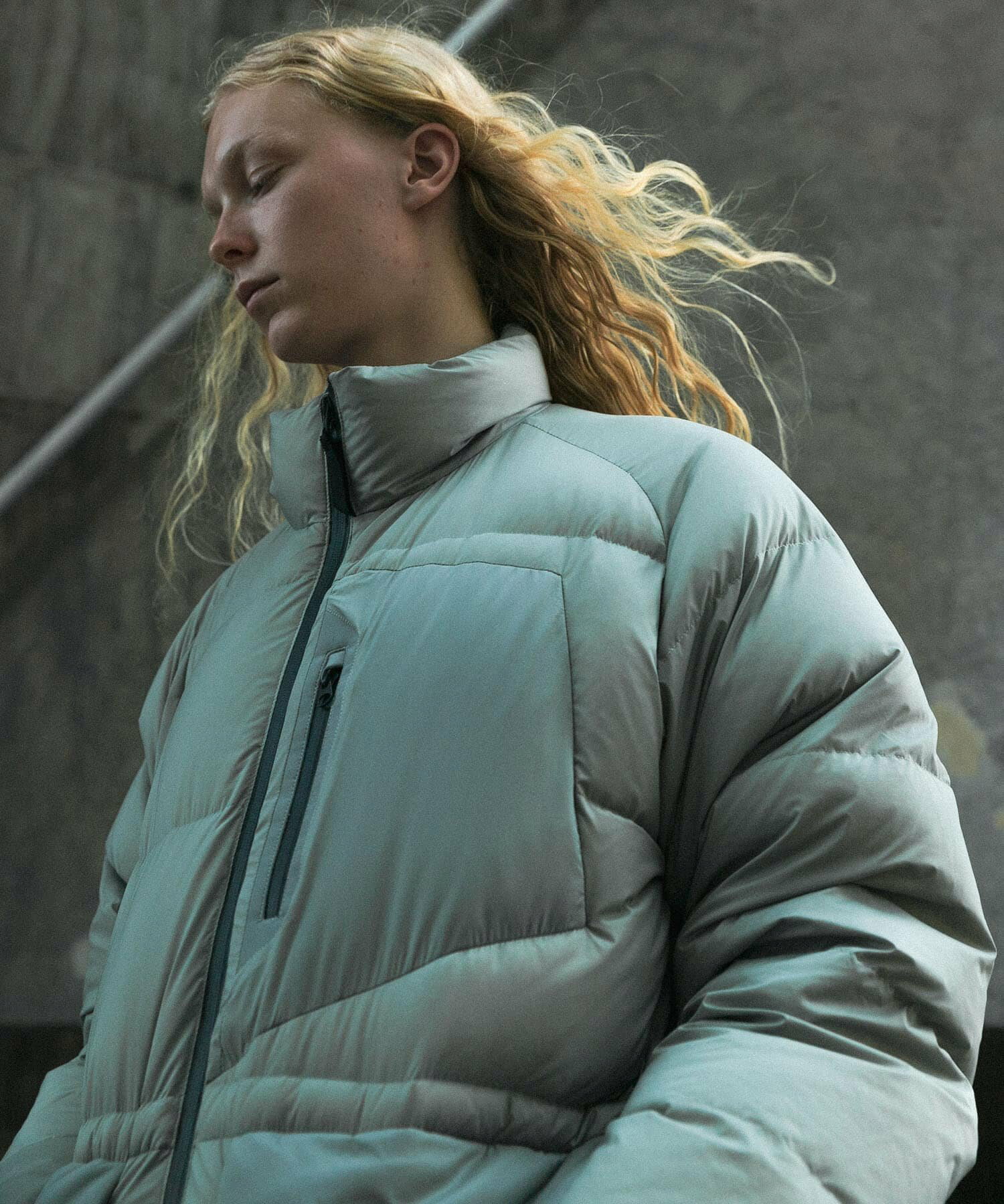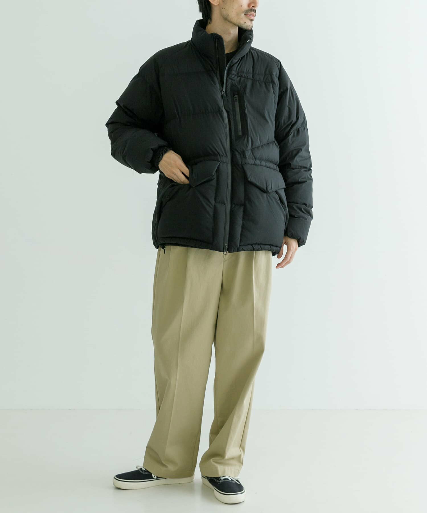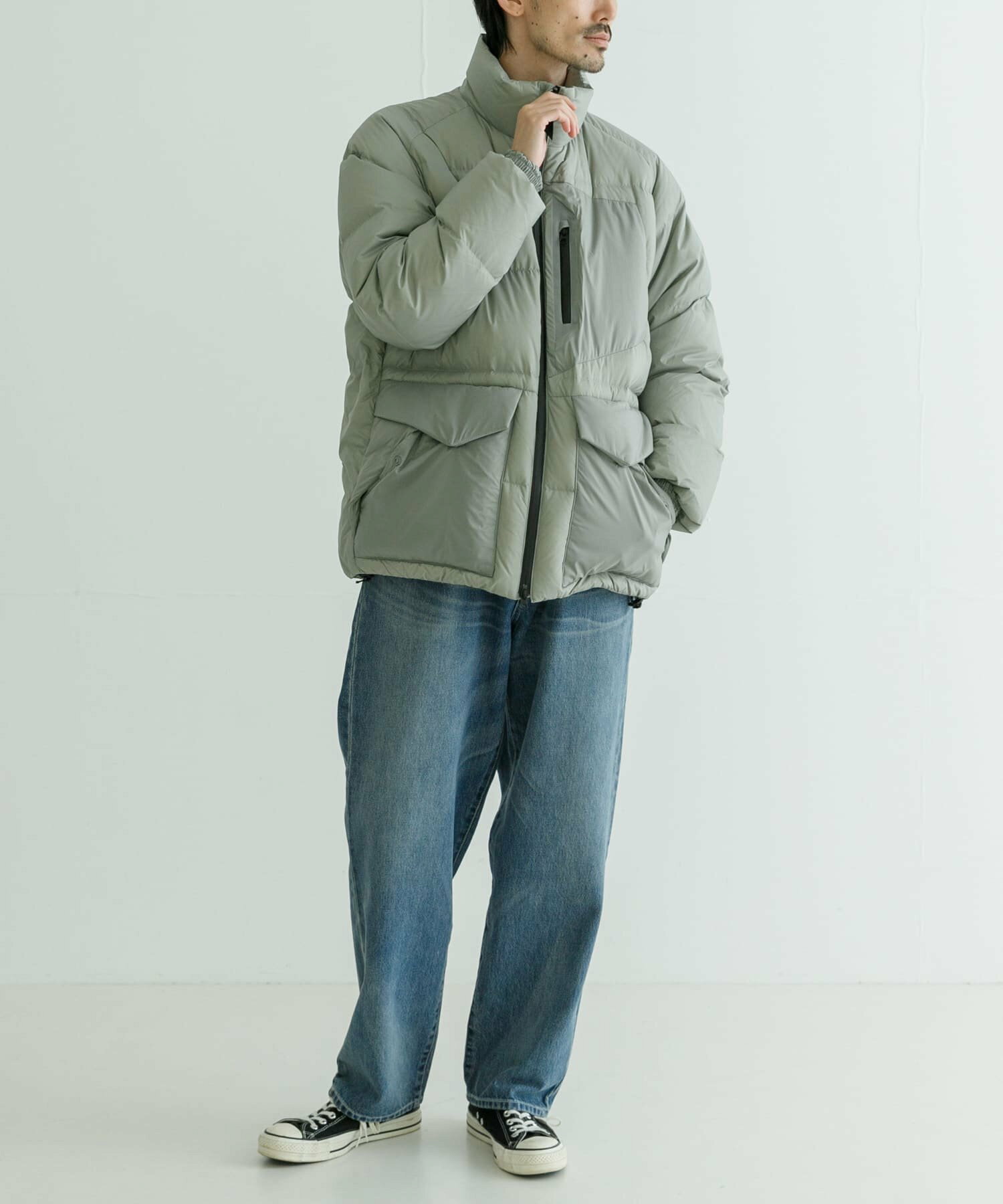 발수성, 보온성, 경량성이 뛰어난 하이 스펙 다운 재킷. 스탠드 칼라와 볼륨감 있는 디자인입니다. 부드럽고 가벼워 착용감이 좋습니다. 소맷단과 밑단은 셔링으로 차가운 공기의 침입을 방지합니다. 왼쪽 가슴에 방수 지퍼가 있는 포켓, 허리에 두개의 플랩 포켓이 있습니다.