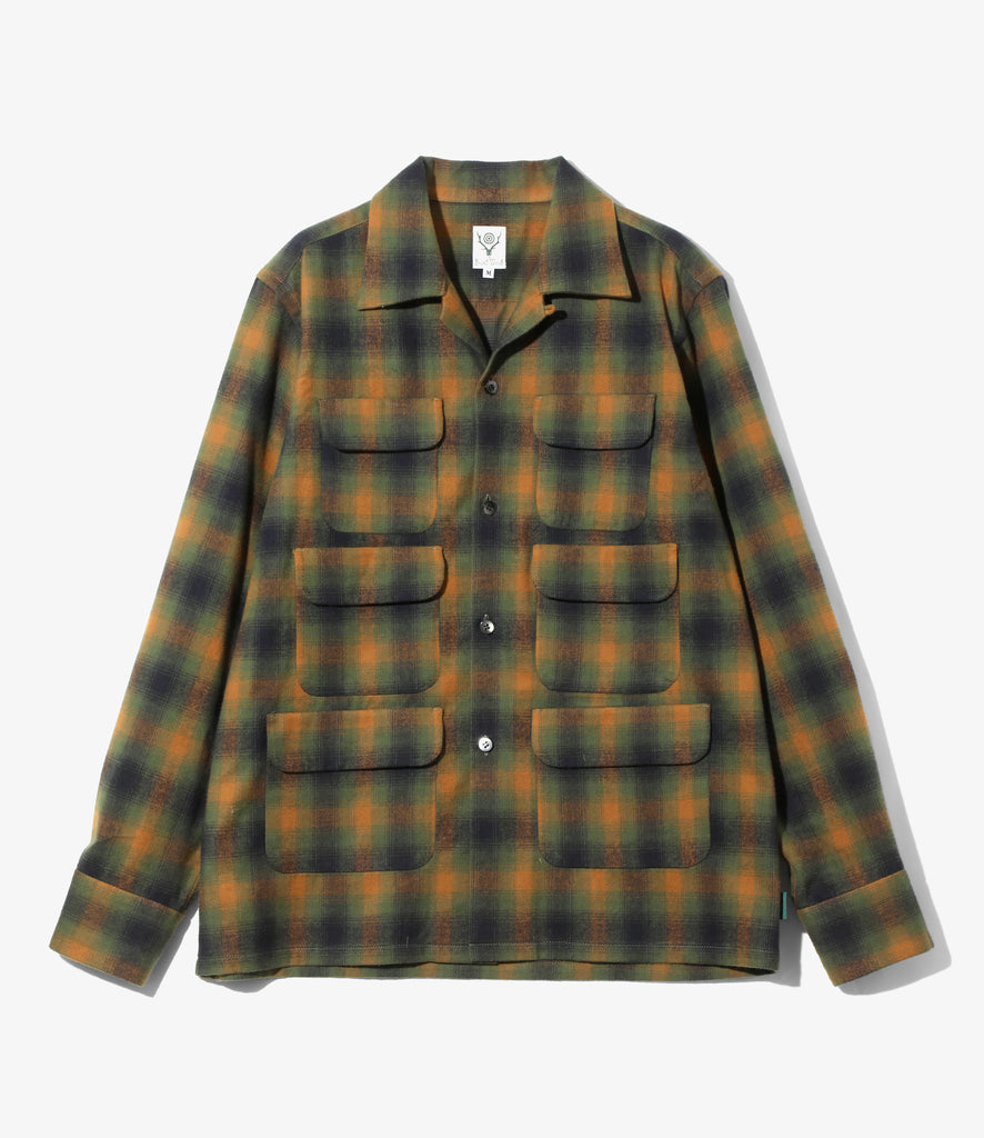 앞면에 2열의 3개 포켓, 총 6개의 포켓이 있는 셔츠. 캐주얼하고 개방적인 오픈 칼라 디자인입니다.
